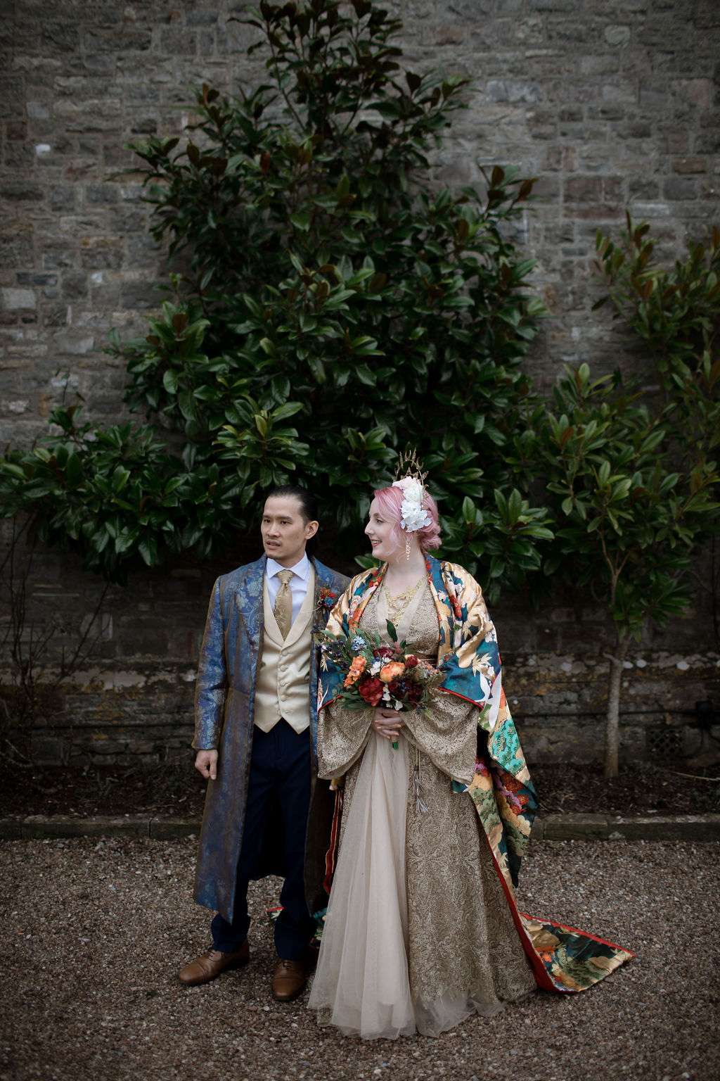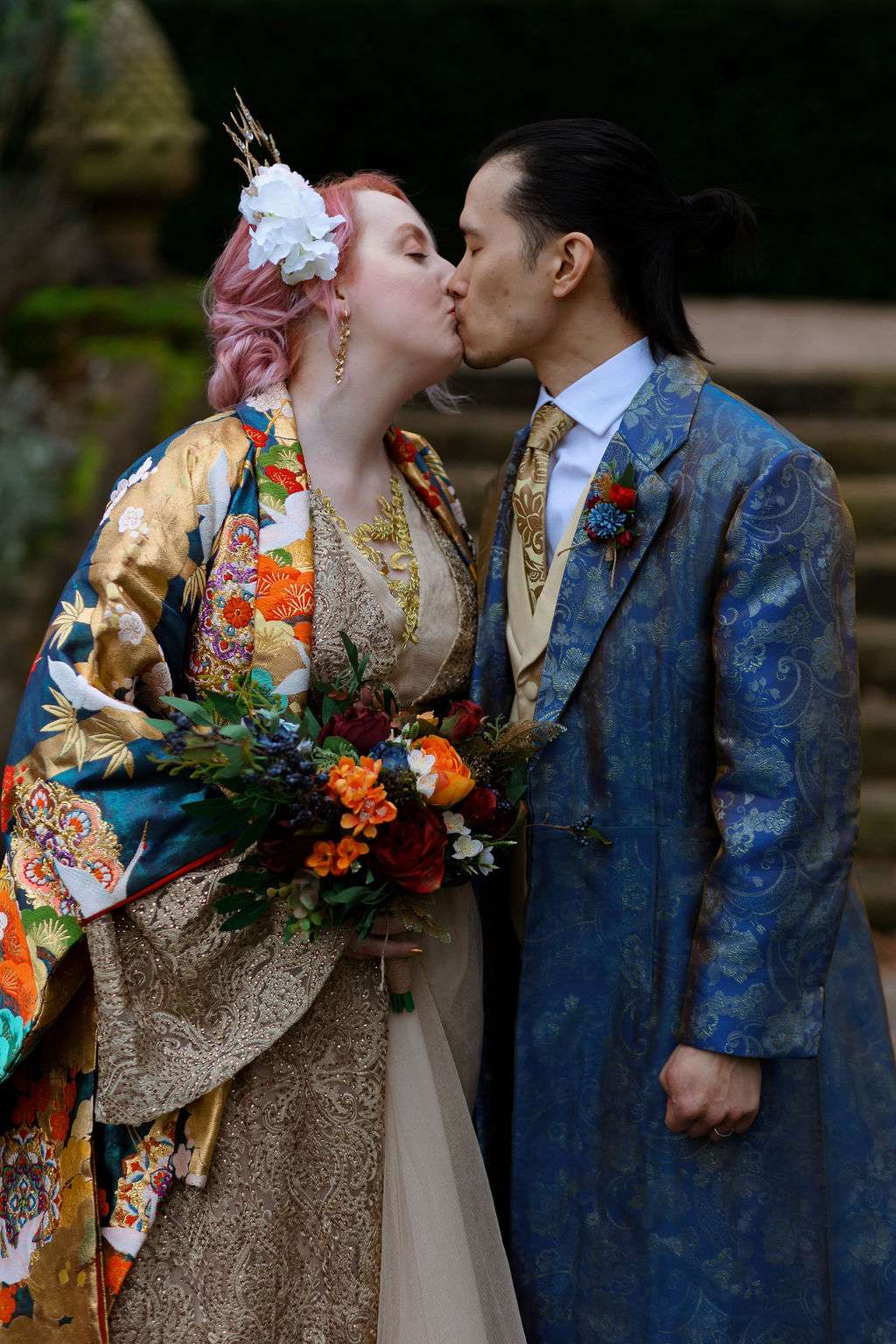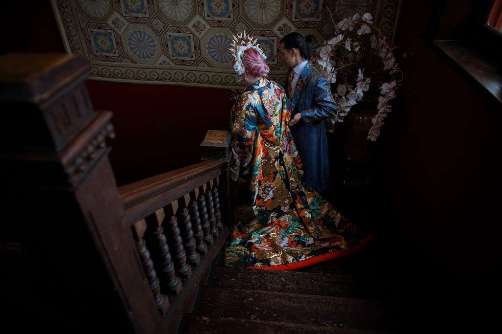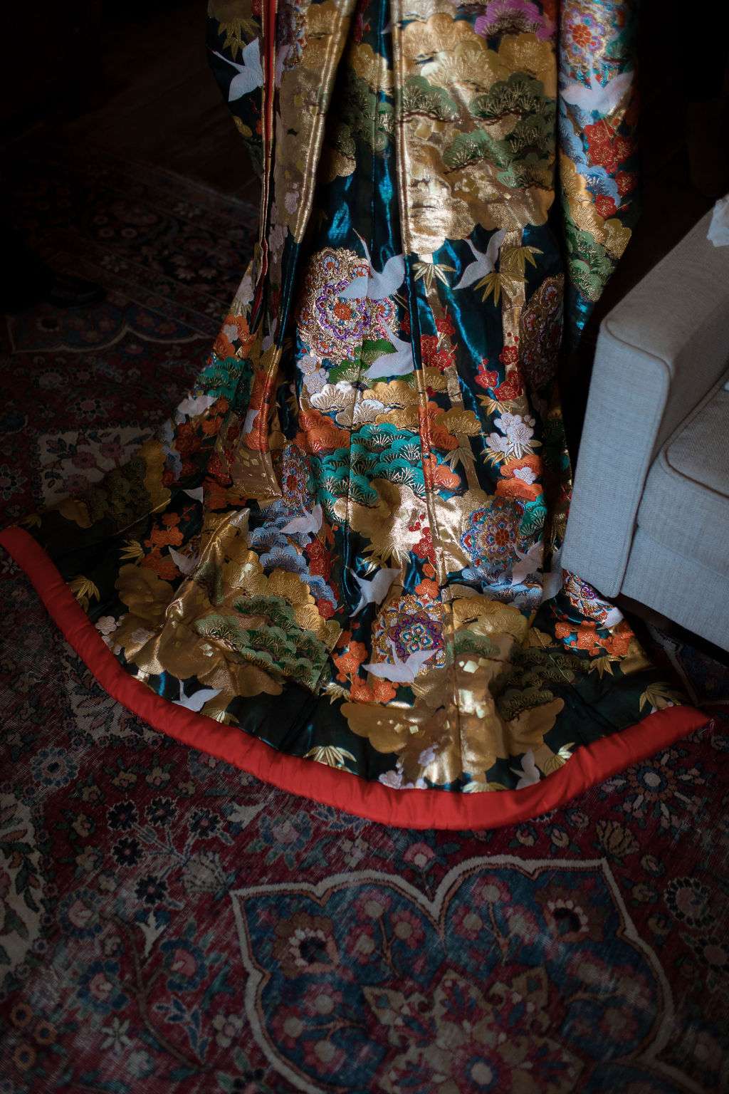 Choosing bright colours helped offset the gloomy winter weather and made for some beautiful photographs. The dress code for guests was ‘fabulous’ which indulged many of their guests who brought their colour and flair to the January weekend! The bride wore a nude Teuta Matoshi dress, off-set with a brightly coloured Japanese Uchikake wedding kimono.