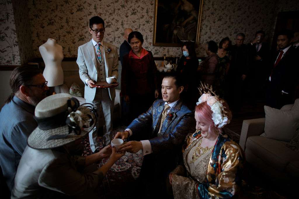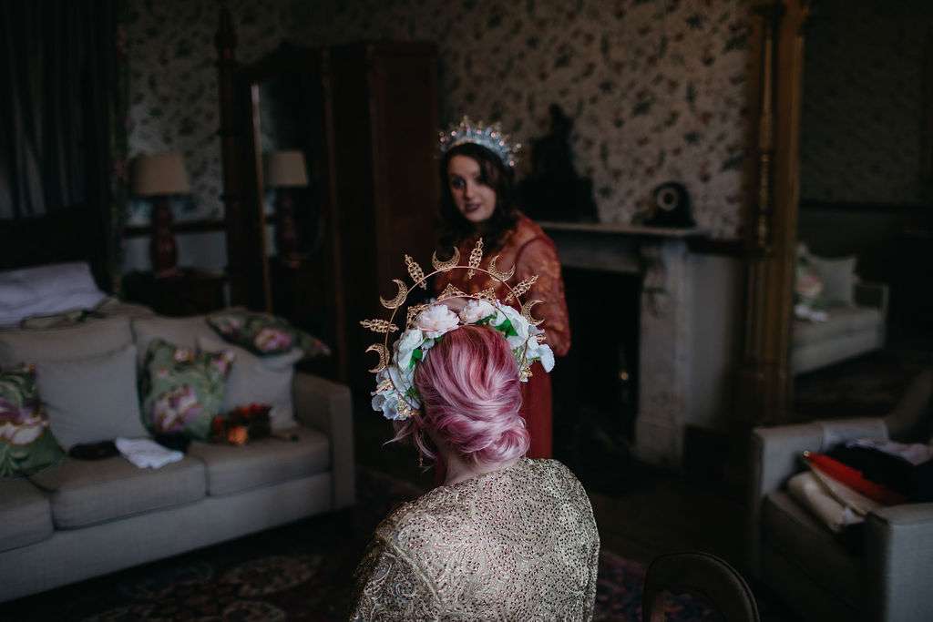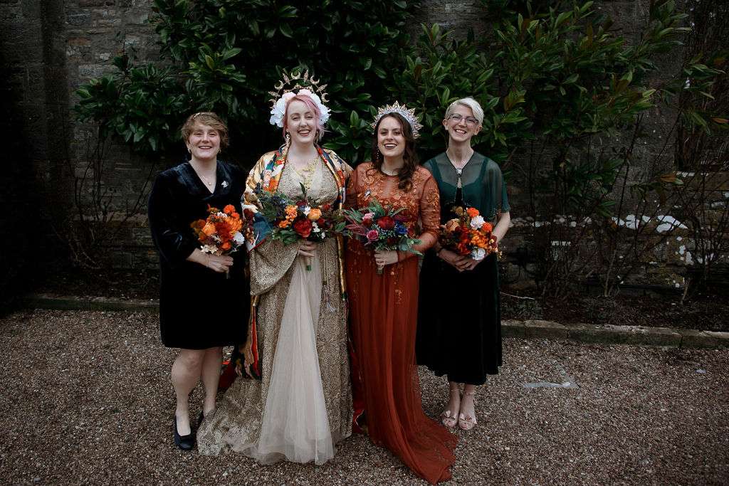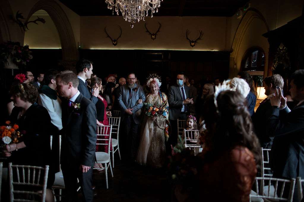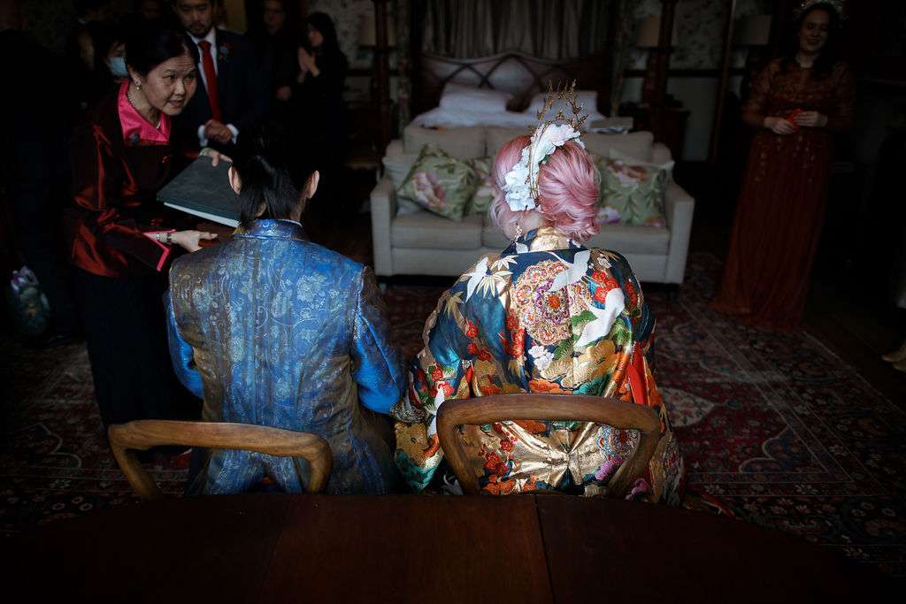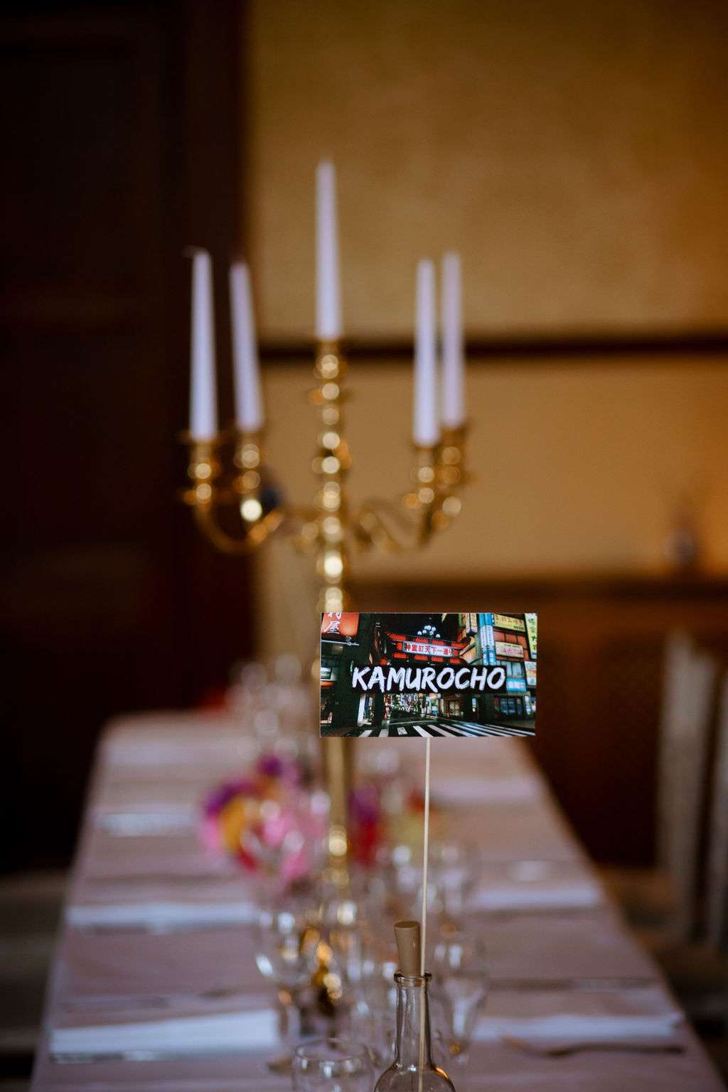 Choosing bright colours helped offset the gloomy winter weather and made for some beautiful photographs. The dress code for guests was ‘fabulous’ which indulged many of their guests who brought their colour and flair to the January weekend! The bride wore a nude Teuta Matoshi dress, off-set with a brightly coloured Japanese Uchikake wedding kimono.