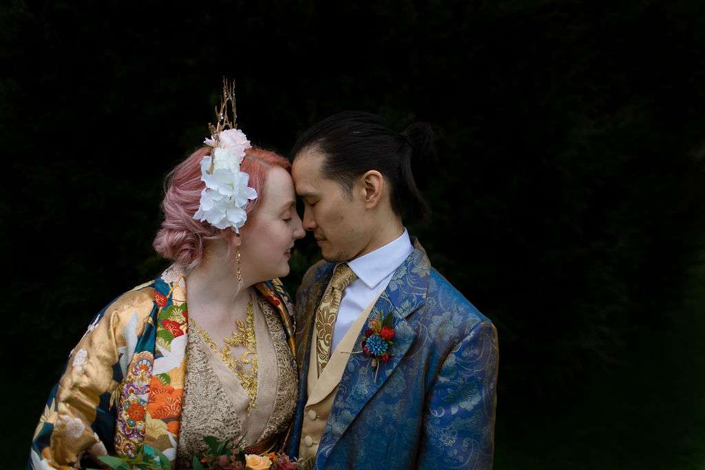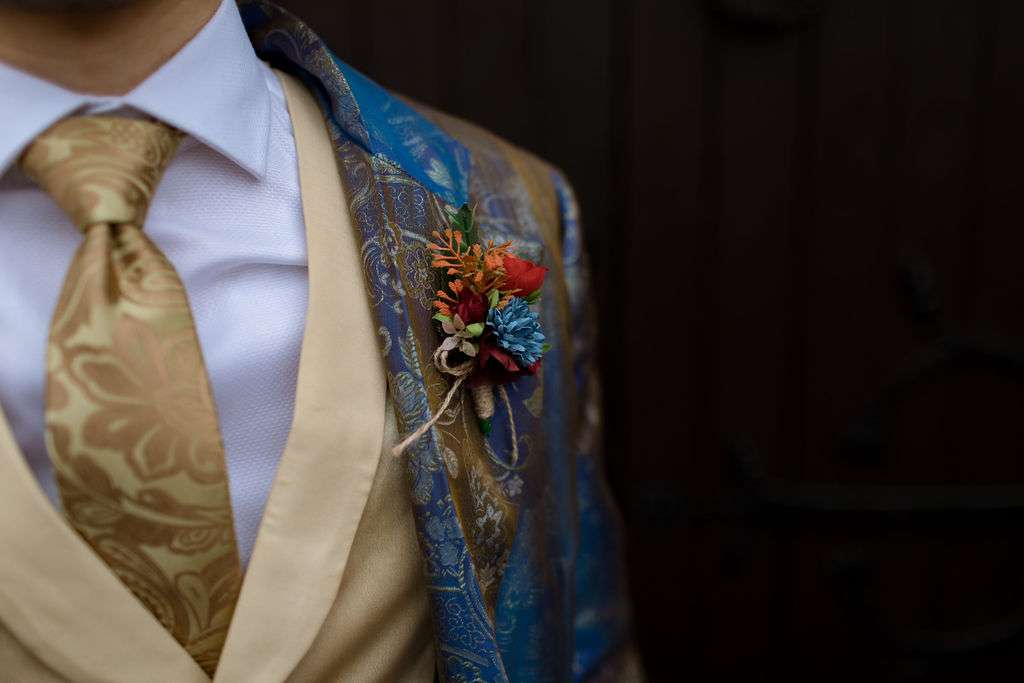 The groom wanted something totally unique and bespoke for his outfit too. He explains, “I always wanted my wedding outfit to be a bit ‘extra’. It started with me creating a gold satin shawl collar waistcoat based on my love of 3-piece suits. The back was donated from one of Steph’s old kimonos which featured a hand-painted crane bird and landscape. Steph came up with the idea of my outfit having lights based on inspiration from Claire Danes’ 2016 Met Gala dress. I designed a long, pleated coat that would work for the day and the evening; the main design was a gold/silver brocade on royal blue fabric with a blue/gold silk organza on top. This layer disguised the netting in-between which I hand-wove 150 meters of fibre optic strands throughout that flowed from my shoulders down to the skirt of the coat. The strands were put into bundles and attached to a 3D printed lighting harness that housed strips of addressable RGB LEDs connected to an Arduino board inside the lining. After learning Python coding language, I programmed custom lighting animations to reveal an Aurora Borealis effect to our unsuspecting guests in the evening!”