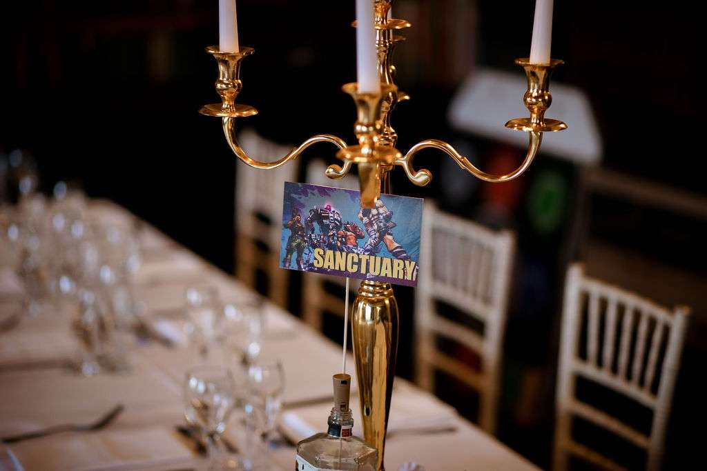 They used locations from their favourite video games for the table names and put fairy lights in empty bottles of their favourite drinks on the tables. They also made Chiok’s coat and the cufflinks which he gifted to the groomsmen. They were styled on the WASD keyboard keys as they all play games together and cast in pewter.