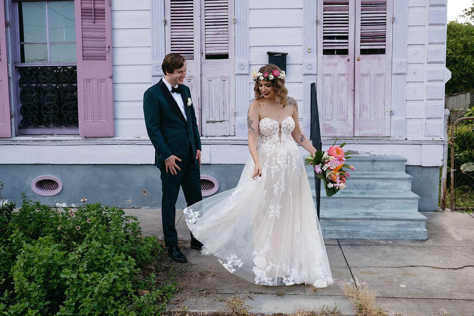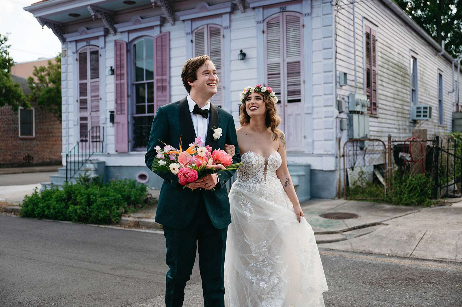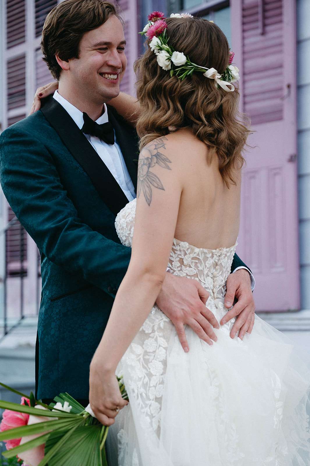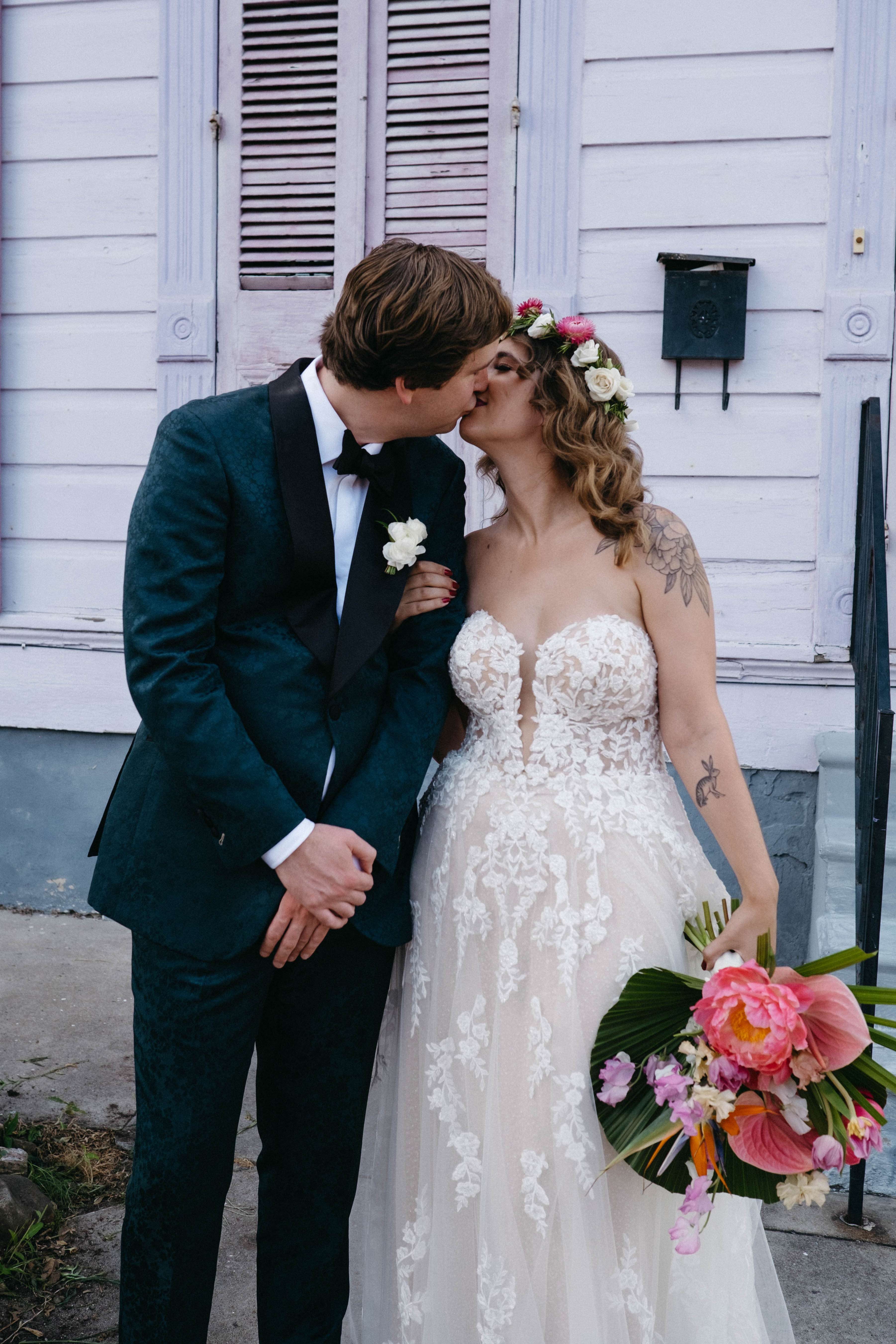 Tropical florals, pies instead of a cake, a dinosaur cake topper and bridesmaid robes made out of vintage, sustainable fabric were just a few of the things which made Julia and Daniel’s wedding feel very ‘them’. The couple, who met through a mutual friend, were married in New Orleans in May.