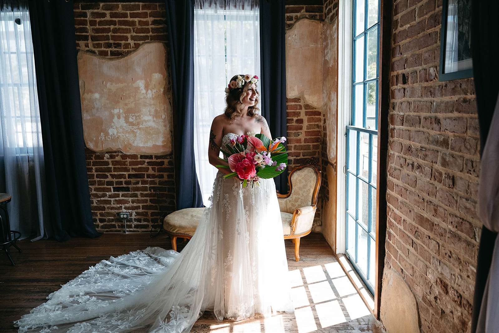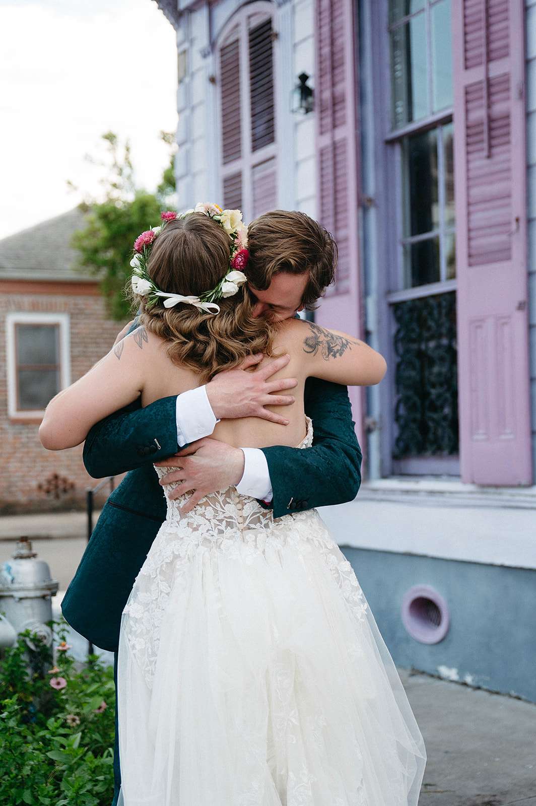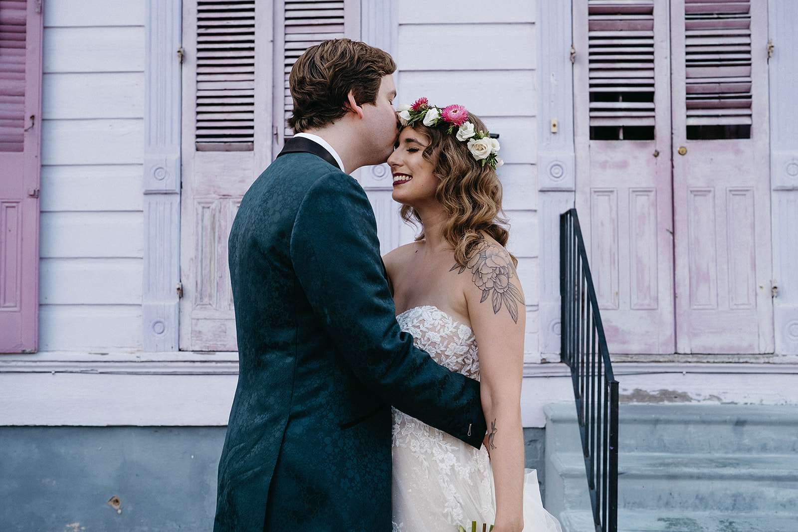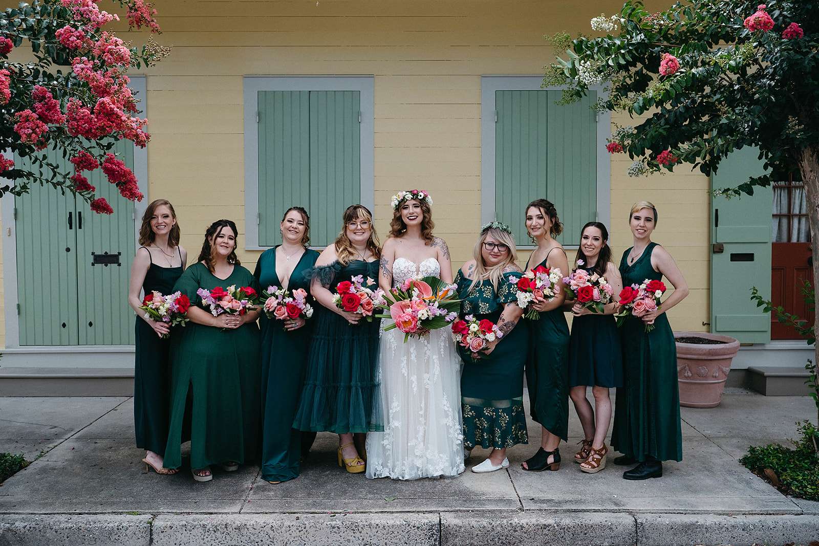 Tropical florals, pies instead of a cake, a dinosaur cake topper and bridesmaid robes made out of vintage, sustainable fabric were just a few of the things which made Julia and Daniel’s wedding feel very ‘them’. The couple, who met through a mutual friend, were married in New Orleans in May.