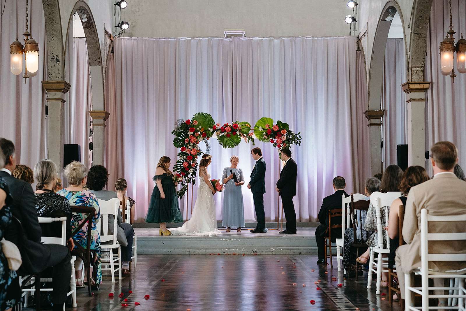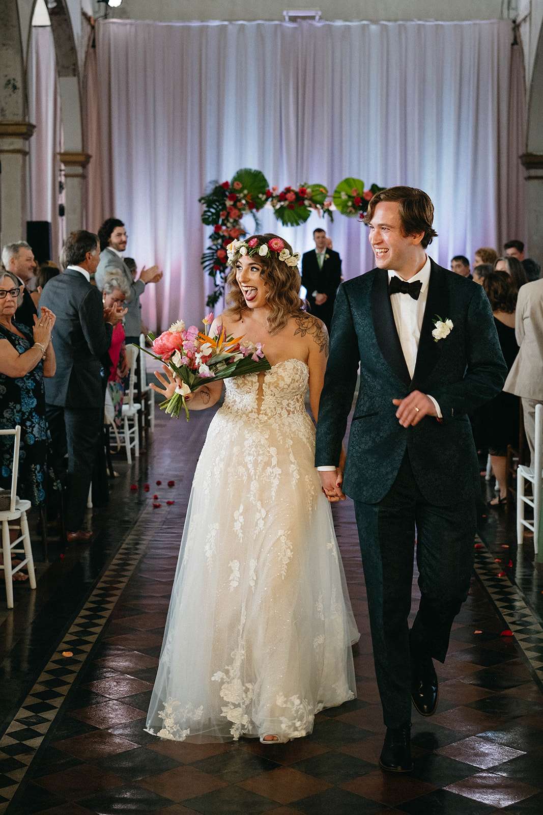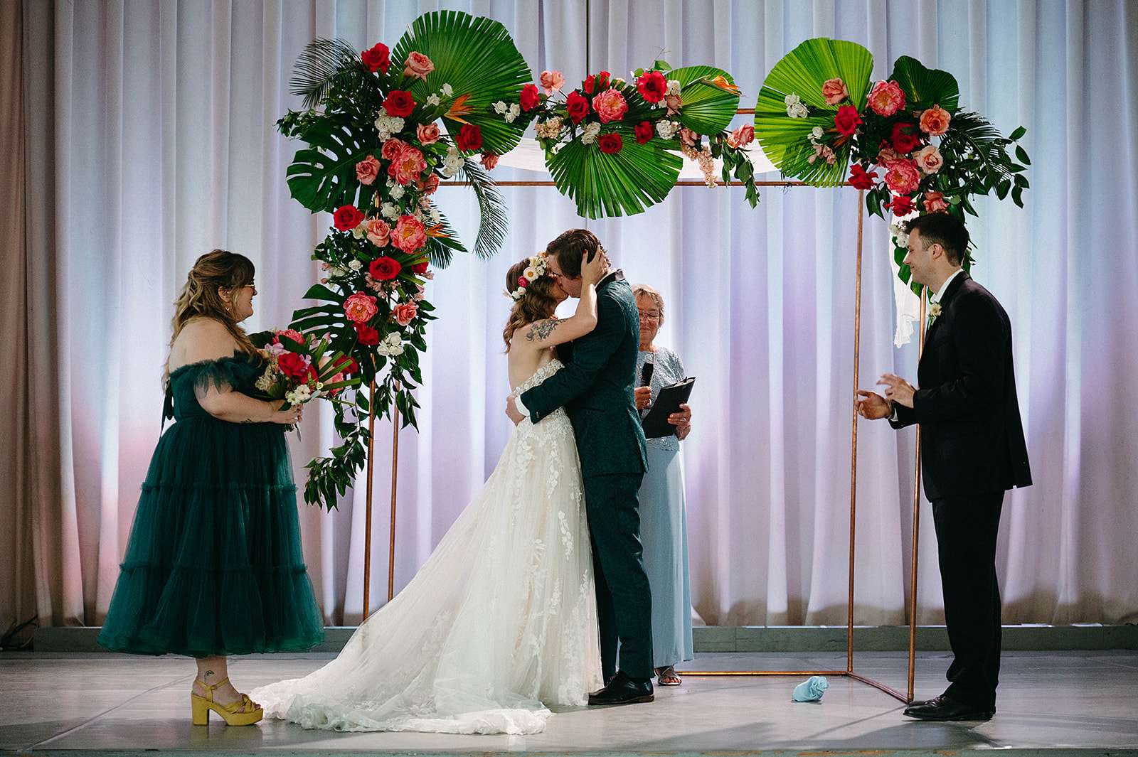 The Jewish ceremony was led by the bride’s godmother and was held udder a chuppah decorated in the same tropical flowers and greenery, The bridal party and Daniel walked in with both his parents to Al Green’s What a Wonderful Thing Love Is. “We also had two ‘grown-up’ friends be our flower people”, the bride continued. “They were both very over the top (which I think the pictures reflect) and it was perfect! I walked in with both my parents to Edith Piaf’s original La Vie En Rose. We wrote our own vows and then we kissed to Hot 8 Brass Band’s version of Sexual Healing!”