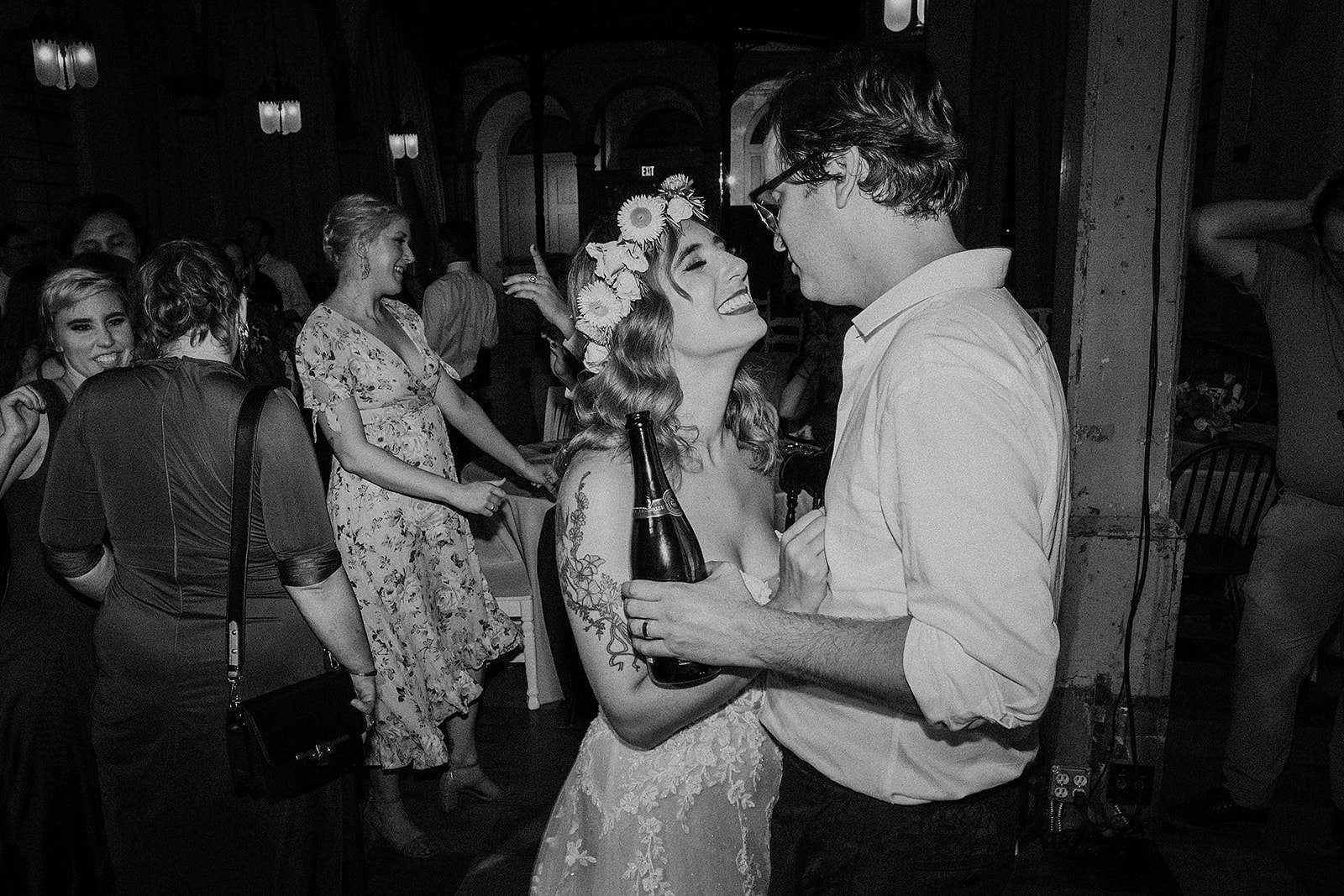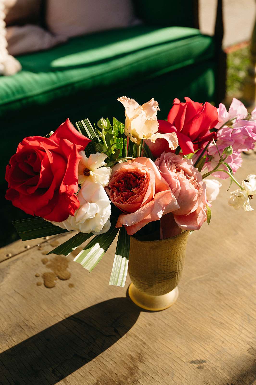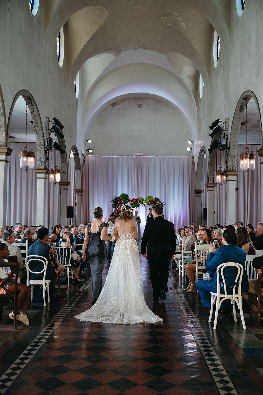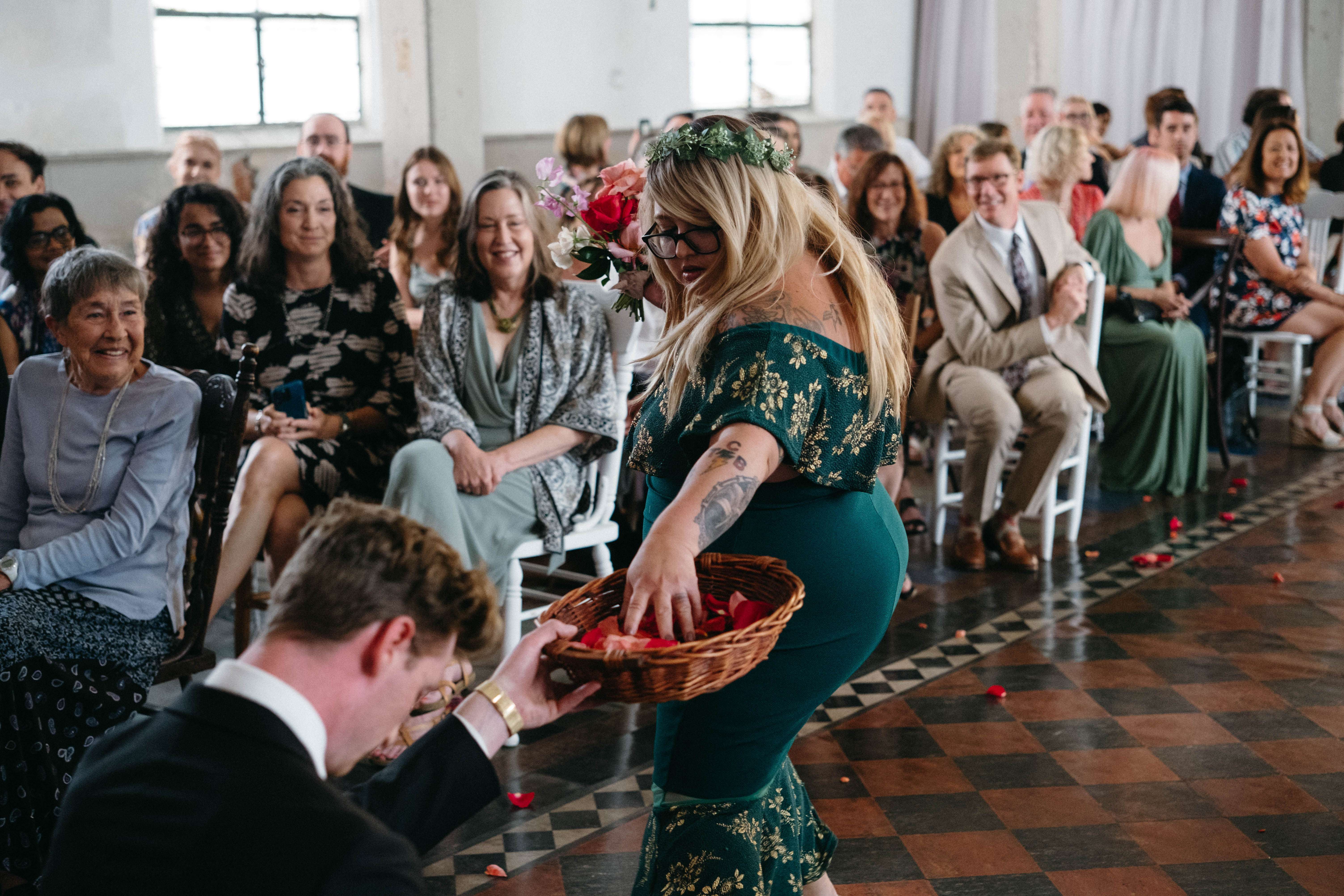 The Jewish ceremony was led by the bride’s godmother and was held udder a chuppah decorated in the same tropical flowers and greenery, The bridal party and Daniel walked in with both his parents to Al Green’s What a Wonderful Thing Love Is. “We also had two ‘grown-up’ friends be our flower people”, the bride continued. “They were both very over the top (which I think the pictures reflect) and it was perfect! I walked in with both my parents to Edith Piaf’s original La Vie En Rose. We wrote our own vows and then we kissed to Hot 8 Brass Band’s version of Sexual Healing!”
