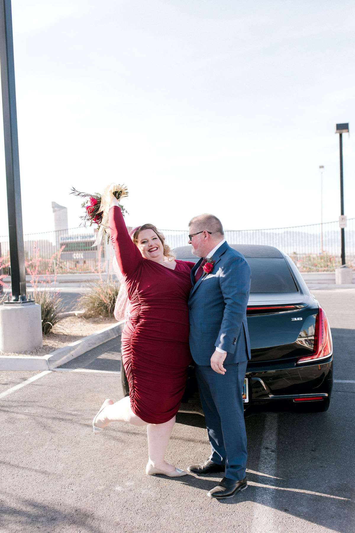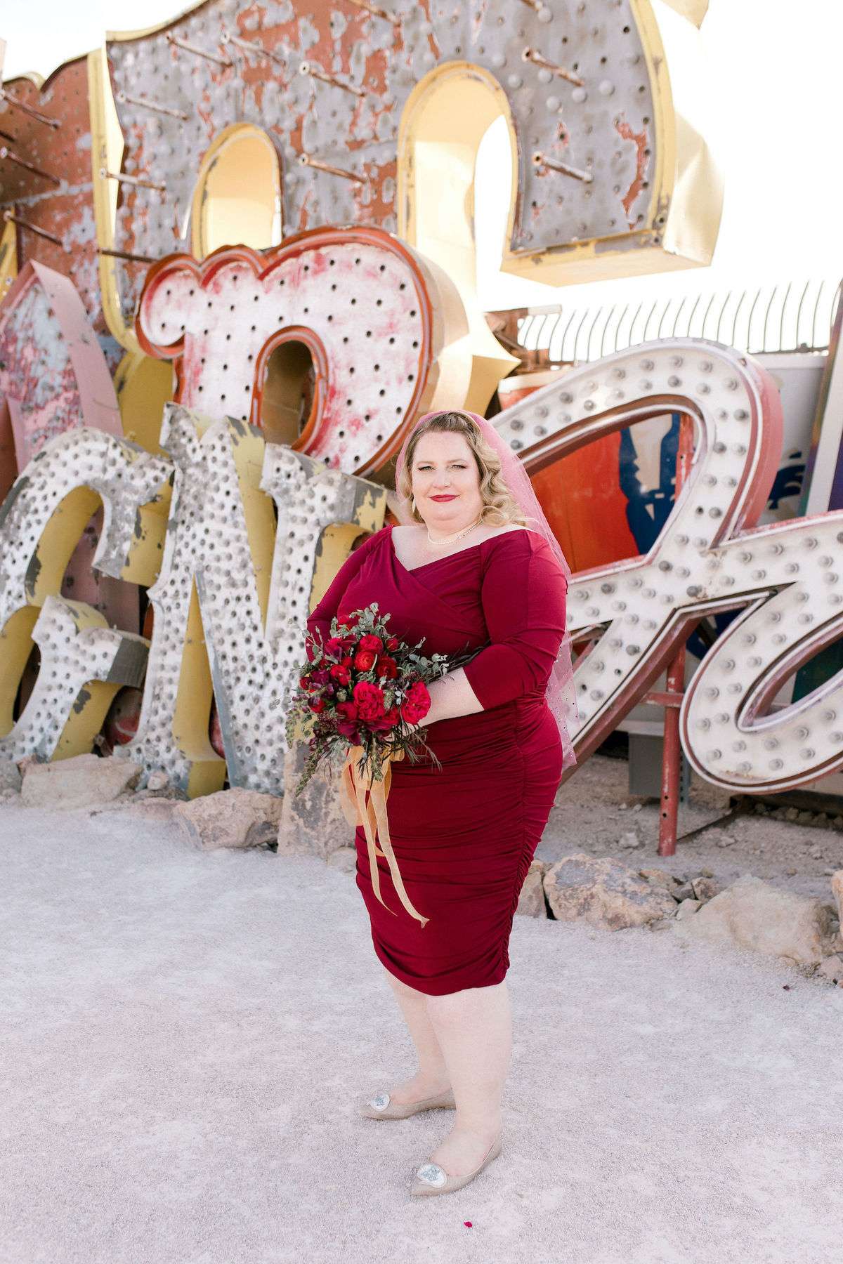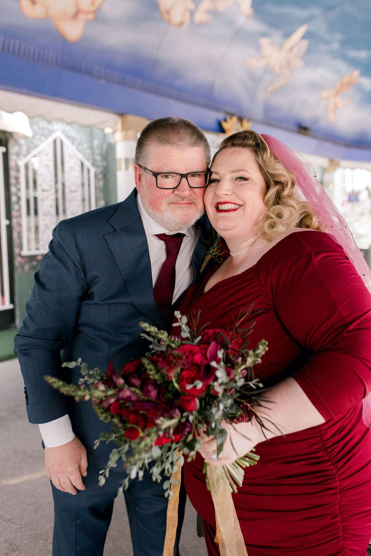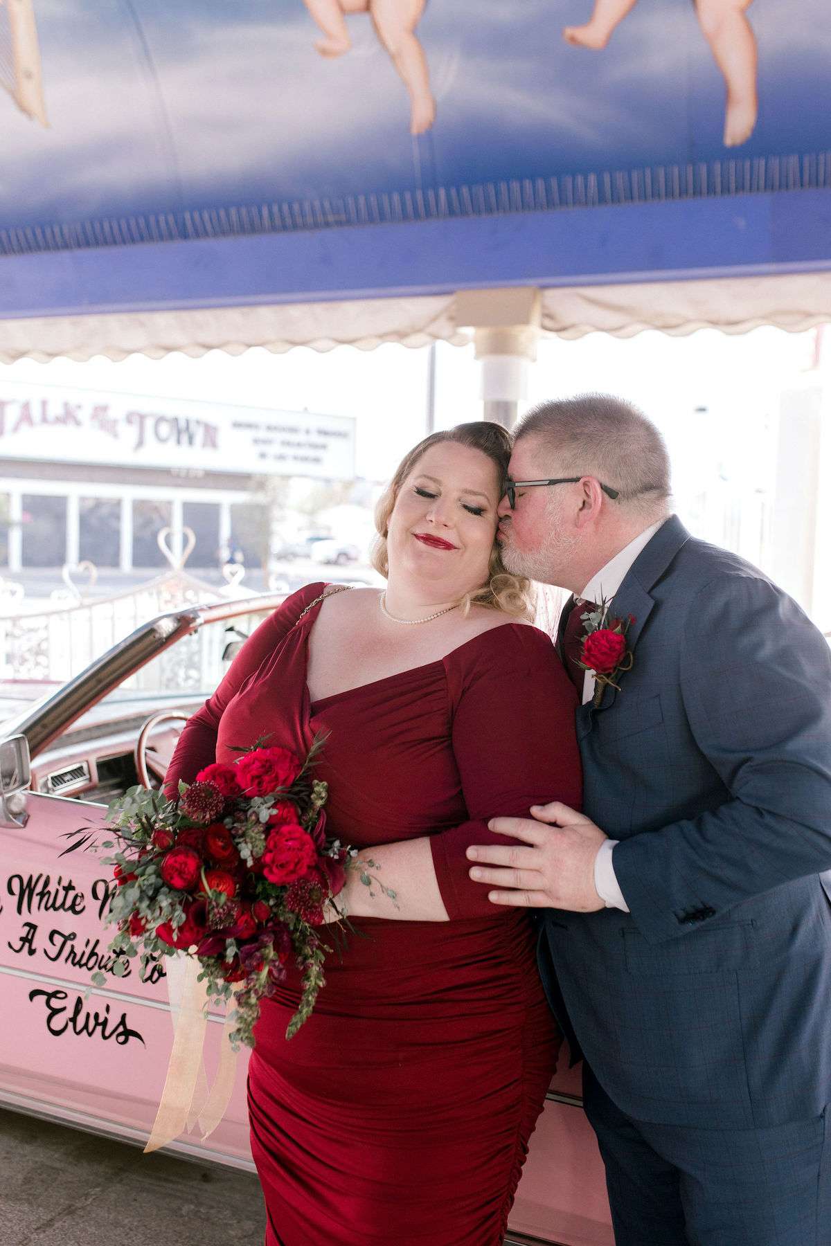 Inspired by all the Rock n Roll Bride Vegas weddings they’d seen, Kate and James wanted to celebrate their love of travel and each other, by eloping to Vegas. The couple wanted a day that celebrated them; keeping things simple and doing it all their way. The bride wore a stunning deep red pin up style dress and a deep pink veil, which she matched her florals to perfectly.