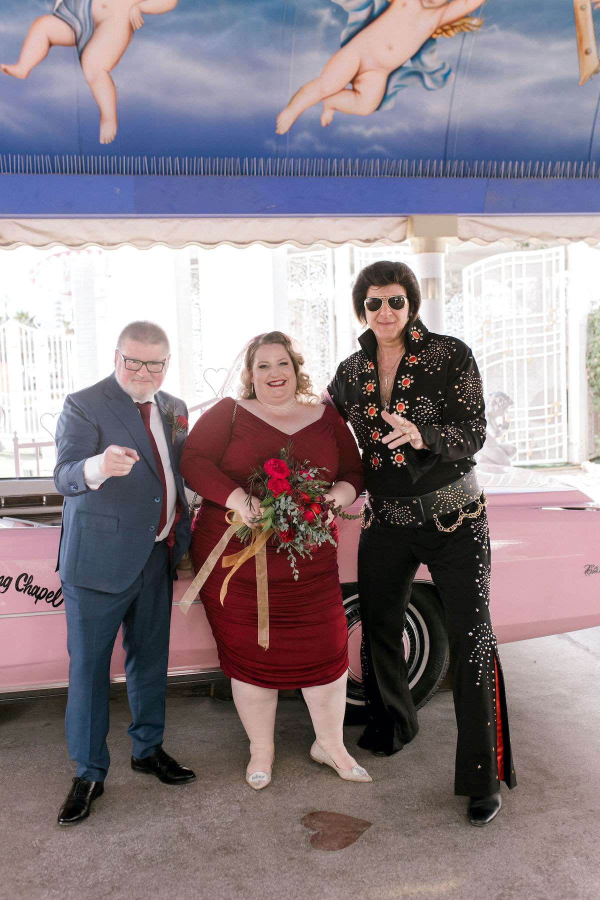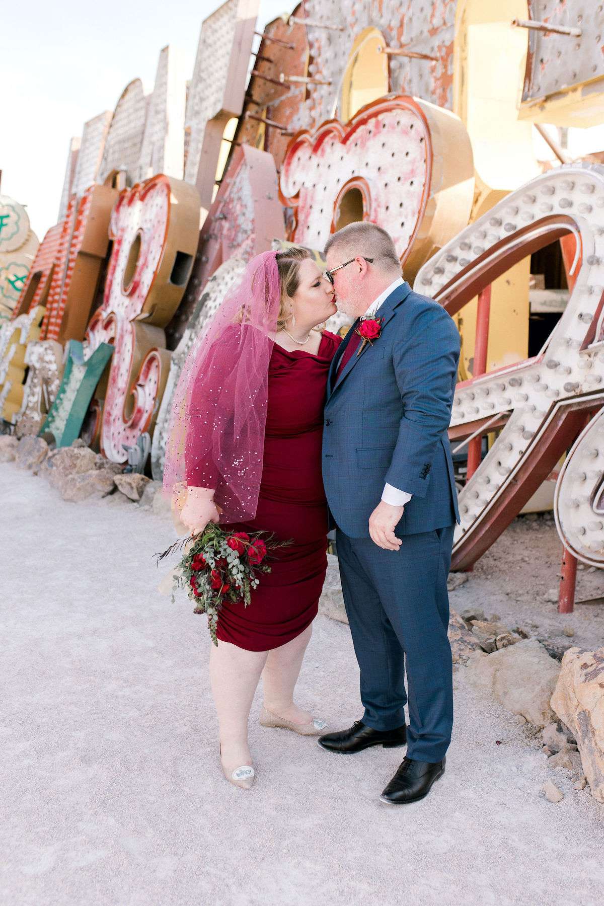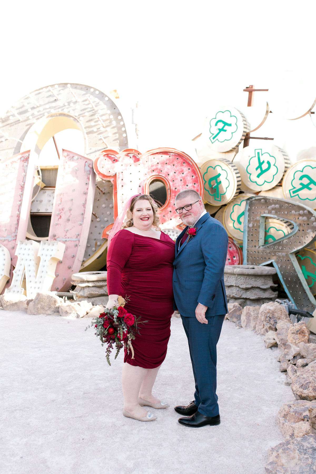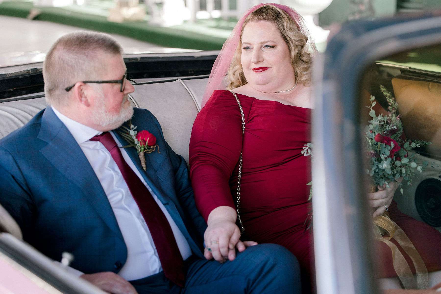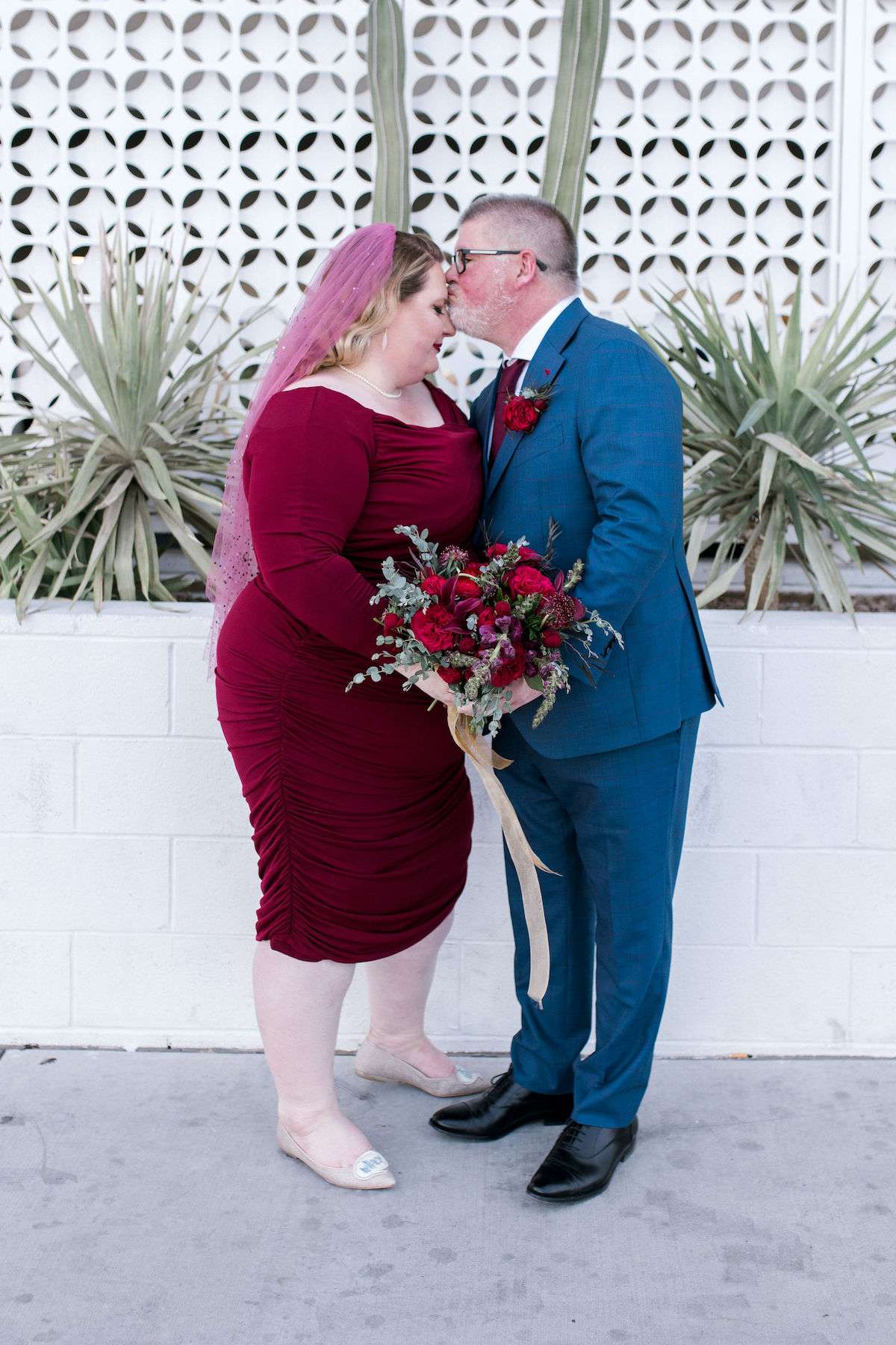 Inspired by all the Rock n Roll Bride Vegas weddings they’d seen, Kate and James wanted to celebrate their love of travel and each other, by eloping to Vegas. The couple wanted a day that celebrated them; keeping things simple and doing it all their way. The bride wore a stunning deep red pin up style dress and a deep pink veil, which she matched her florals to perfectly.