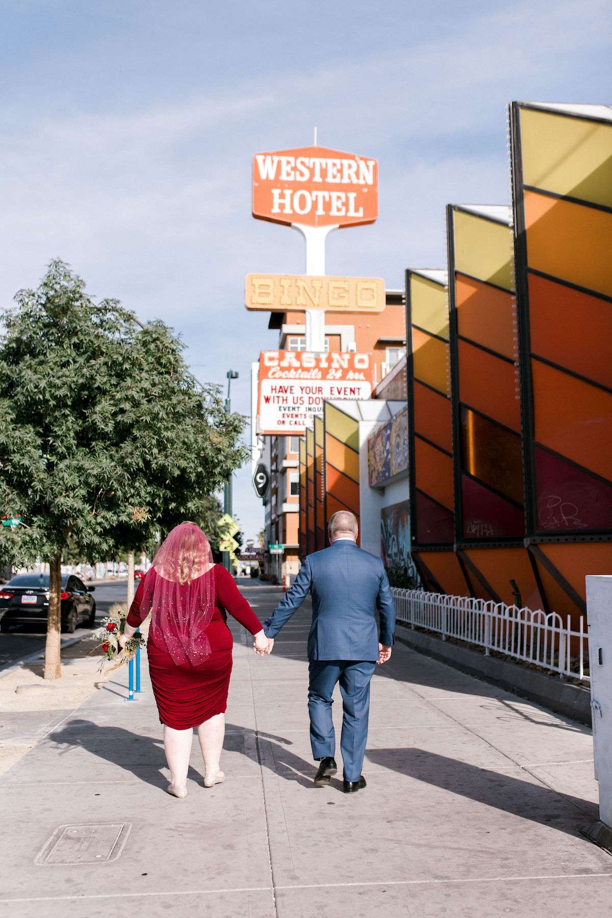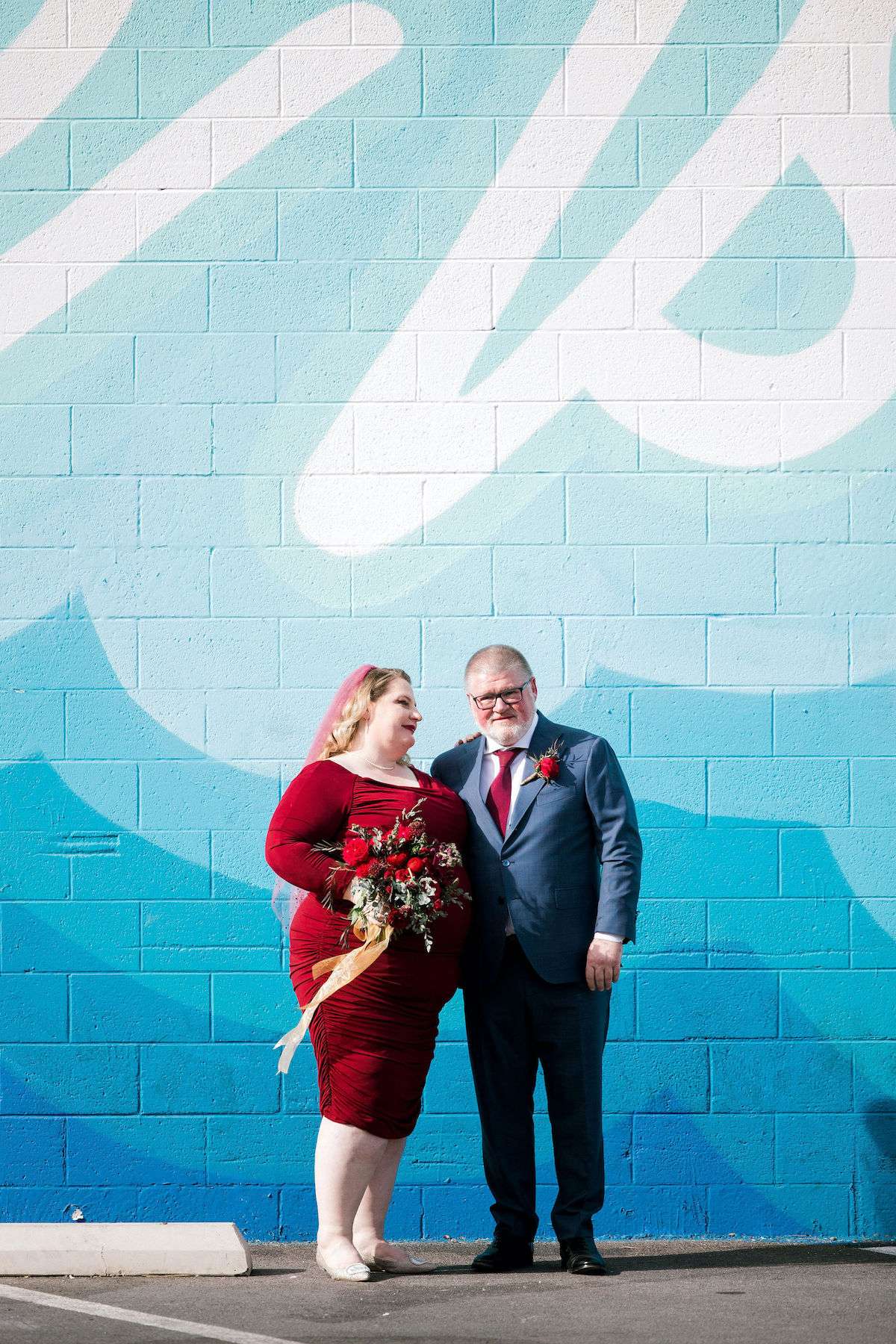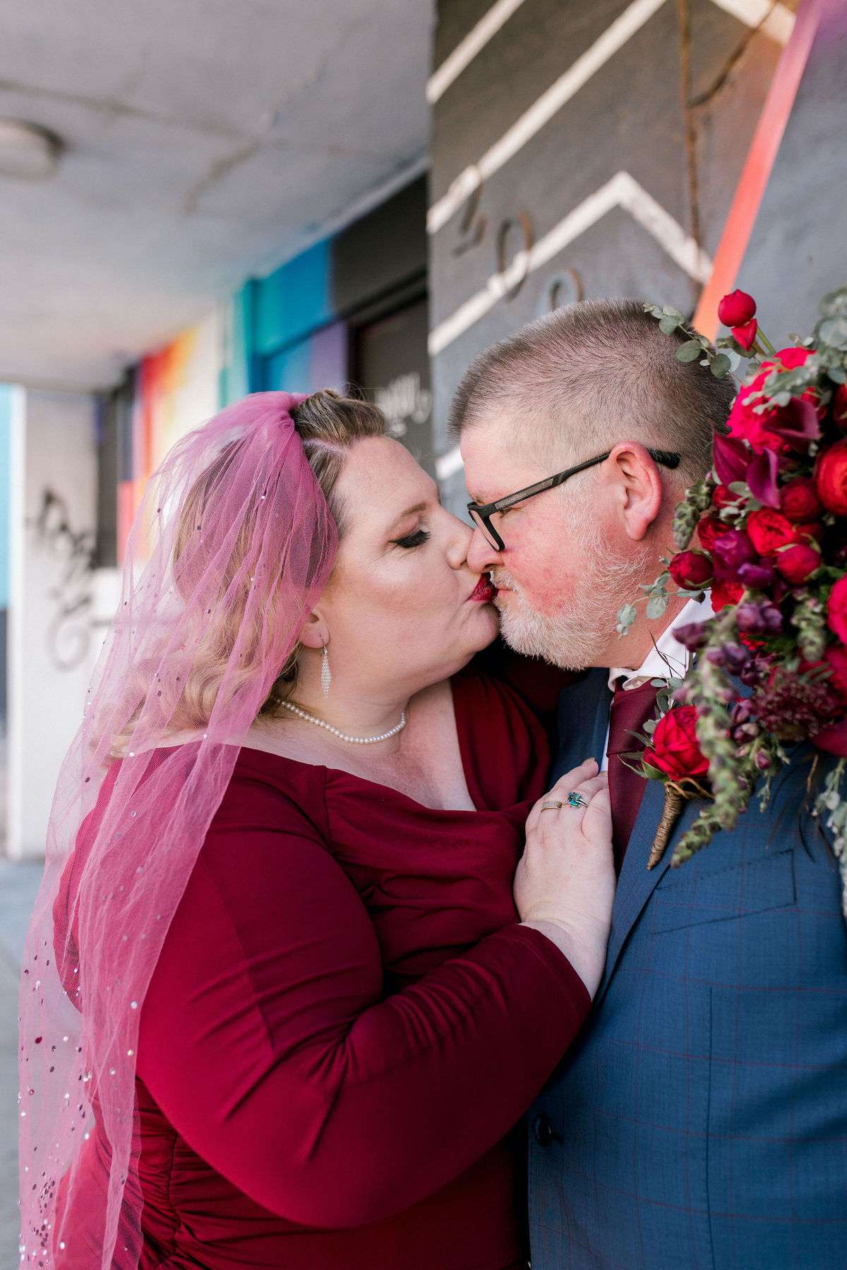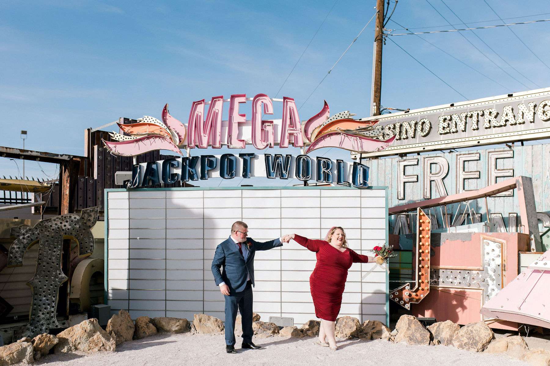 Inspired by all the Rock n Roll Bride Vegas weddings they’d seen, Kate and James wanted to celebrate their love of travel and each other, by eloping to Vegas. The couple wanted a day that celebrated them; keeping things simple and doing it all their way. The bride wore a stunning deep red pin up style dress and a deep pink veil, which she matched her florals to perfectly.