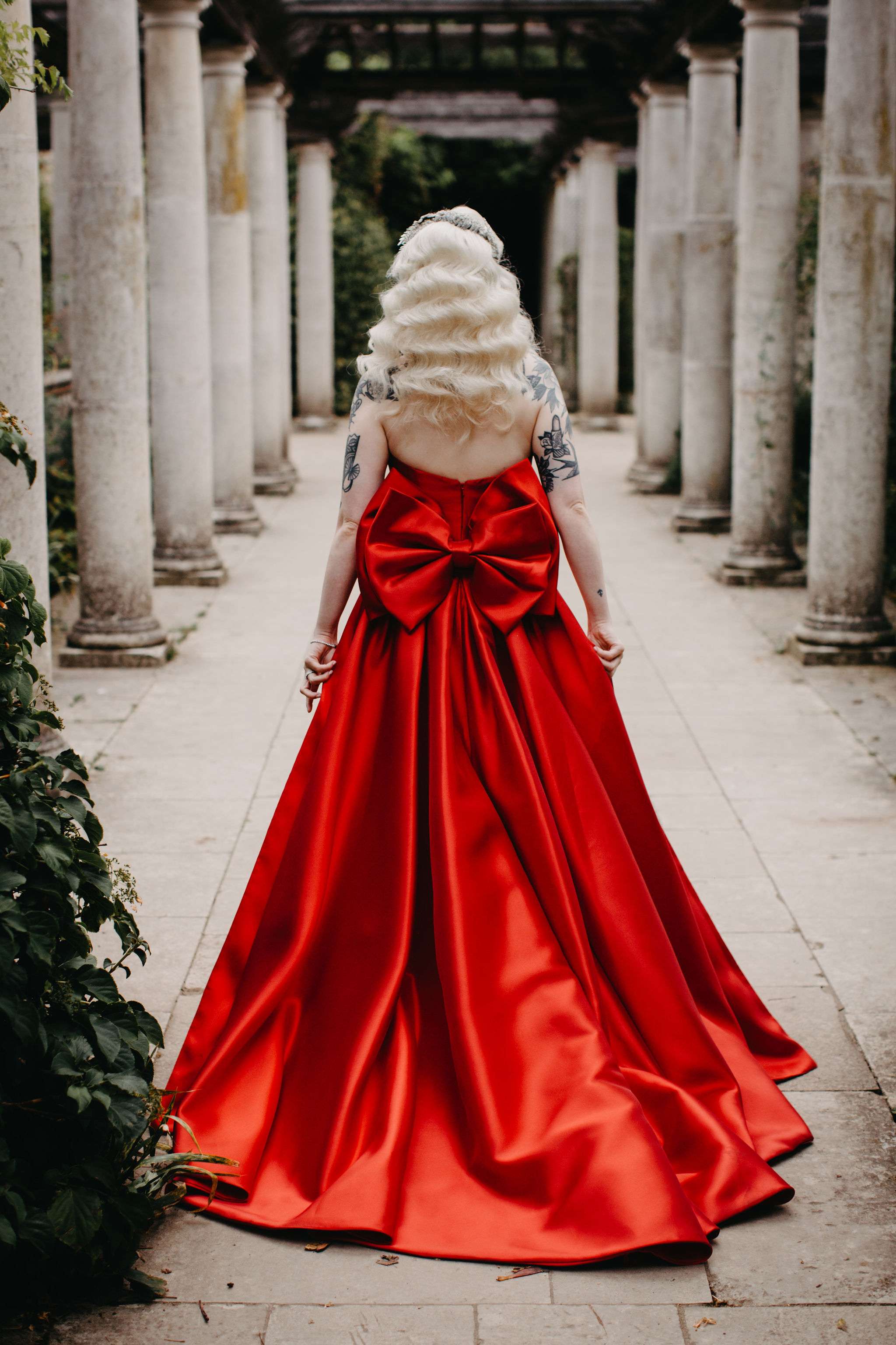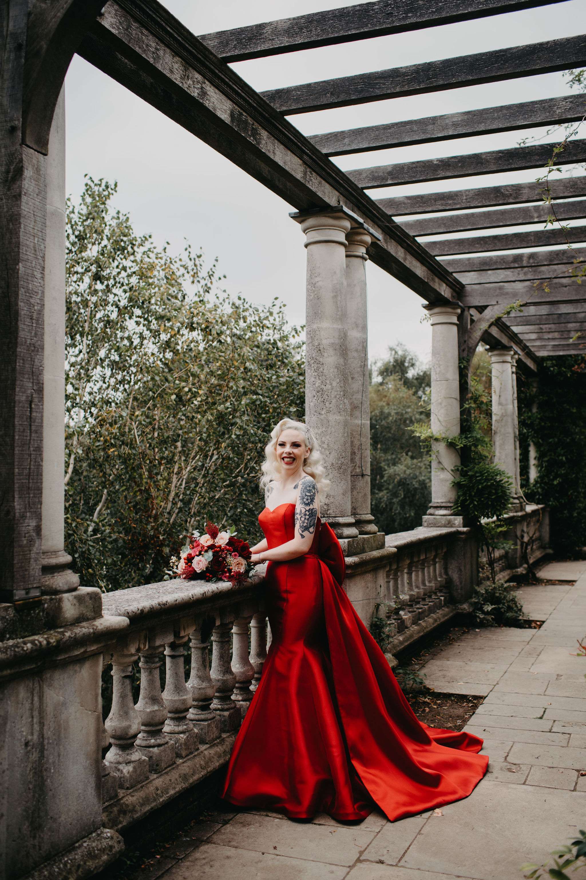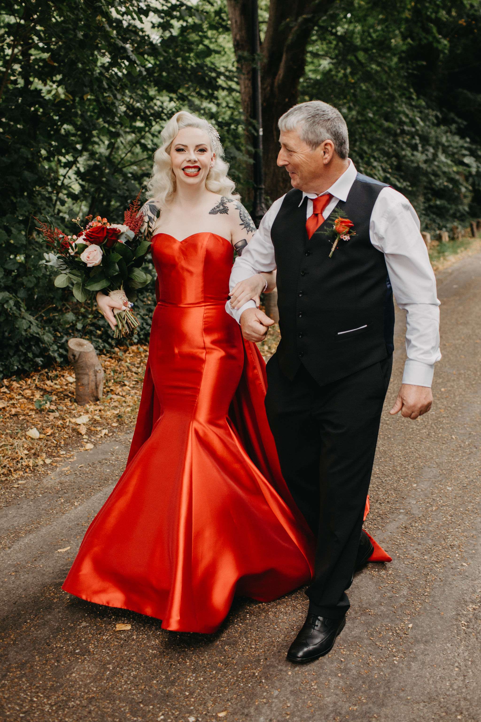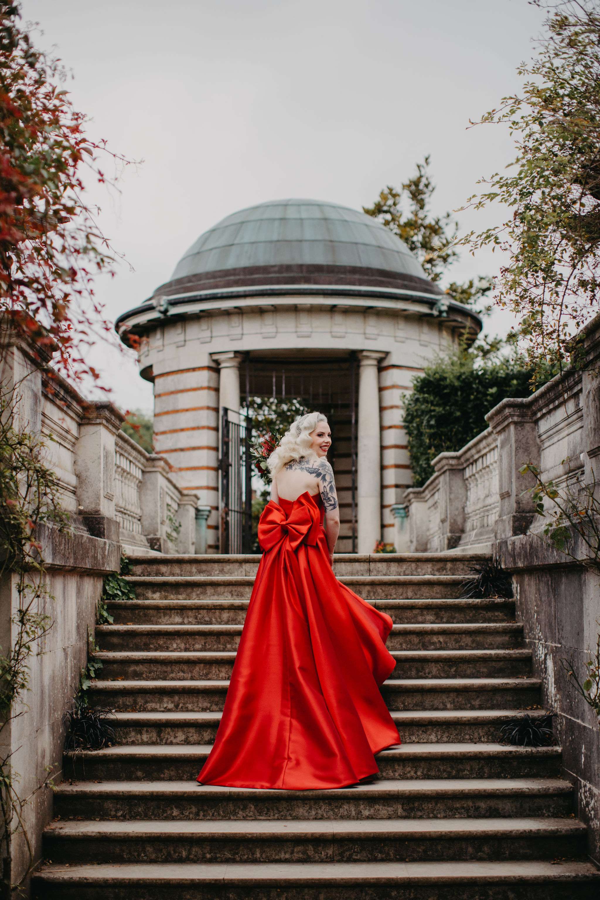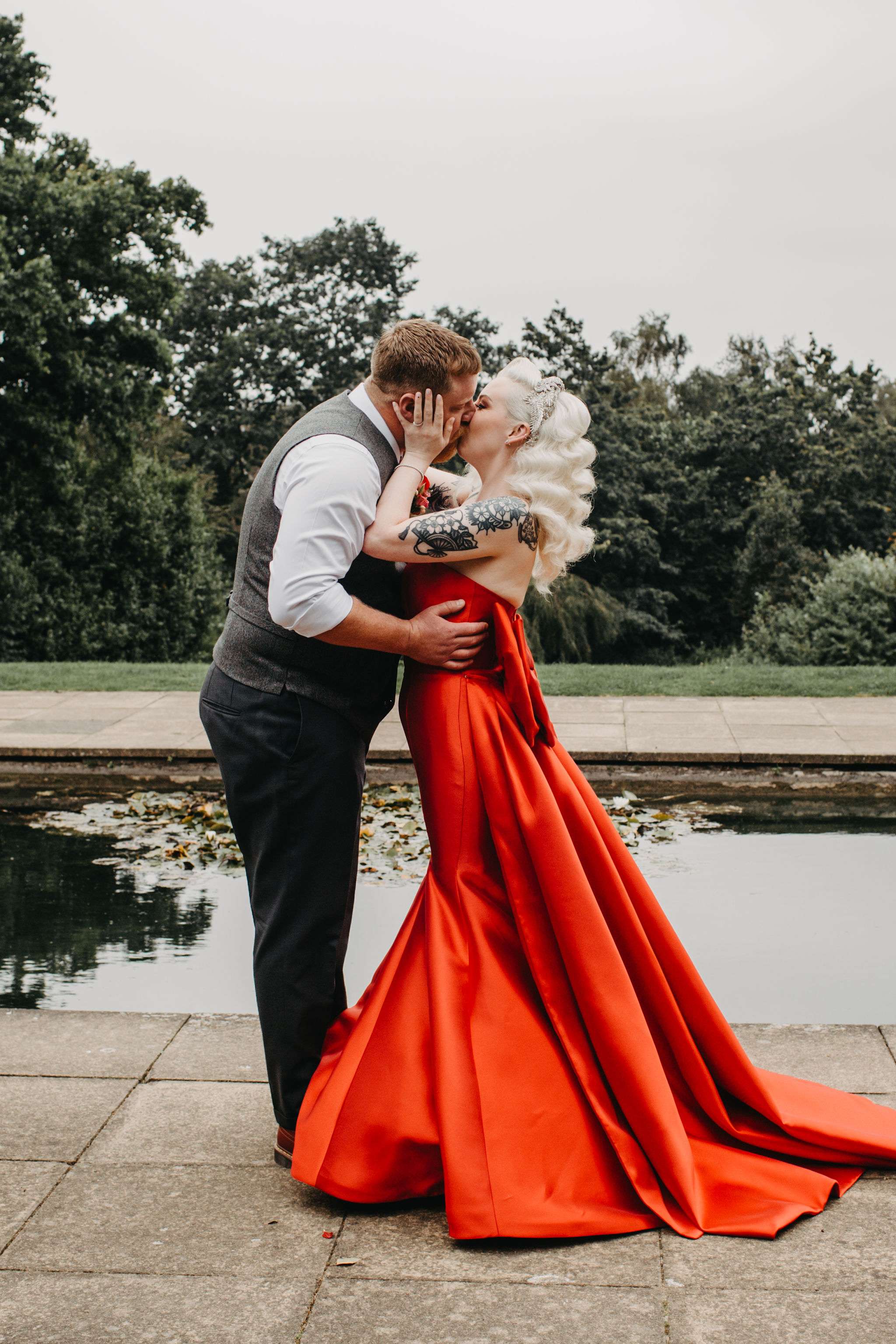 “Our celebration broke away from the traditional Irish wedding with a huge church and hundreds of guests”, Sinead told us. “Throwing tradition to the wind, I chose my halo, then my shoes and then the dress last. Each individual element just felt right at the time. I wanted a vintage aesthetic as I dress in this style usually but most bridal boutiques don’t have red dresses for you to try on. Feeling uninspired by bridal boutiques nearby, I chose a bespoke dress from House of Mooshki, based in Newcastle. It took a lot of imagination to picture the final design but through Phil’s hand drawn sketches and computer illustrations with the colour added, my apprehension soon turned to excitement.”