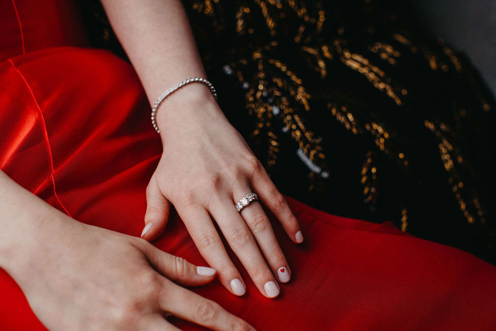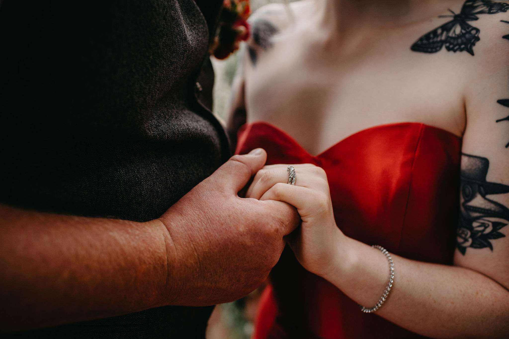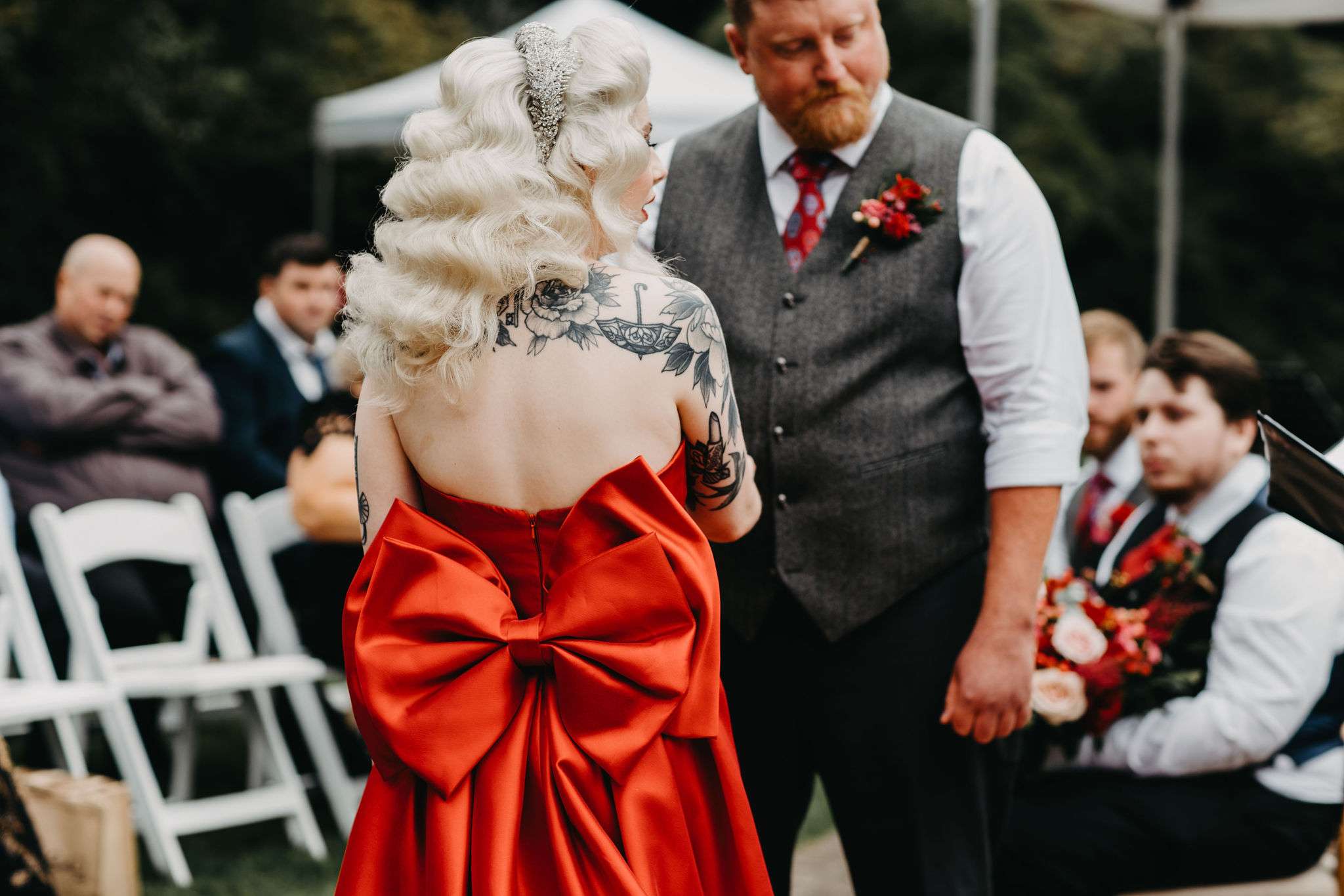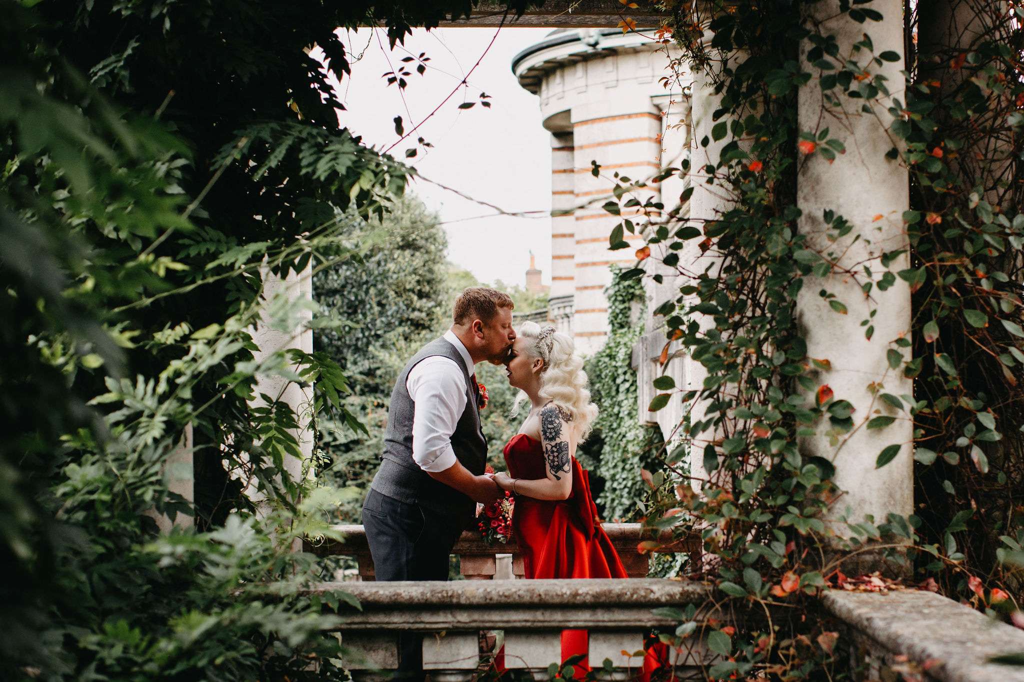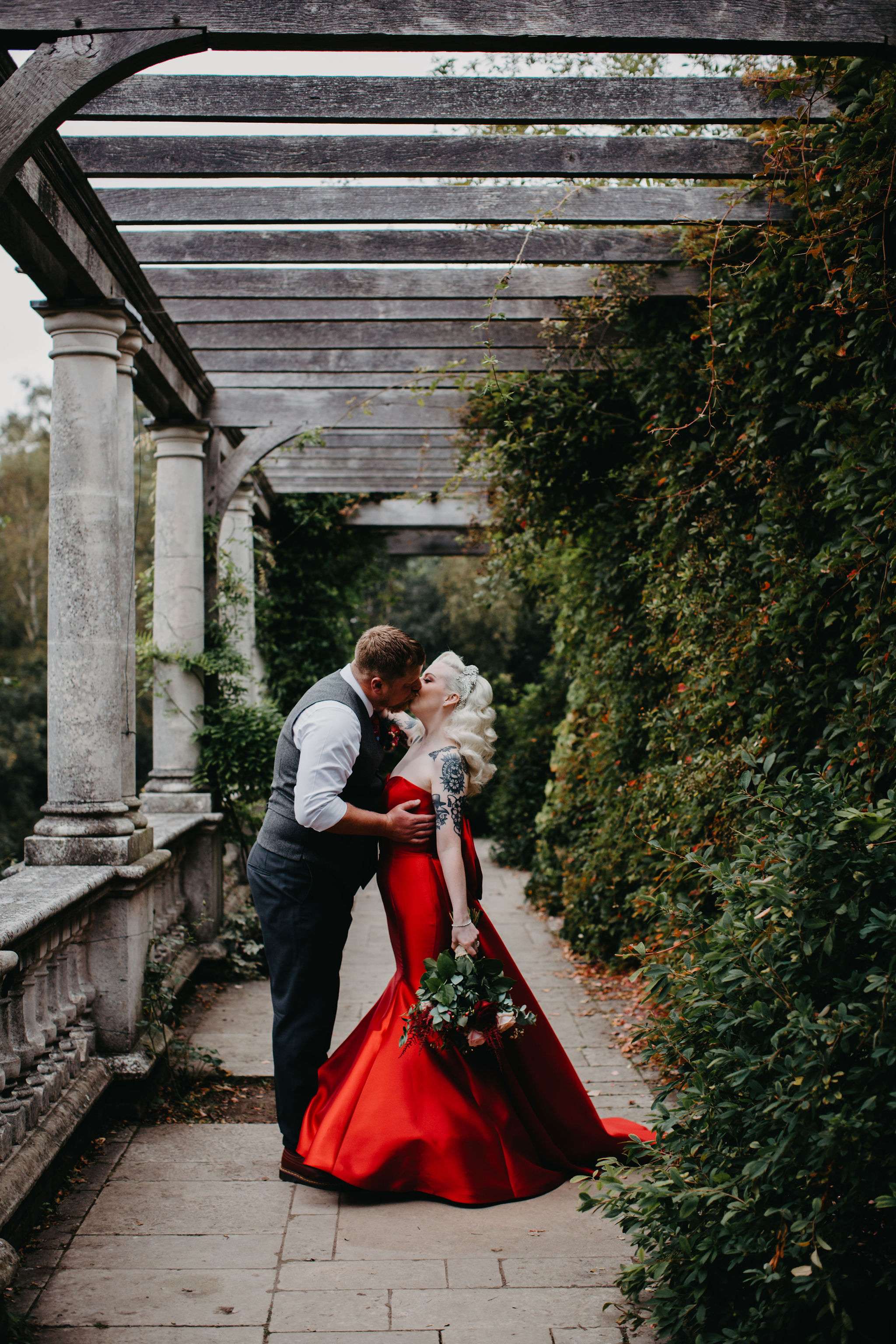 “Our celebration broke away from the traditional Irish wedding with a huge church and hundreds of guests”, Sinead told us. “Throwing tradition to the wind, I chose my halo, then my shoes and then the dress last. Each individual element just felt right at the time. I wanted a vintage aesthetic as I dress in this style usually but most bridal boutiques don’t have red dresses for you to try on. Feeling uninspired by bridal boutiques nearby, I chose a bespoke dress from House of Mooshki, based in Newcastle. It took a lot of imagination to picture the final design but through Phil’s hand drawn sketches and computer illustrations with the colour added, my apprehension soon turned to excitement.”