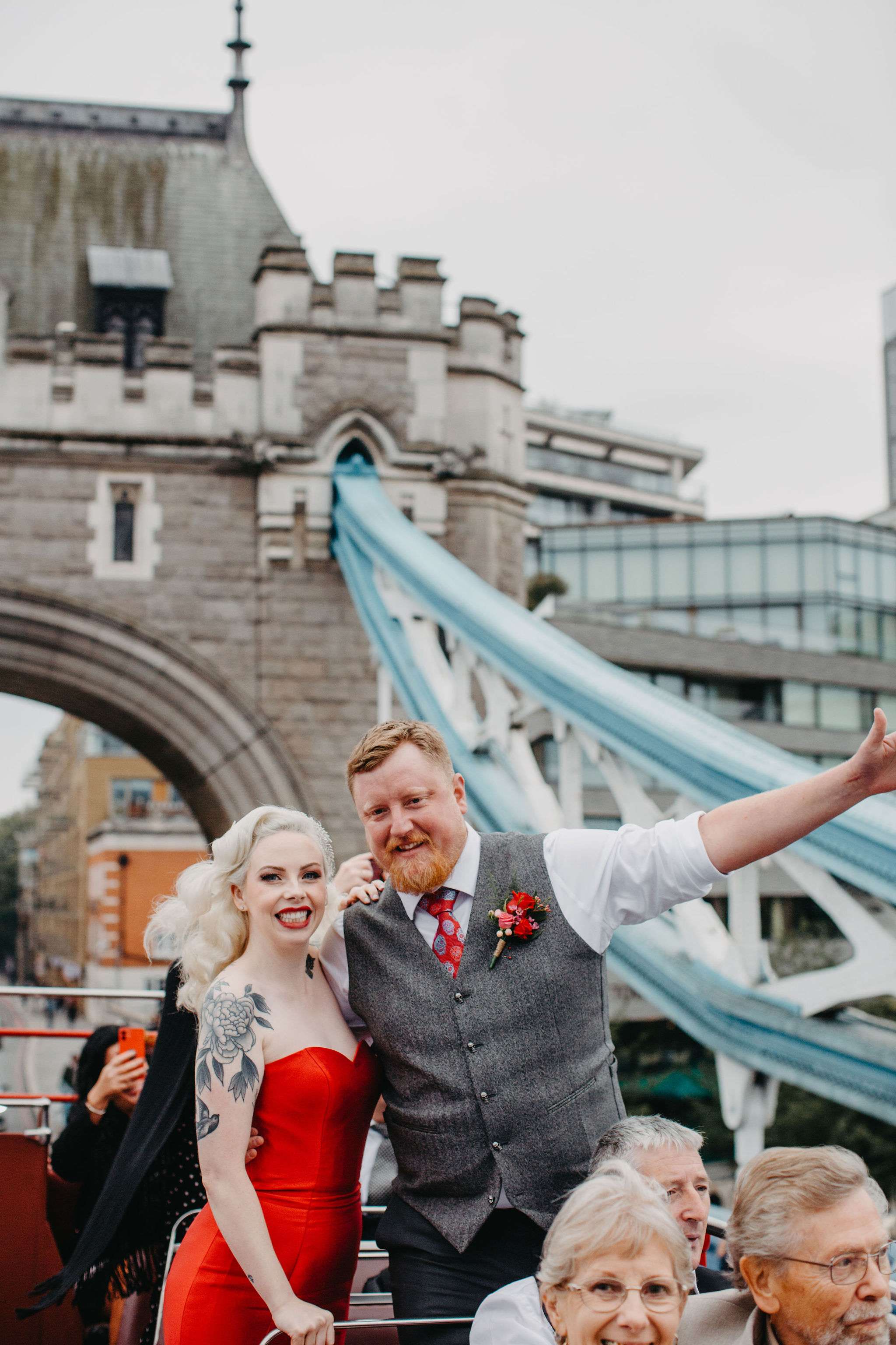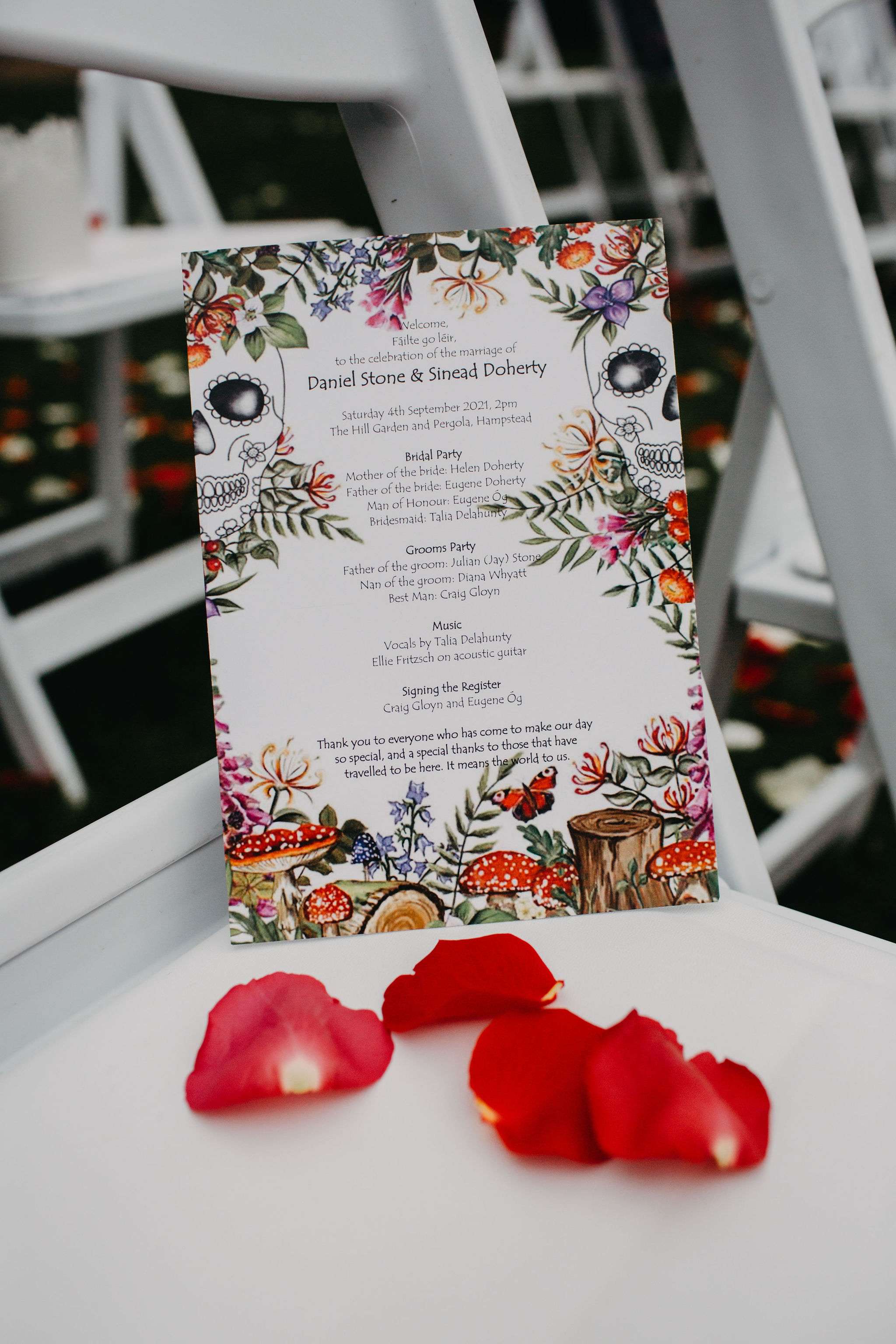 The ceremony took place in Golders Hill Garden and Pergola, a stunning outdoor venue in North London. It’s green creeping foliage was the perfect contrast to Sinead’s red wedding dress. The music was performed by her cousin on guitar. After their photos, they headed to Granary Square Brasserie by open top red bus for their reception. They chose a sit down meal and an open bar as they didn’t want their guests to have to pay for anything, so this ended up being the biggest expense of the wedding. They chose a bespoke range of cocktails and had their own personalised menu, there was also a mocktail called the ‘Man of Honour’ especially for the bride’s brother.