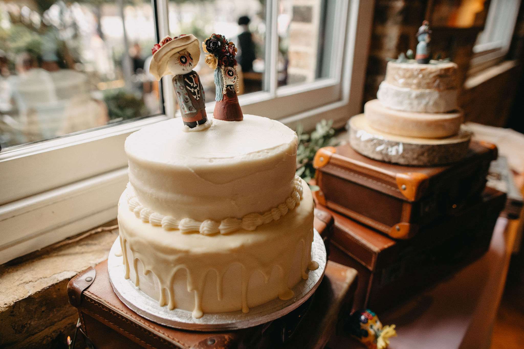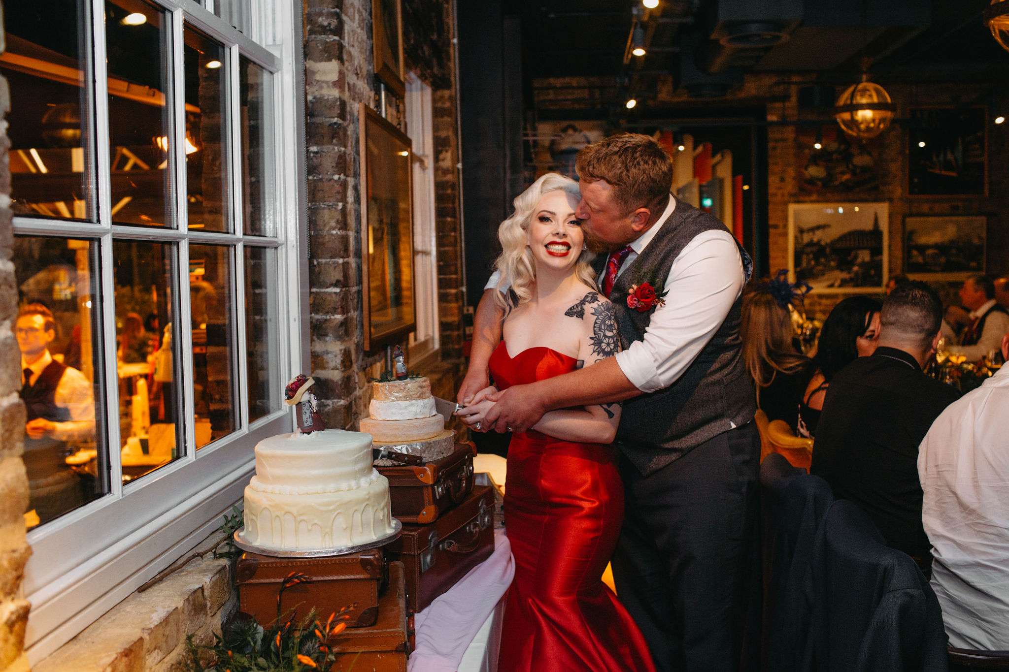 Sinead’s stunning red gown was a bespoke design from House of Mooshki based on Marilyn’s iconic Some Like It Hot dress but made in red, with a ‘bum cape’ (detachable train!) Dolly’s Beauty Parlour did her hair in Hollywood waves (which survived the open top bus ride!) and vintage inspired make-up to complete the look. The groom’s suit had tiny skull buttons and lining which was also mirrored in their stationery and place settings which were skulls, too.