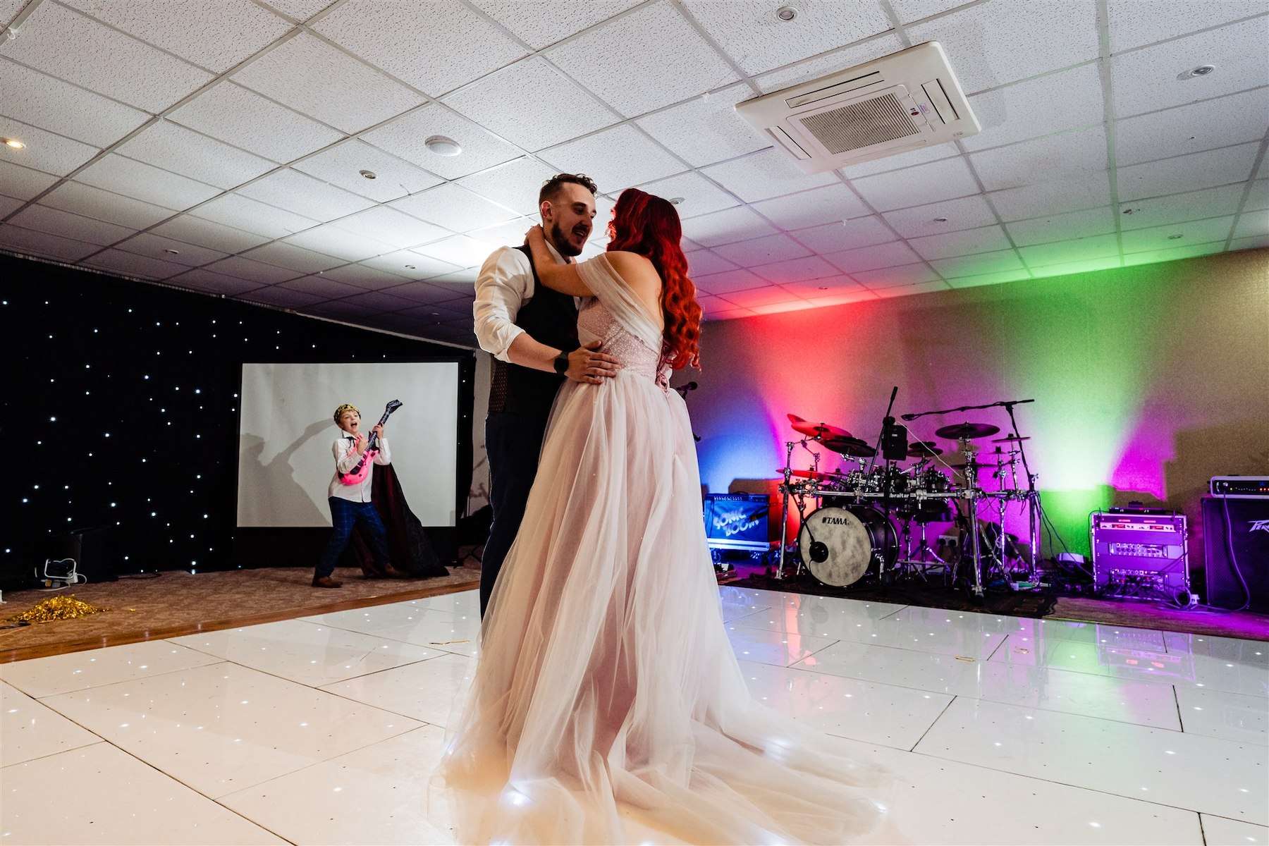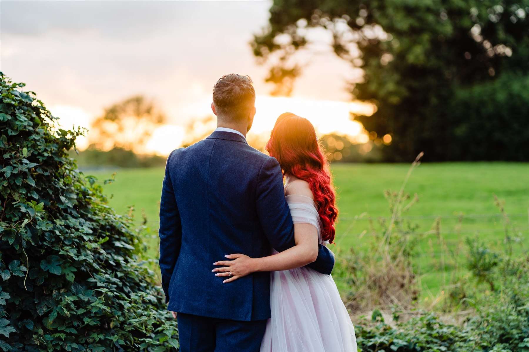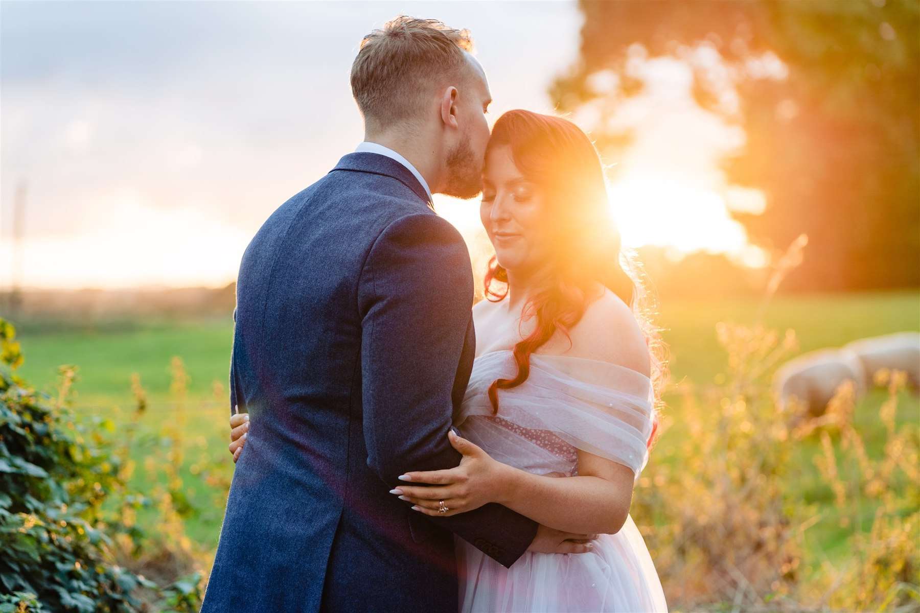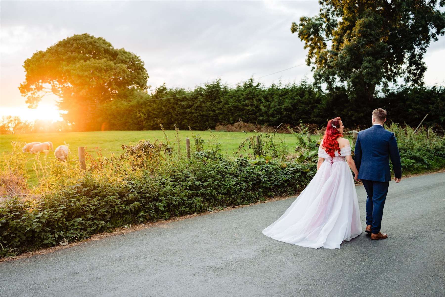 Opting not to have too many staged photos, Sarah and Nick had a few quick friends and family pictures before the meal. They then snuck off to have some portraits done, just the two of them, managing to capture an epic sunset, which they told us was a real highlight of the day. A chilly evening saw the party move from the tipis to the indoor dancefloor, where Sarah’s young nephew decided to accompany their first dance on an inflatable pink guitar, in a curly blonde wig!