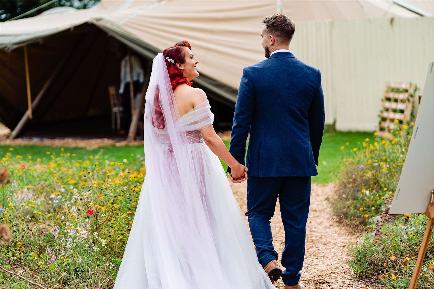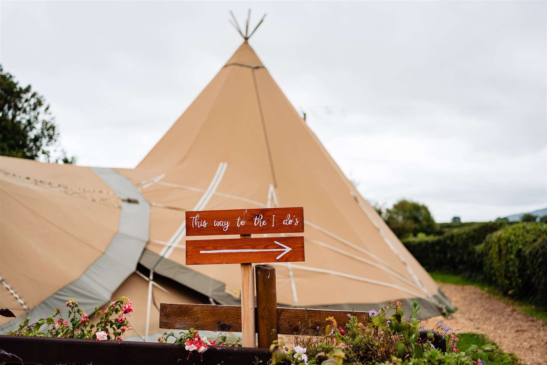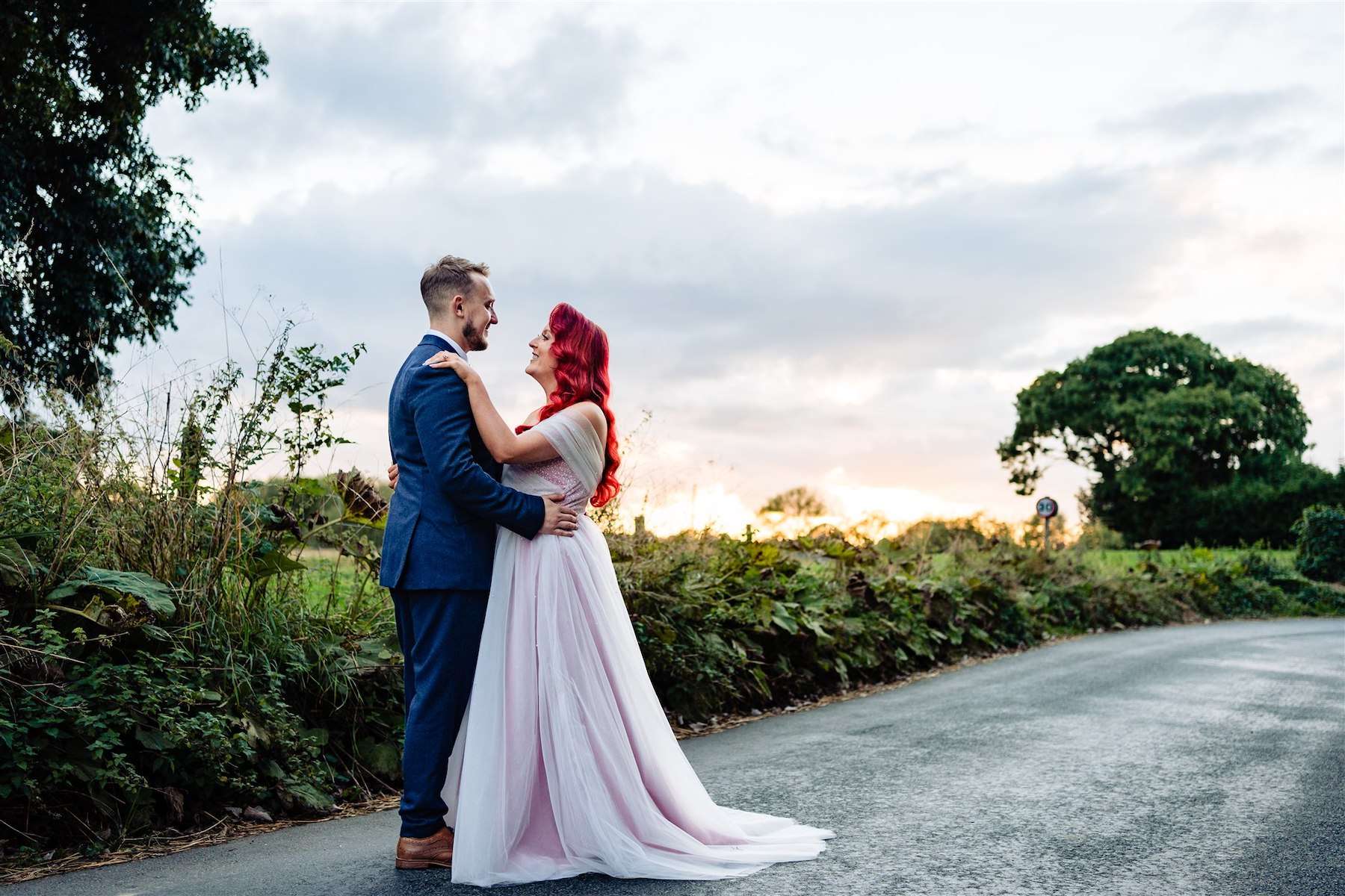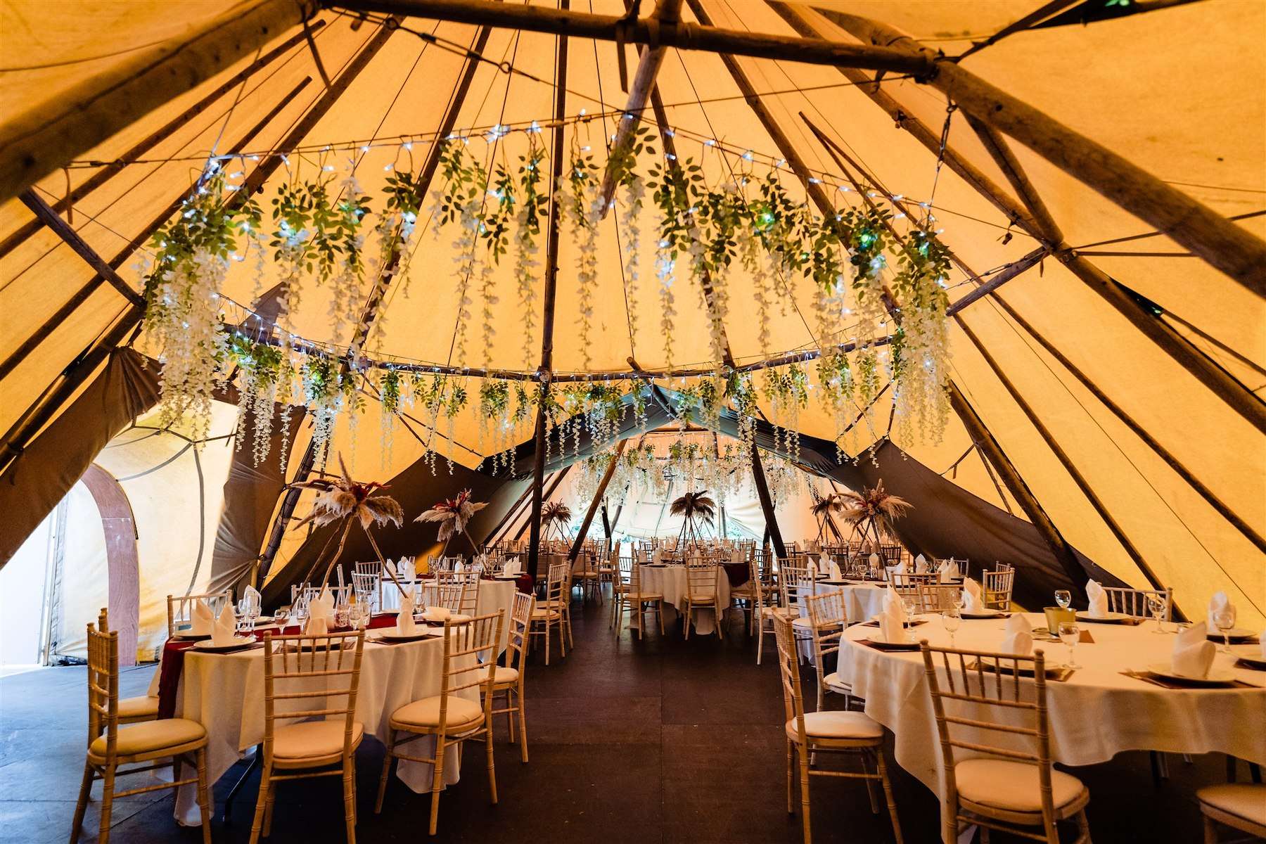 Opting not to have too many staged photos, Sarah and Nick had a few quick friends and family pictures before the meal. They then snuck off to have some portraits done, just the two of them, managing to capture an epic sunset, which they told us was a real highlight of the day. A chilly evening saw the party move from the tipis to the indoor dancefloor, where Sarah’s young nephew decided to accompany their first dance on an inflatable pink guitar, in a curly blonde wig!