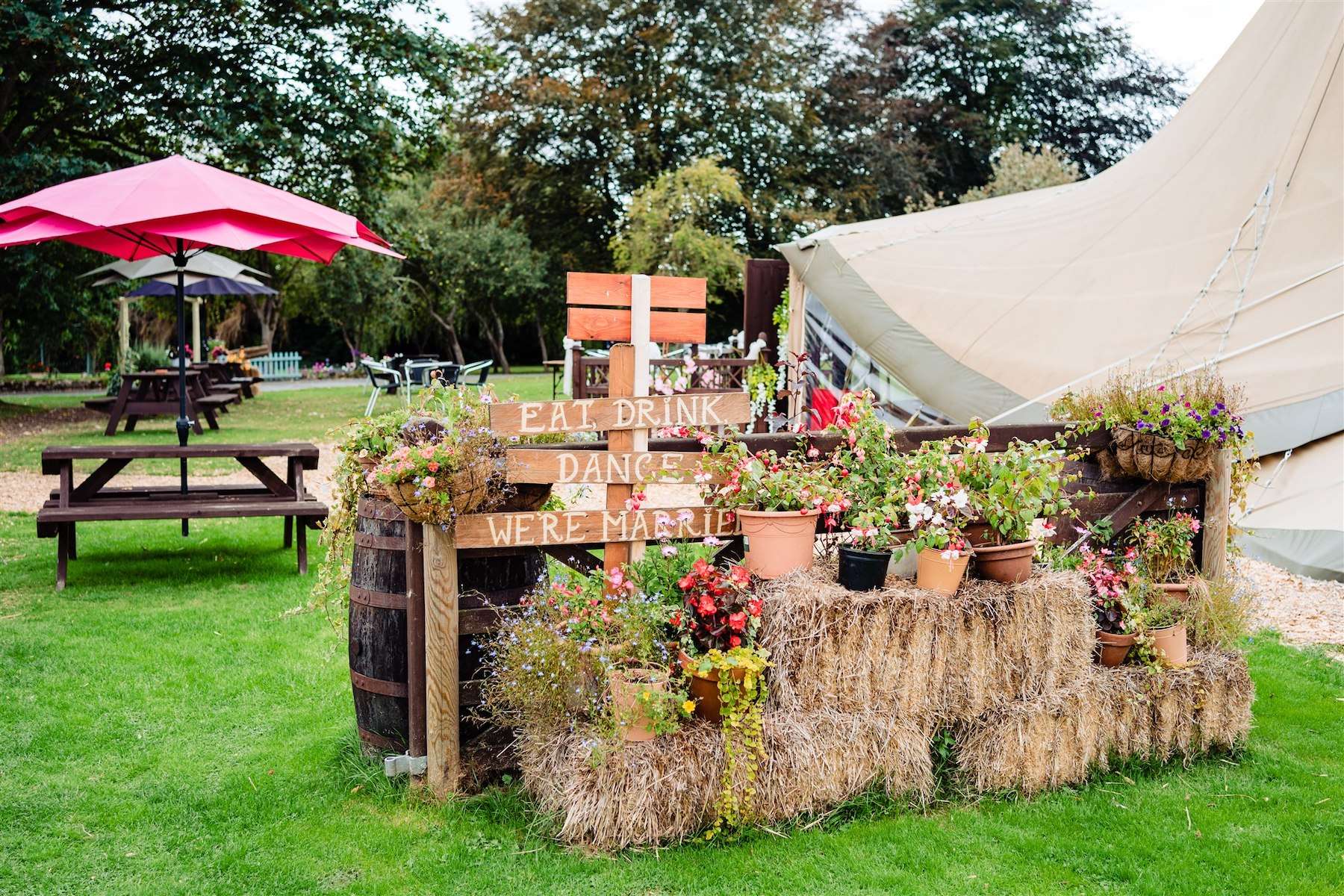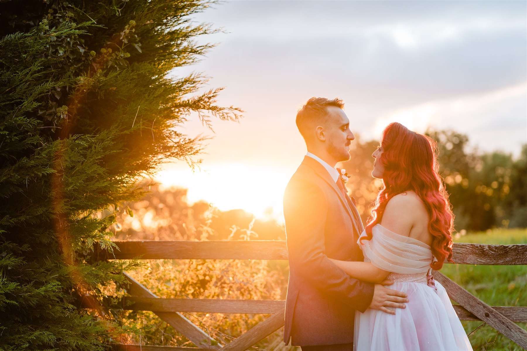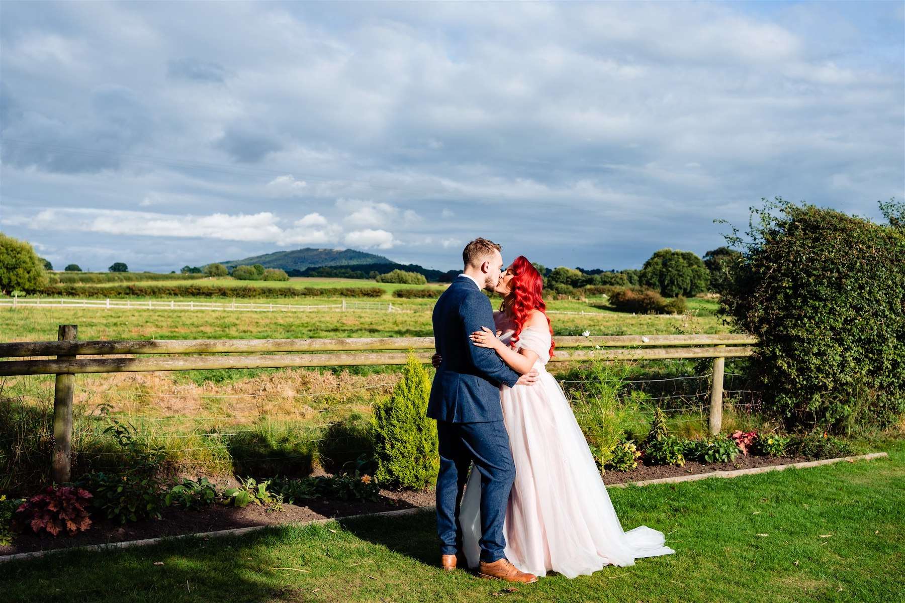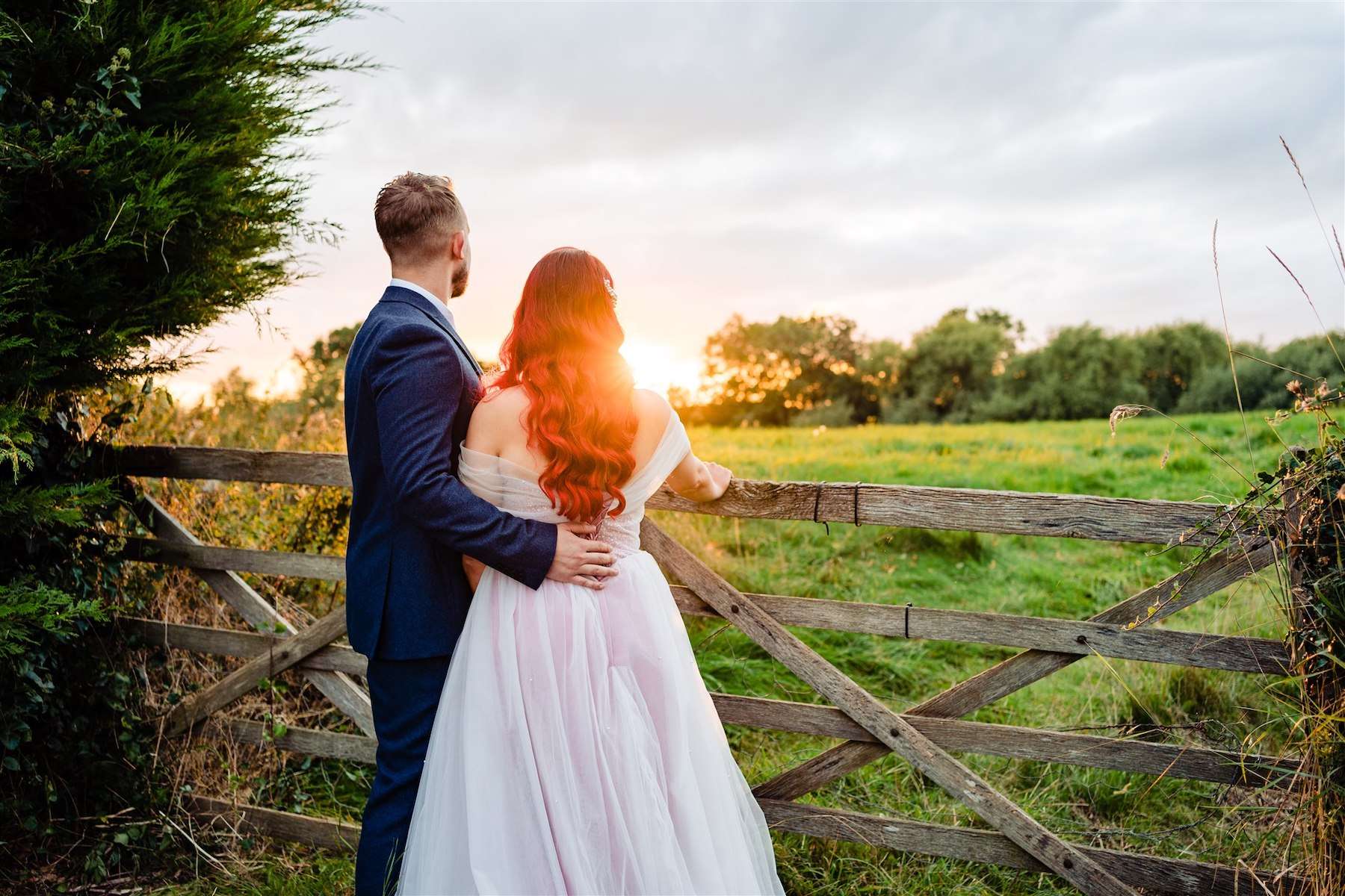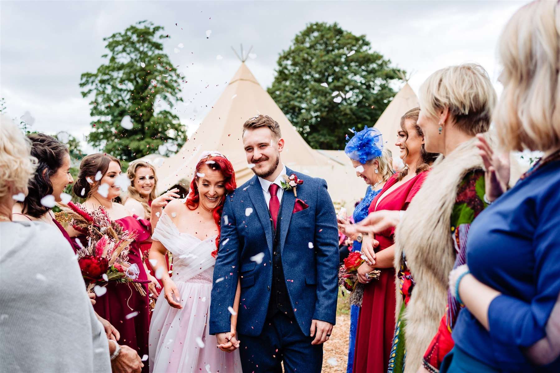 Opting not to have too many staged photos, Sarah and Nick had a few quick friends and family pictures before the meal. They then snuck off to have some portraits done, just the two of them, managing to capture an epic sunset, which they told us was a real highlight of the day. A chilly evening saw the party move from the tipis to the indoor dancefloor, where Sarah’s young nephew decided to accompany their first dance on an inflatable pink guitar, in a curly blonde wig!