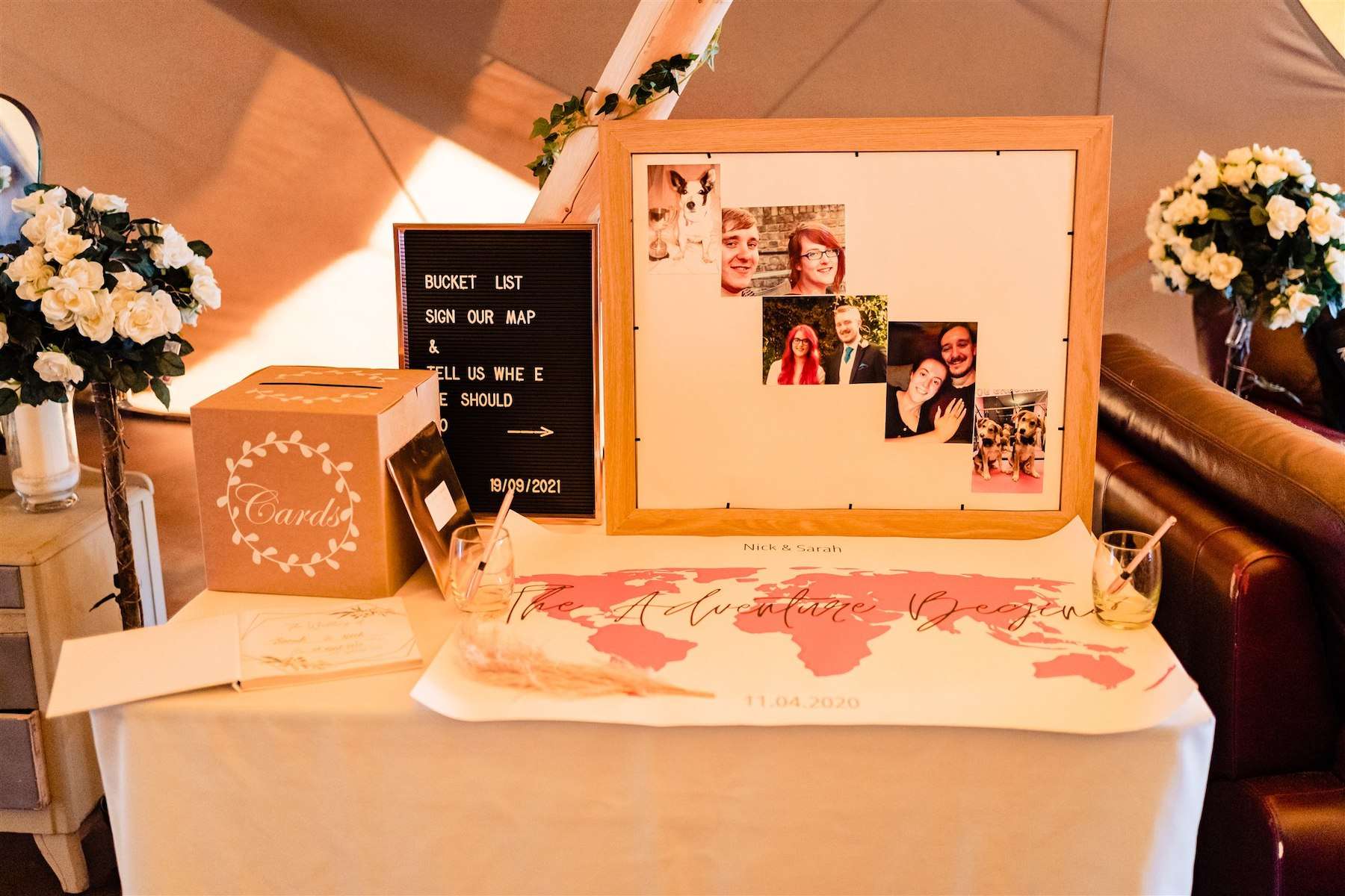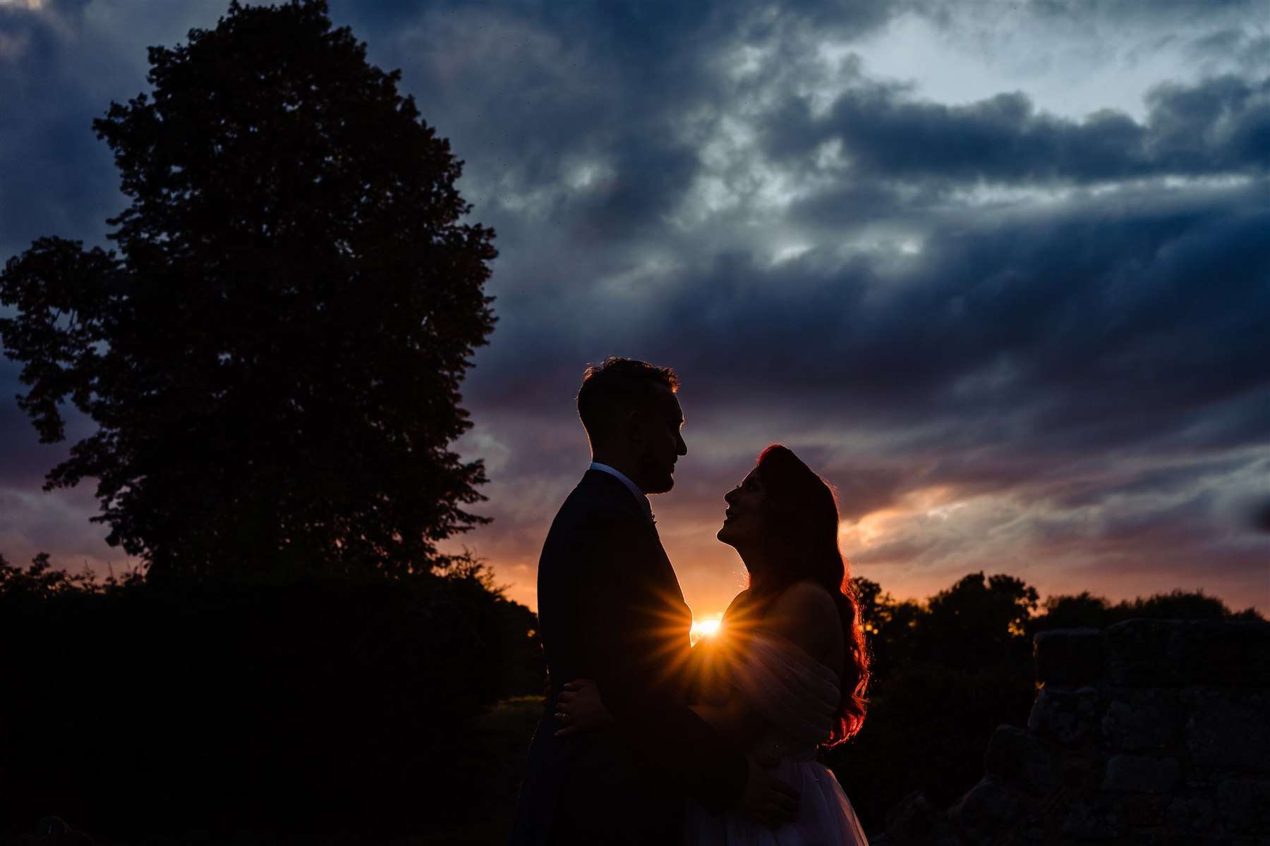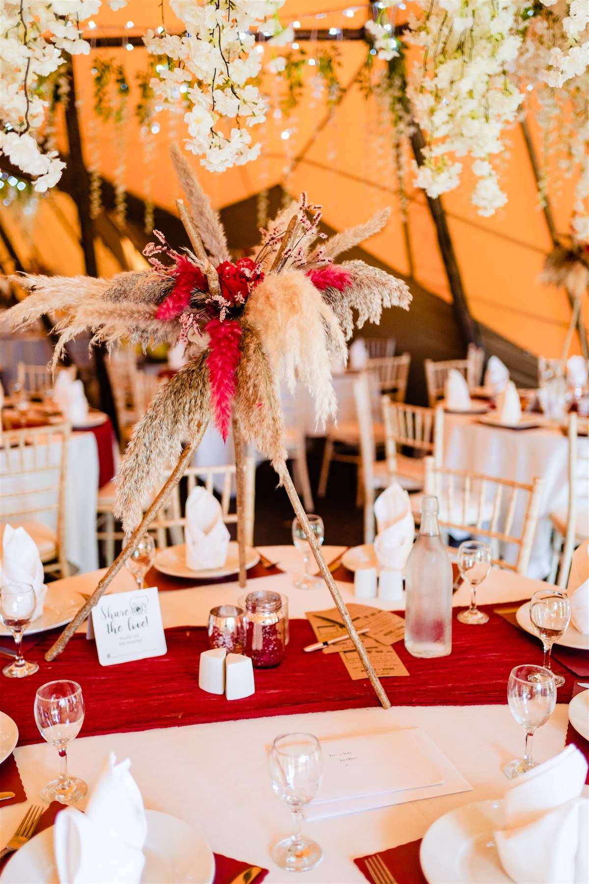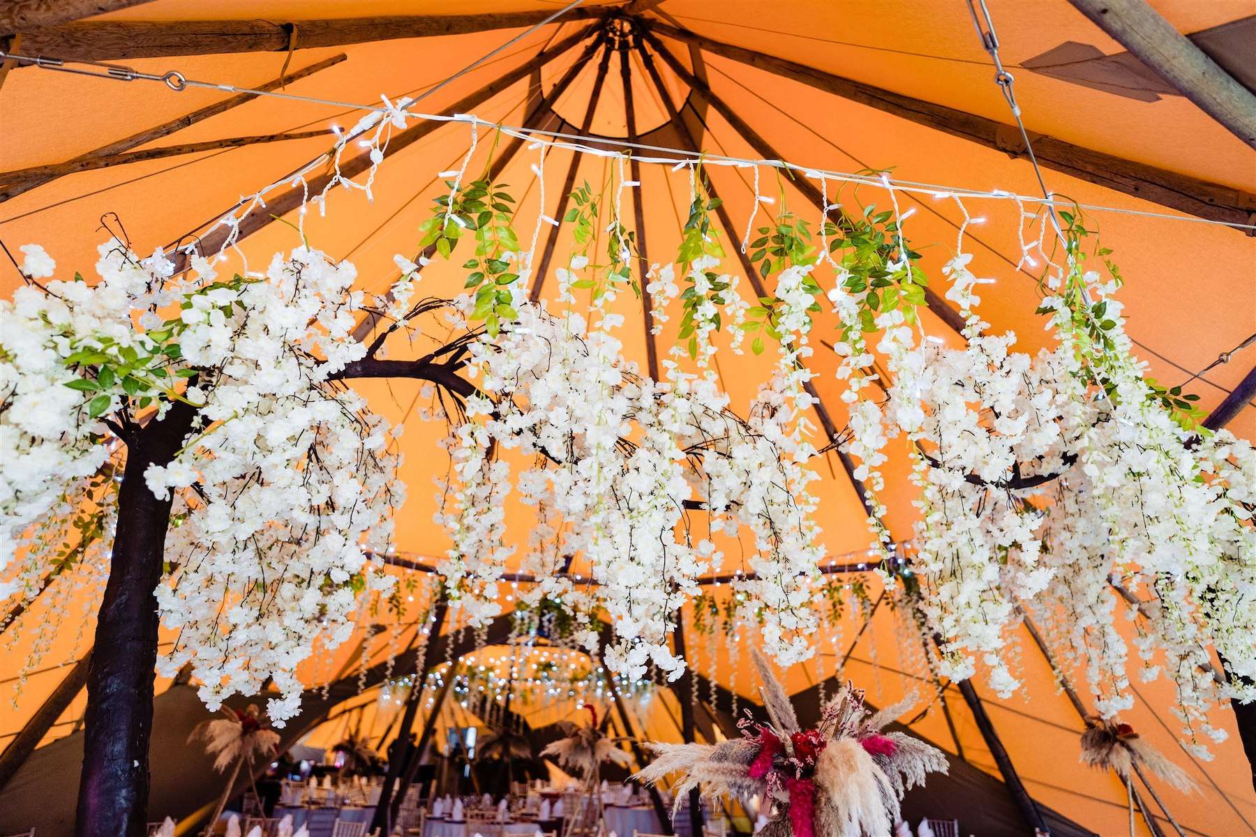 Opting not to have too many staged photos, Sarah and Nick had a few quick friends and family pictures before the meal. They then snuck off to have some portraits done, just the two of them, managing to capture an epic sunset, which they told us was a real highlight of the day. A chilly evening saw the party move from the tipis to the indoor dancefloor, where Sarah’s young nephew decided to accompany their first dance on an inflatable pink guitar, in a curly blonde wig!