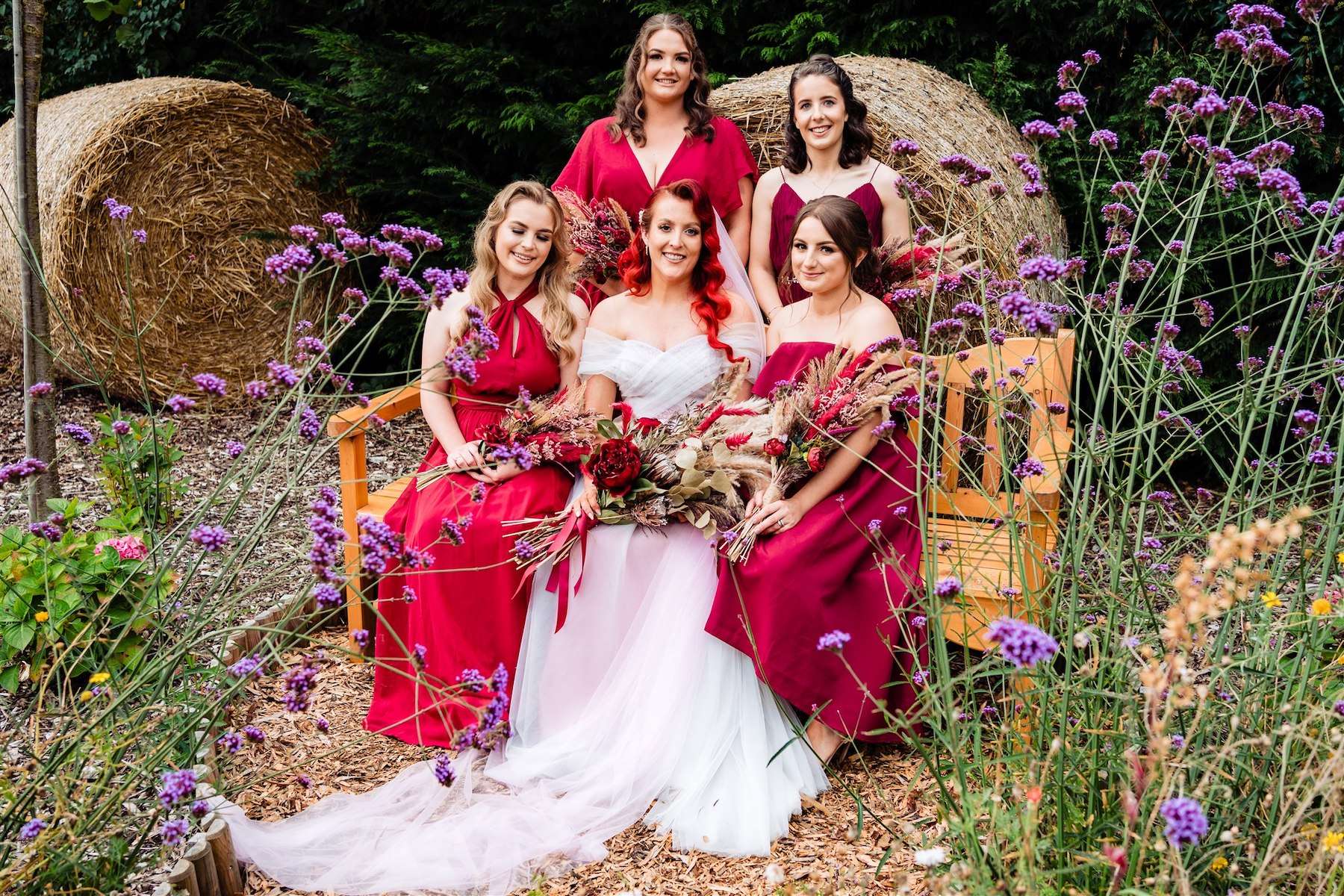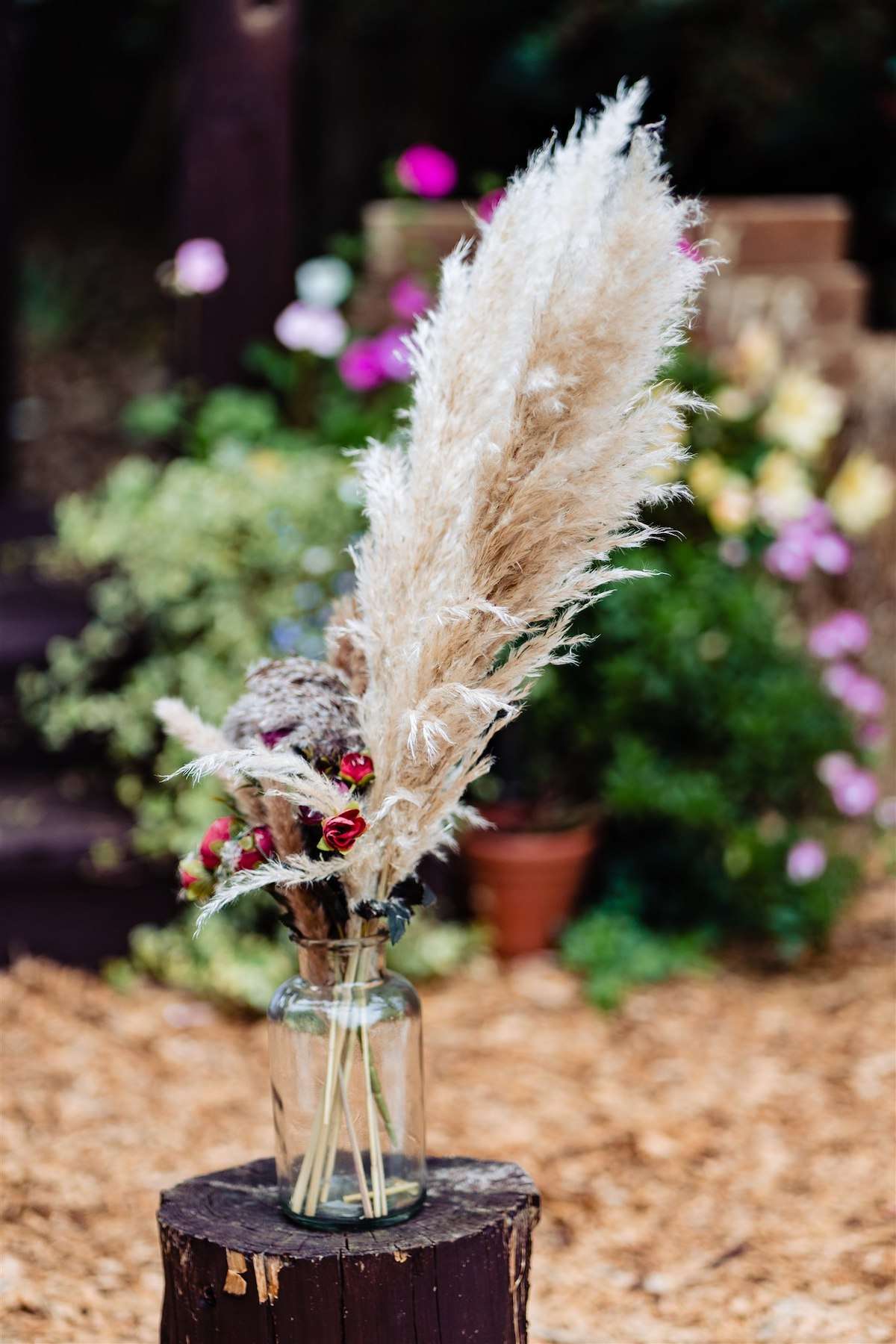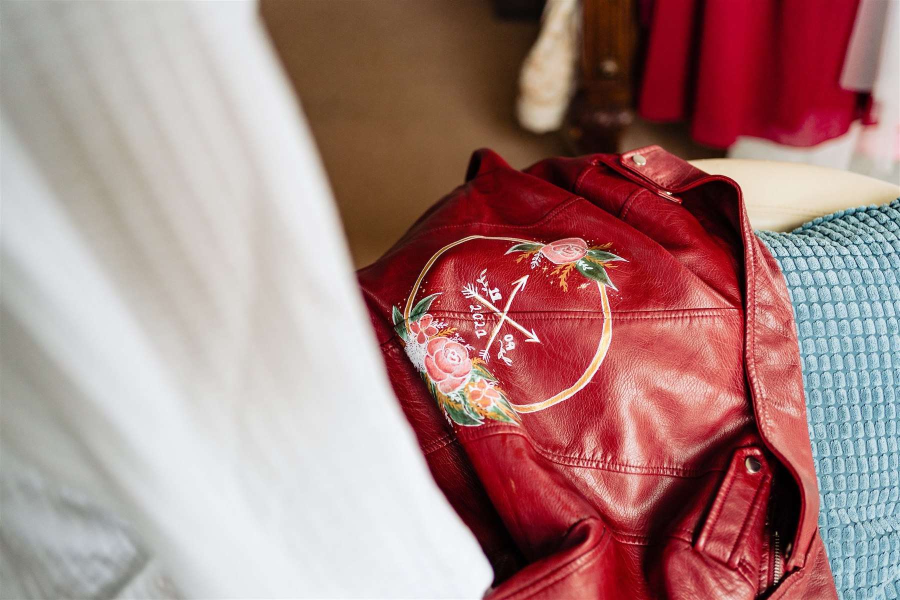 Planning to make around half the décor, Sarah created all the table centrepieces with dried flowers and pampas grass (found on Facebook) as well as the aisle runners to match. Bouquets and buttonholes were homemade, and Sarah even hand-painted her own jacket, as well as the bridesmaids’ pyjamas. Thank you hampers and the ‘bucket list’ guest book completed the impressive DIY list.