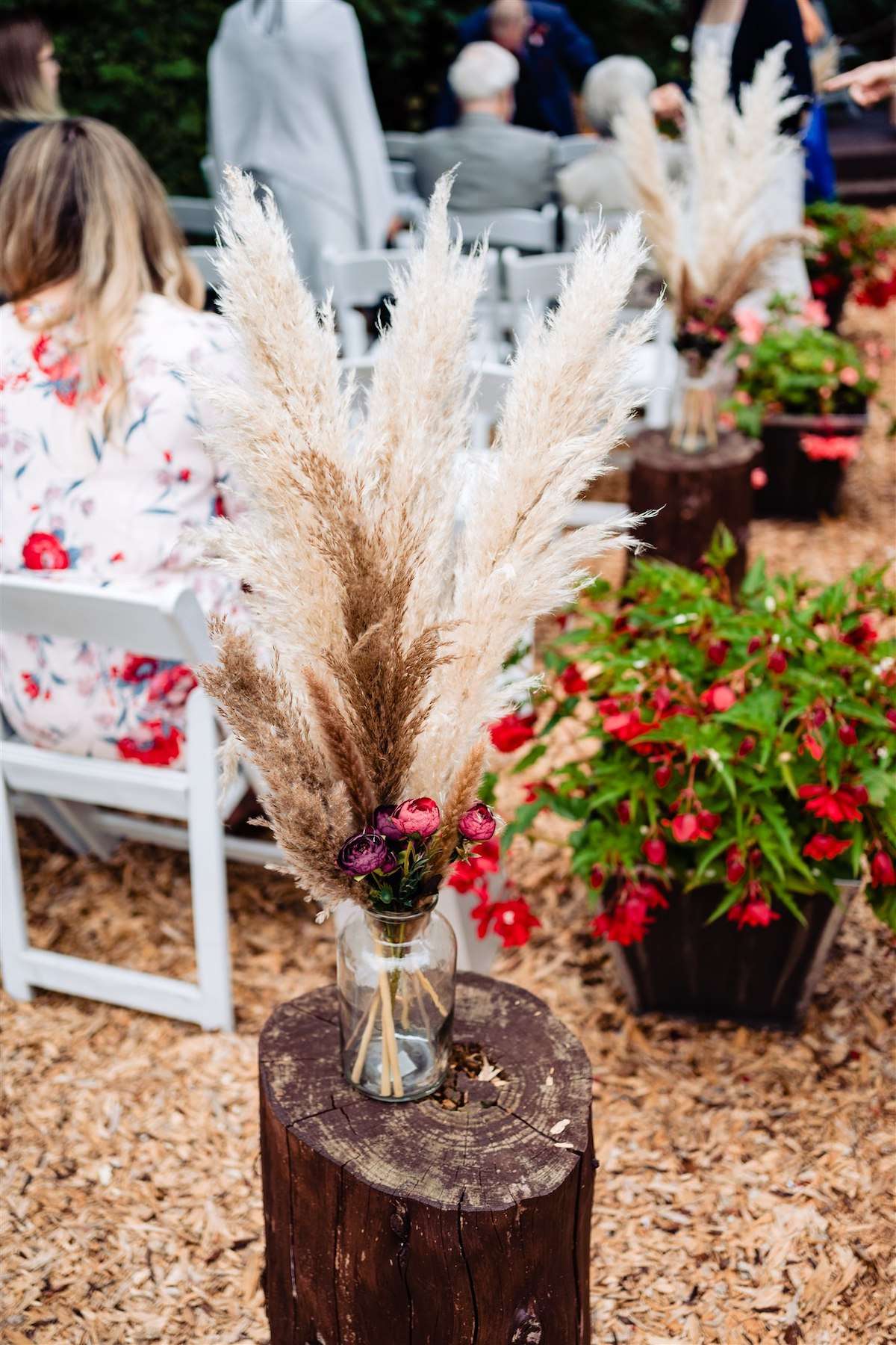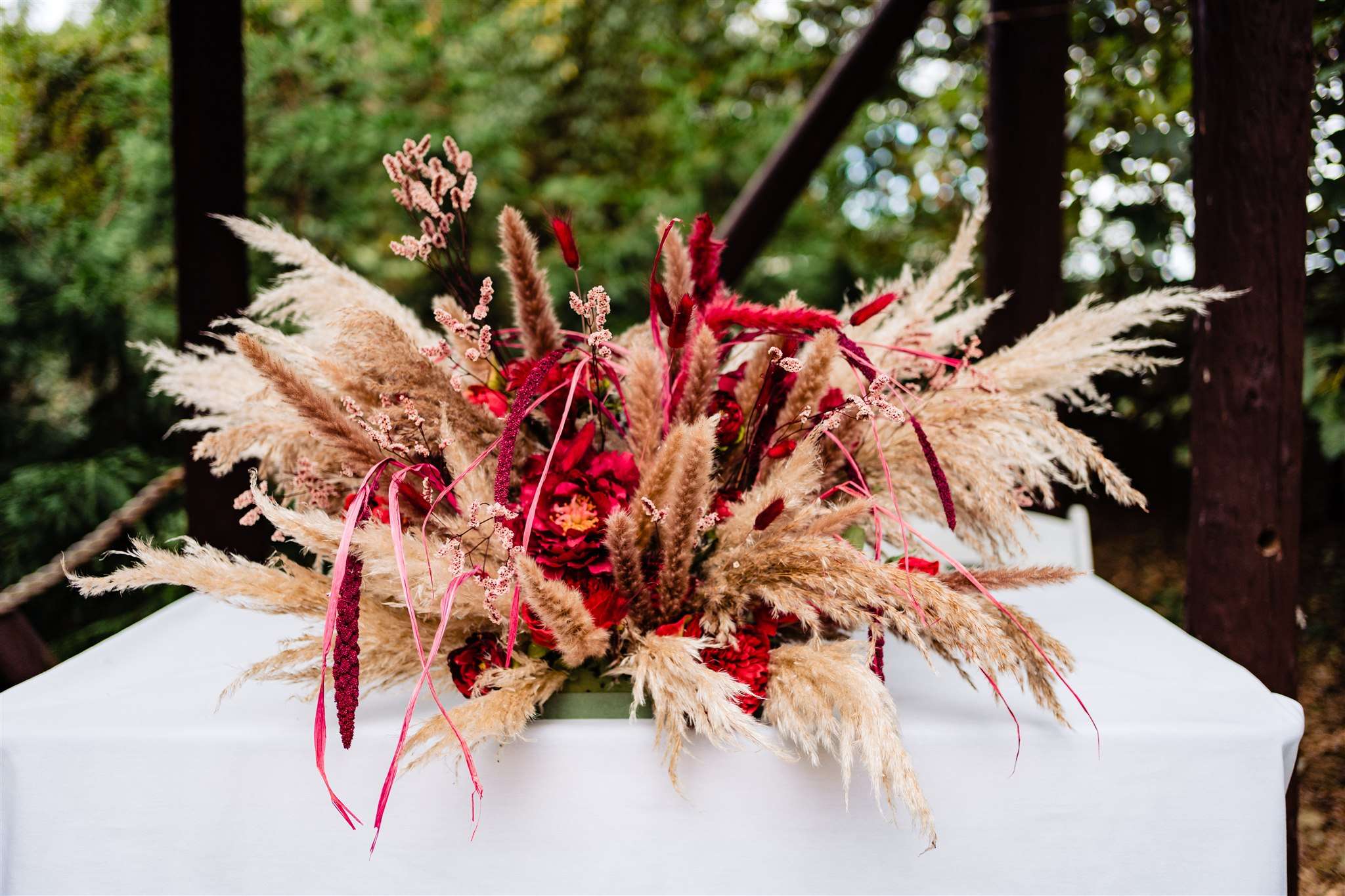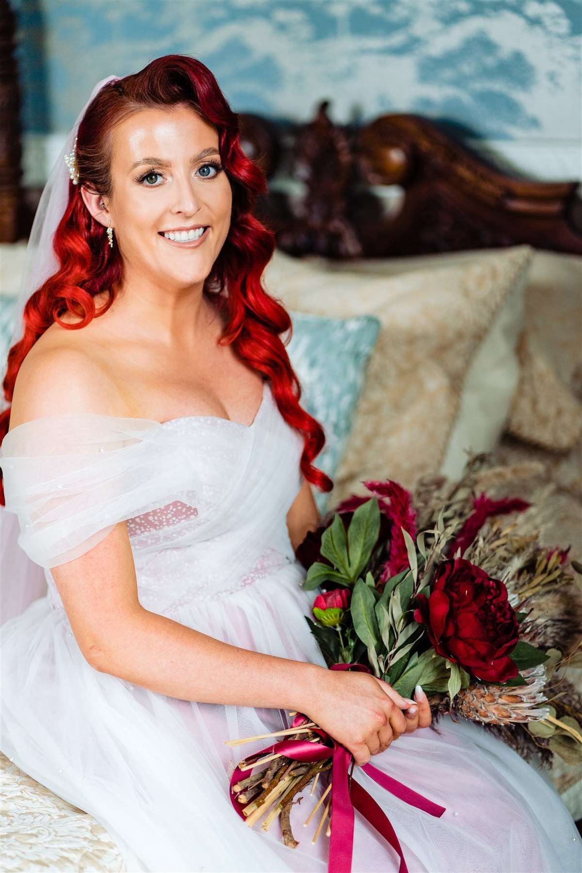 Planning to make around half the décor, Sarah created all the table centrepieces with dried flowers and pampas grass (found on Facebook) as well as the aisle runners to match. Bouquets and buttonholes were homemade, and Sarah even hand-painted her own jacket, as well as the bridesmaids’ pyjamas. Thank you hampers and the ‘bucket list’ guest book completed the impressive DIY list.