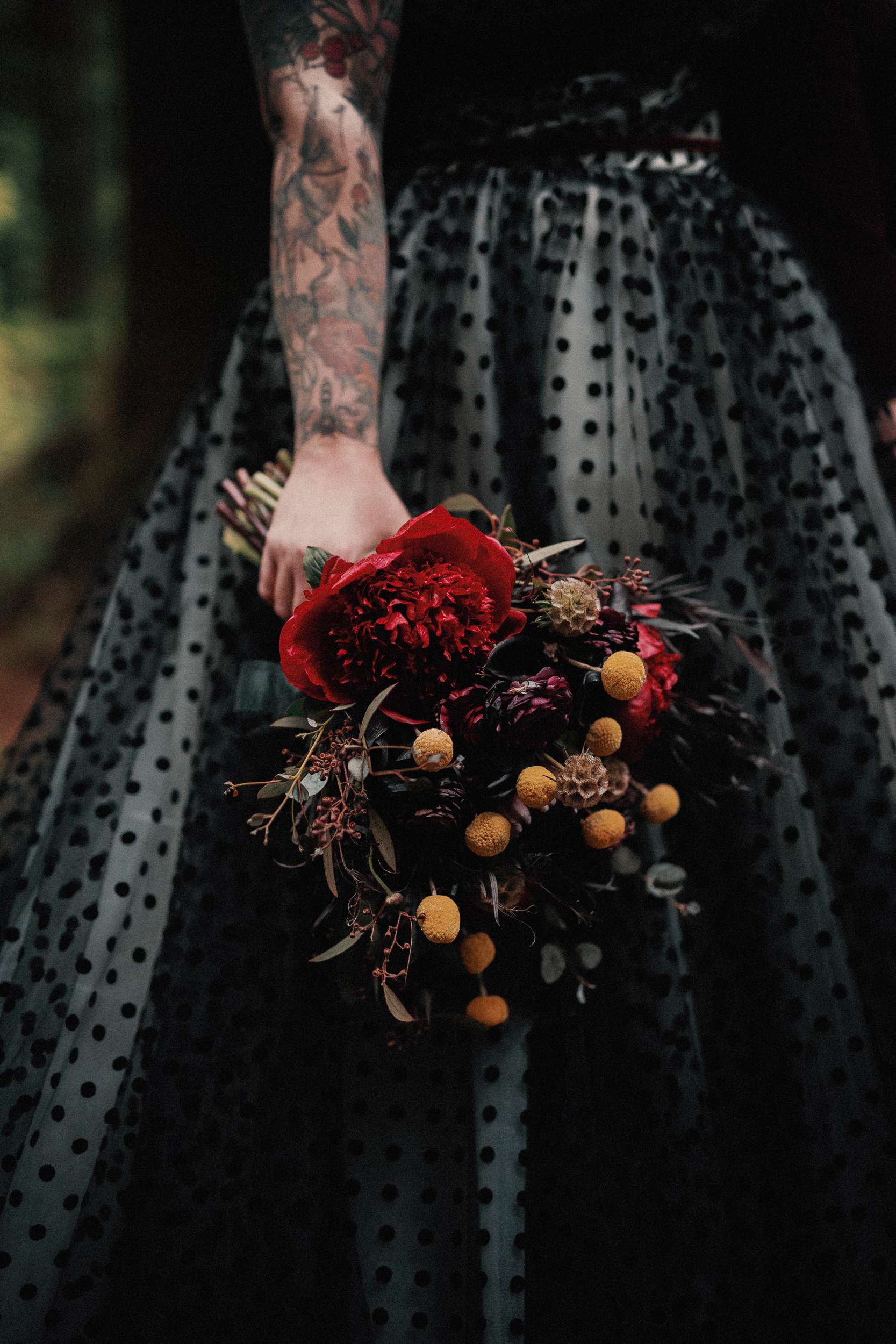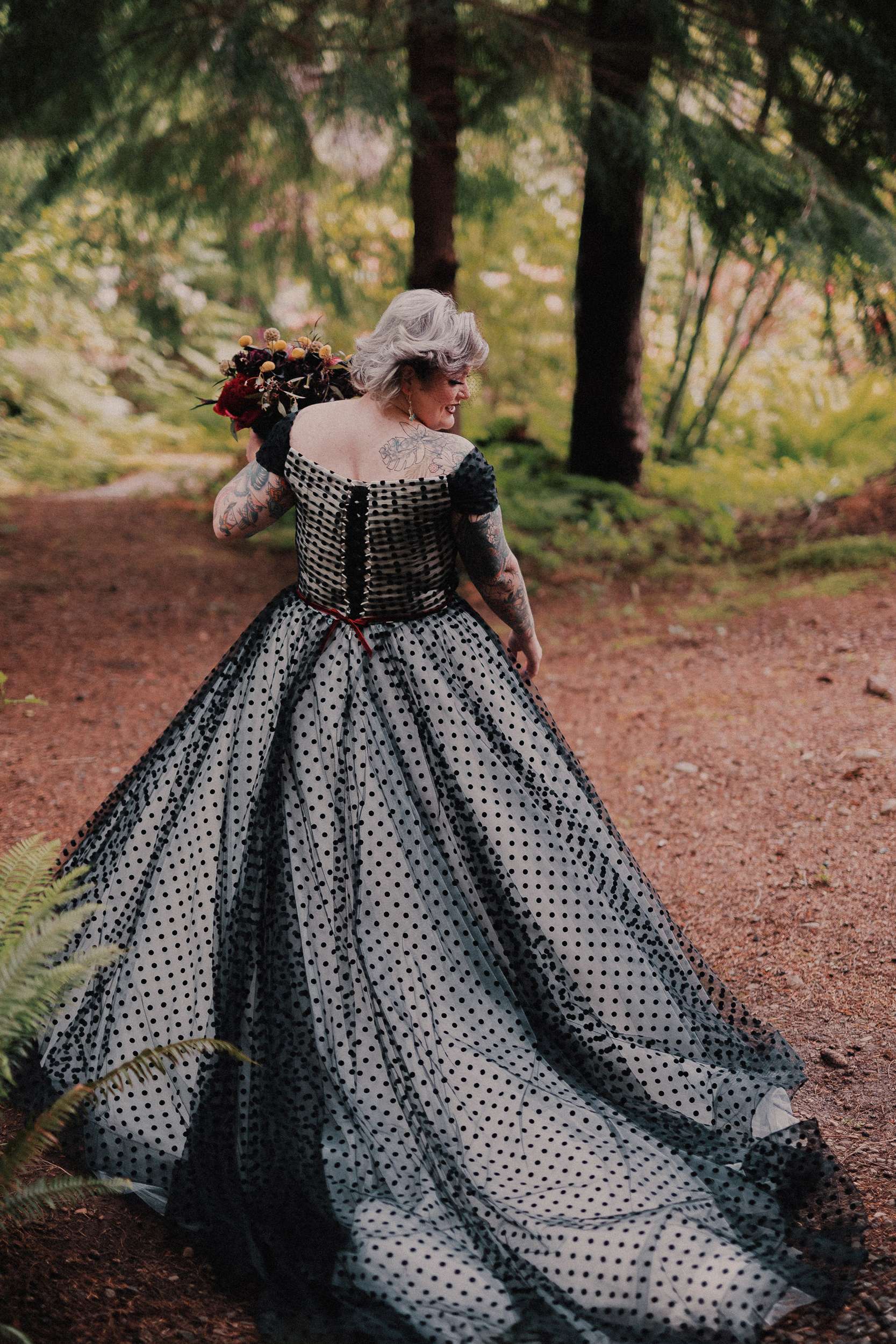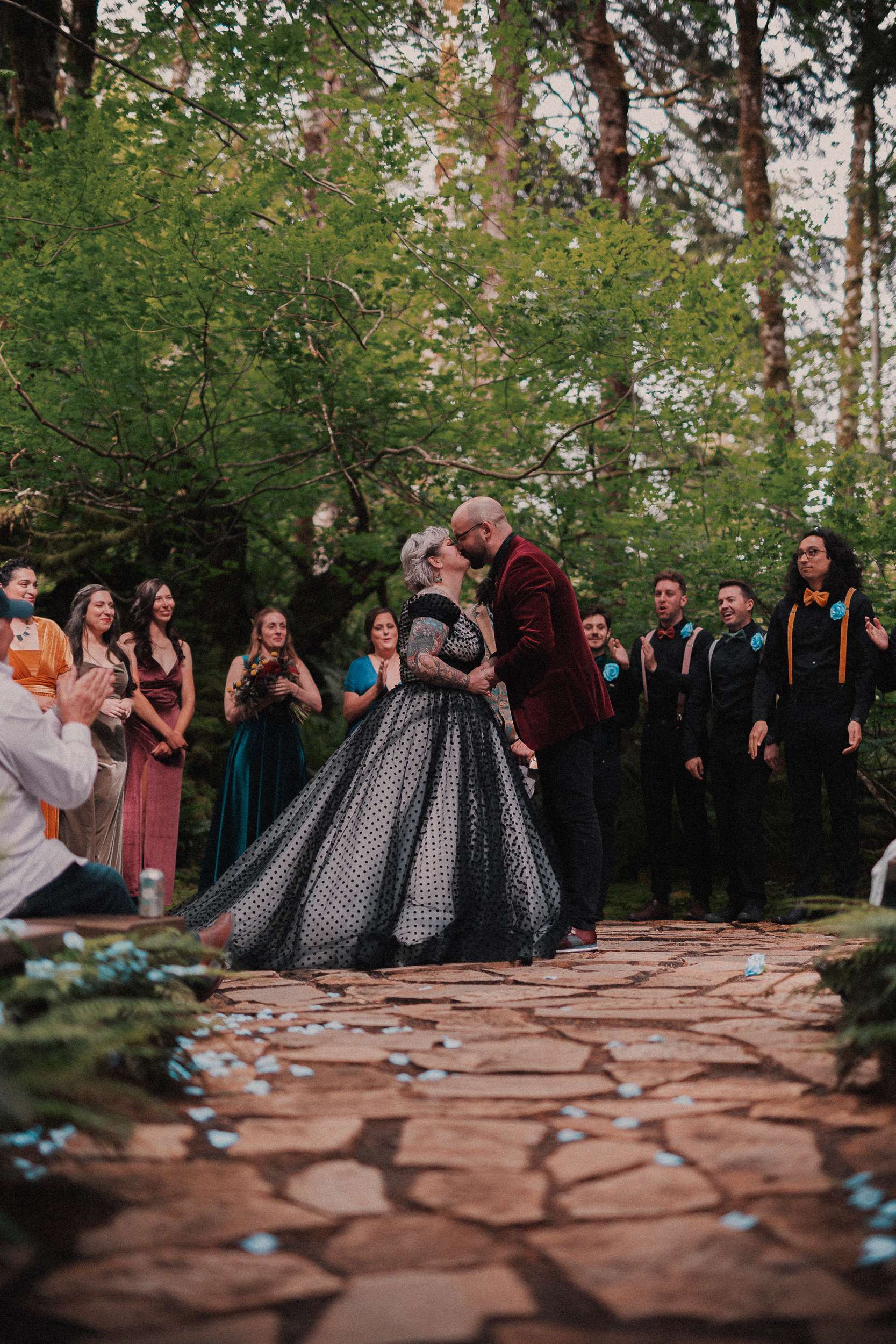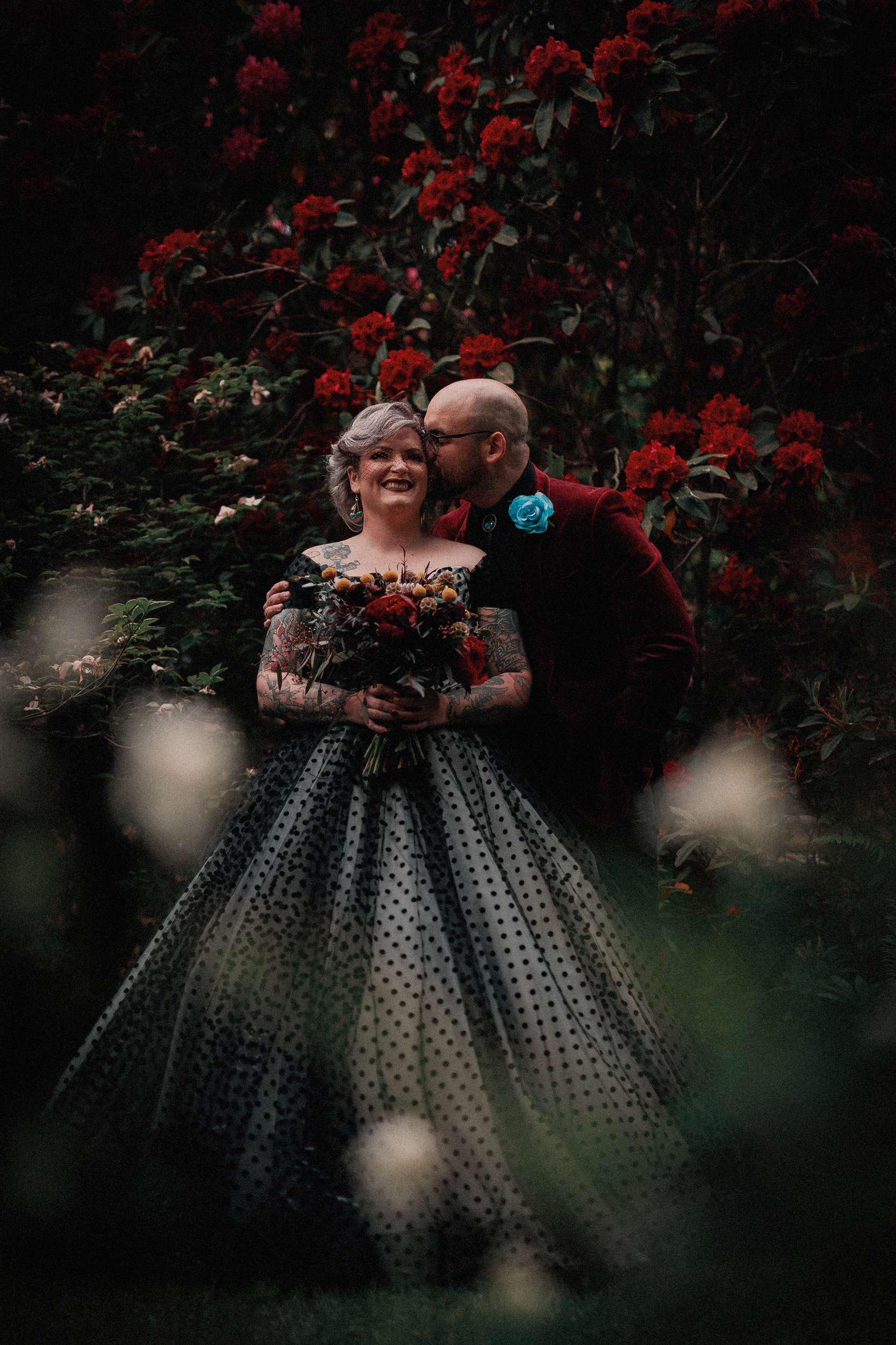The bride wore a custom black polka dot wedding dress with Vans while the groom opted for a deep maroon velvet jacket and black accessories.