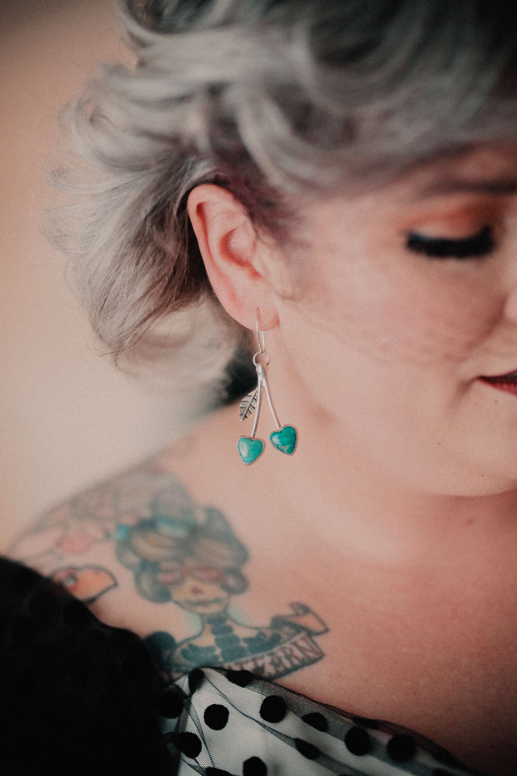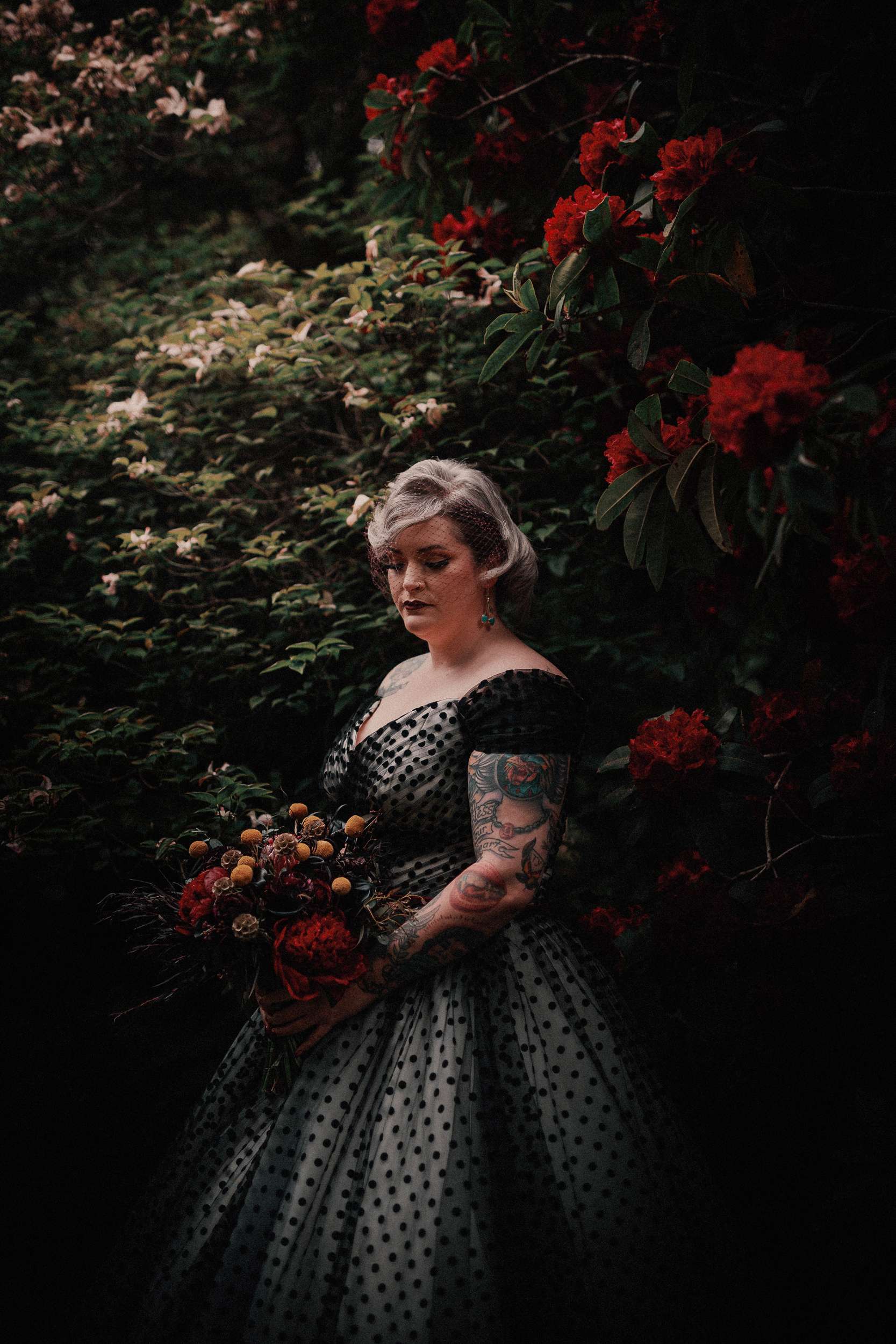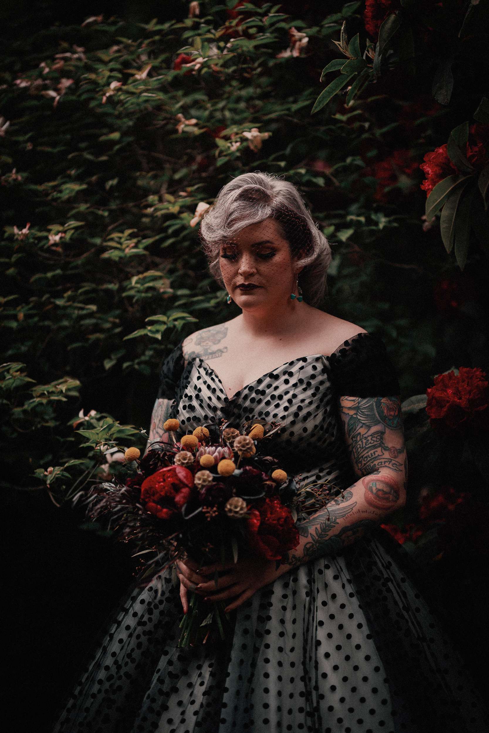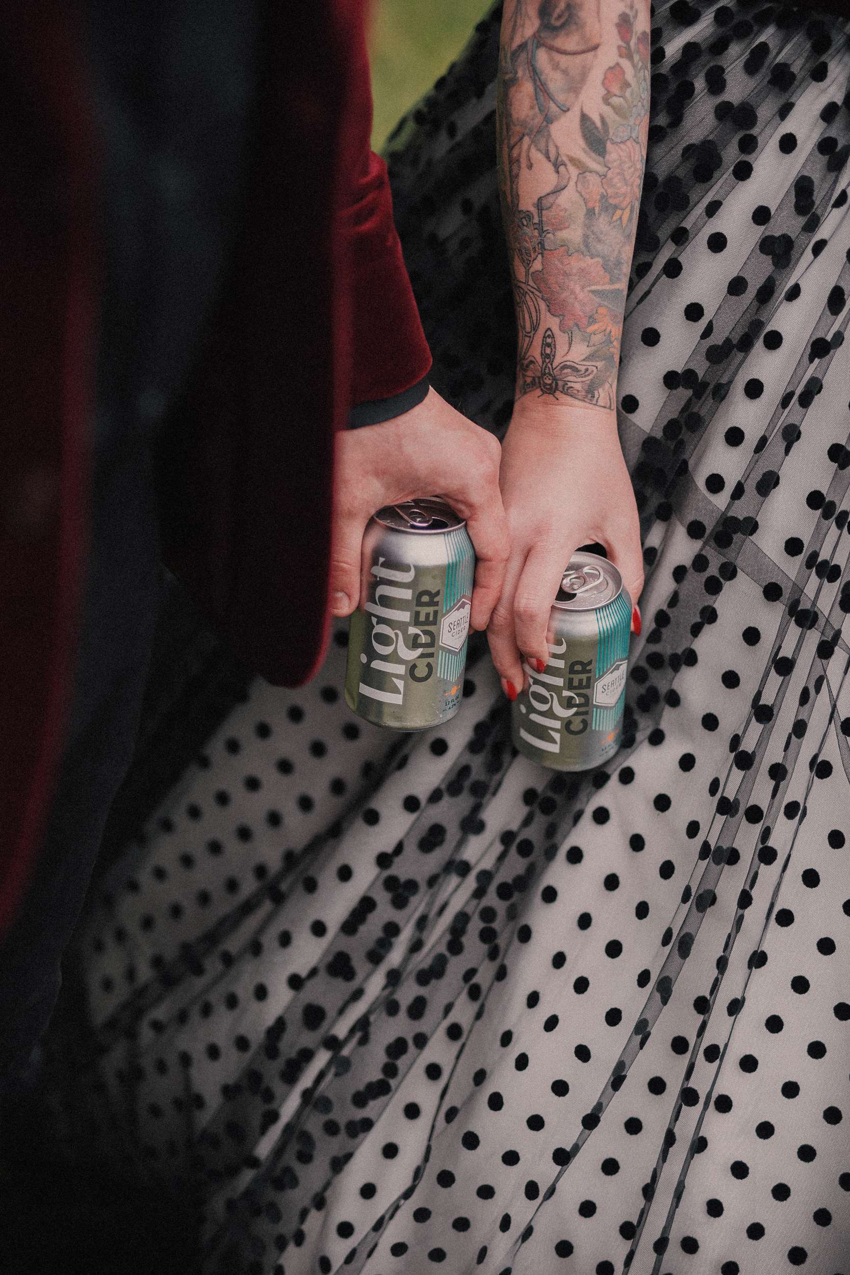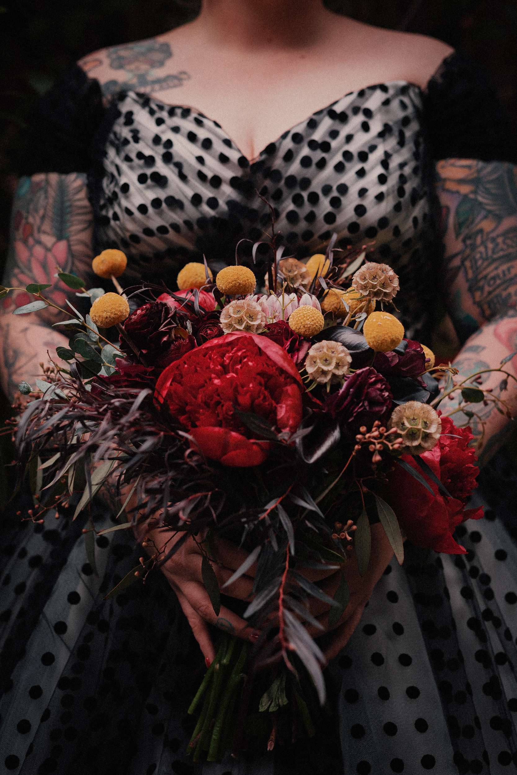 The bride wore a custom black polka dot wedding dress with Vans while the groom opted for a deep maroon velvet jacket and black accessories.