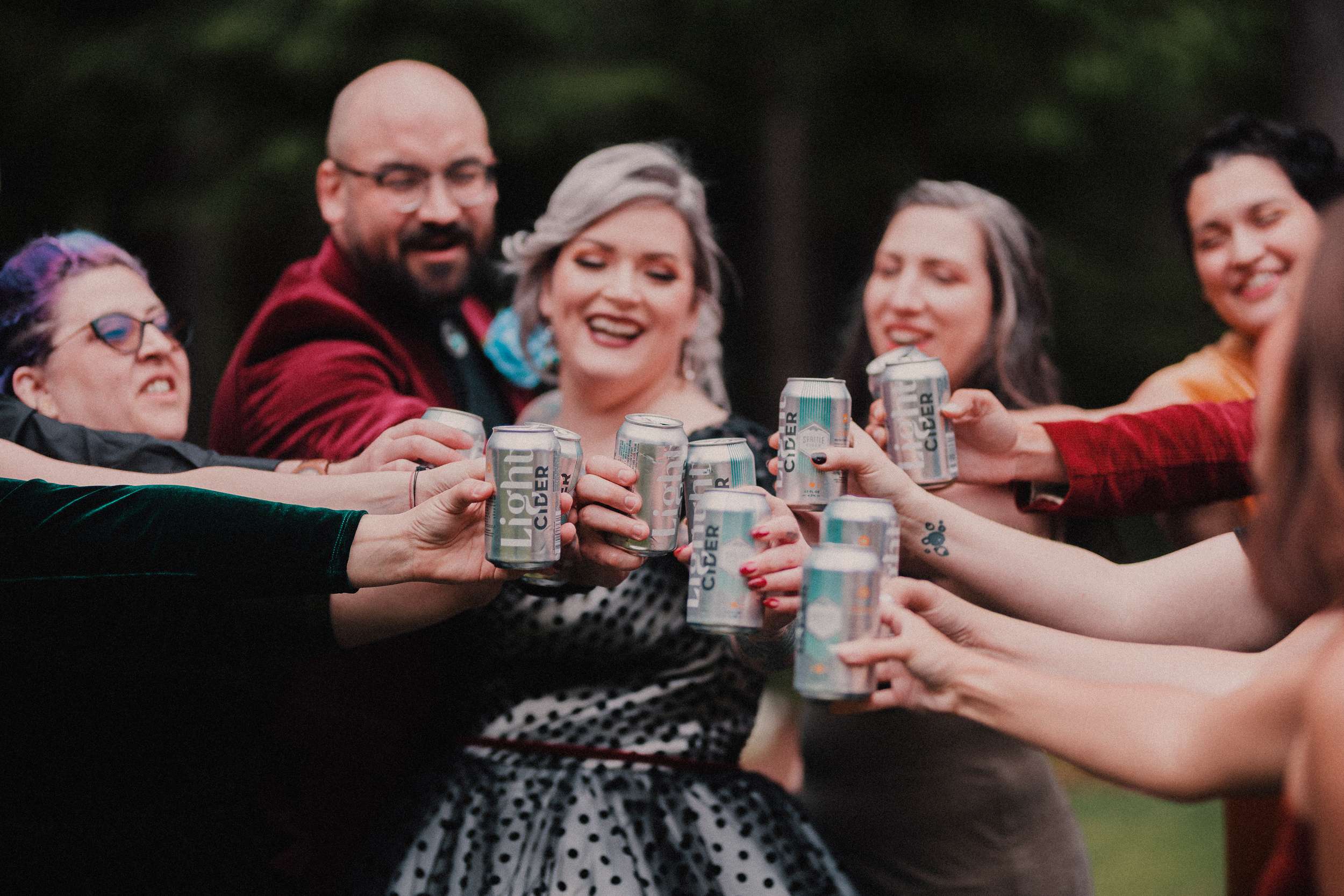 They did away with almost all formalities. Jason danced down the aisle to Sexy Boy, which is Shawn Michael’s WWF theme song. The wedding party (all 18 of them!) followed to Sycamore Trees from the Fire Walk With Me soundtrack, with one bridesmaid and groomsman (who are married) having a showdown on the aisle for who was the better flower girl. They threw blue petals and handed out cans of cider to the guests. Dean then entered to the main Twin Peaks theme.
