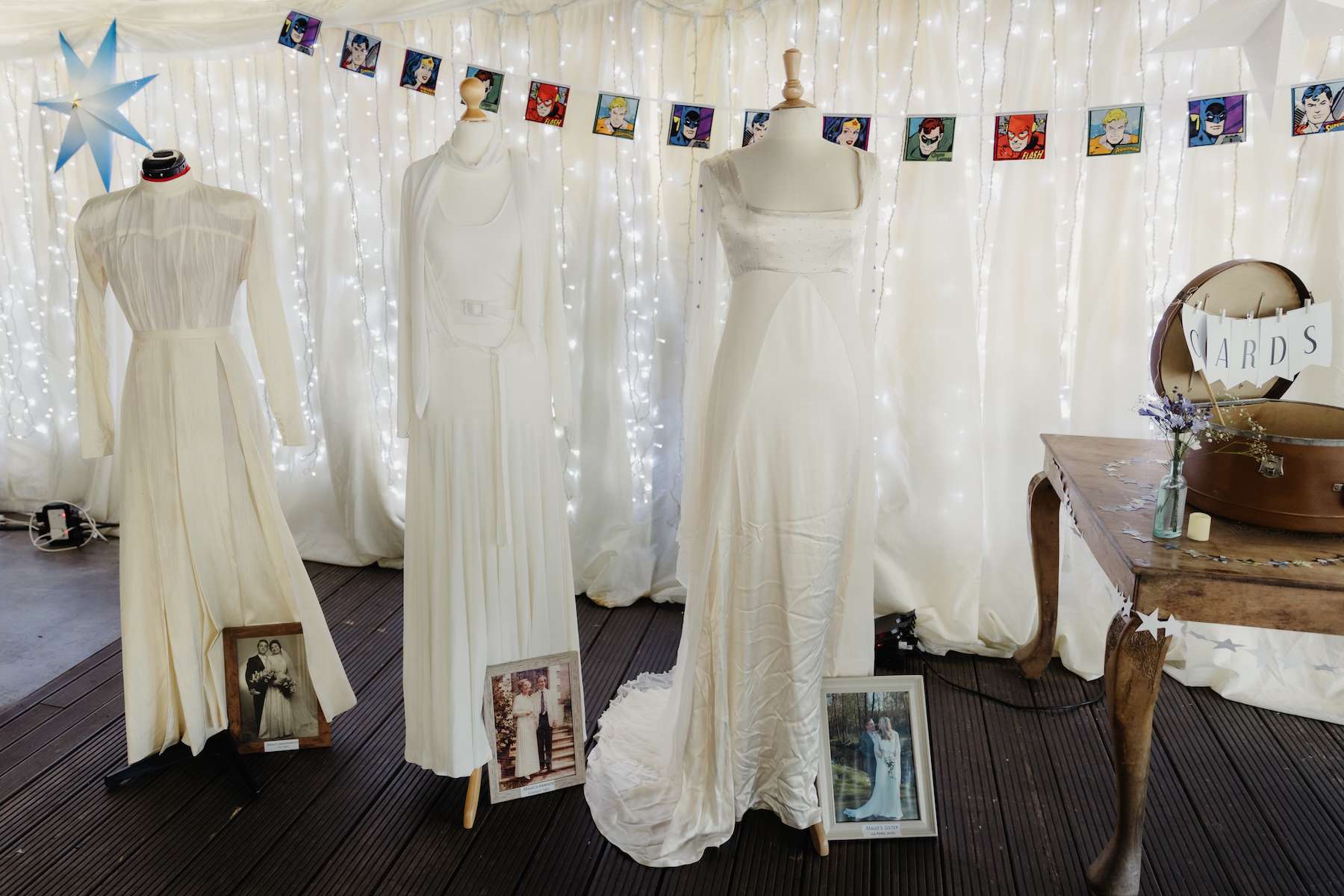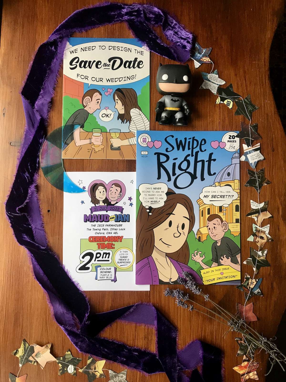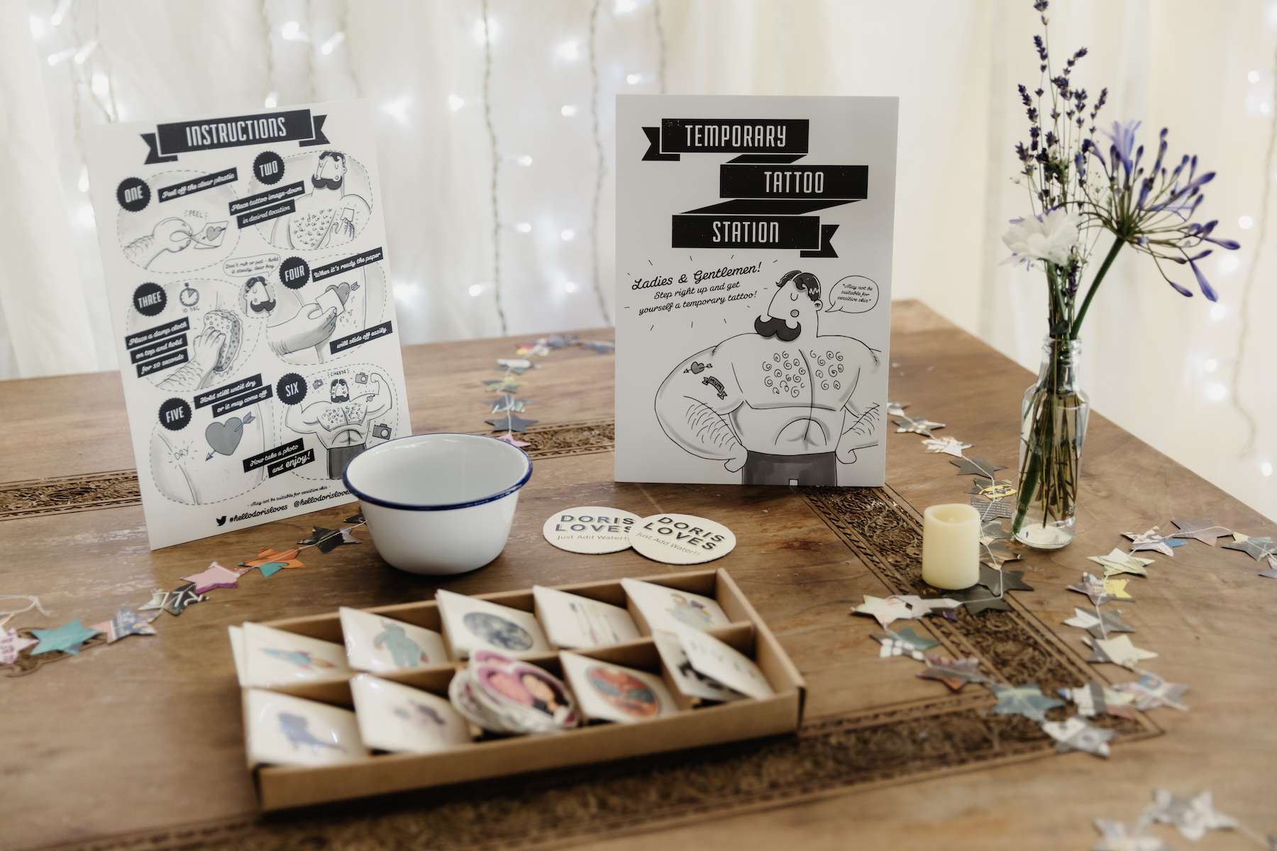 Mixing their passions of vintage and celestial with comics and DC characters, Maud and Ian filled their day with an eclectic mix of the things they love. With their own tattoos providing the inspiration, they made sure to create temporary tattoos to match the theme, so their guests could enjoy them as well.