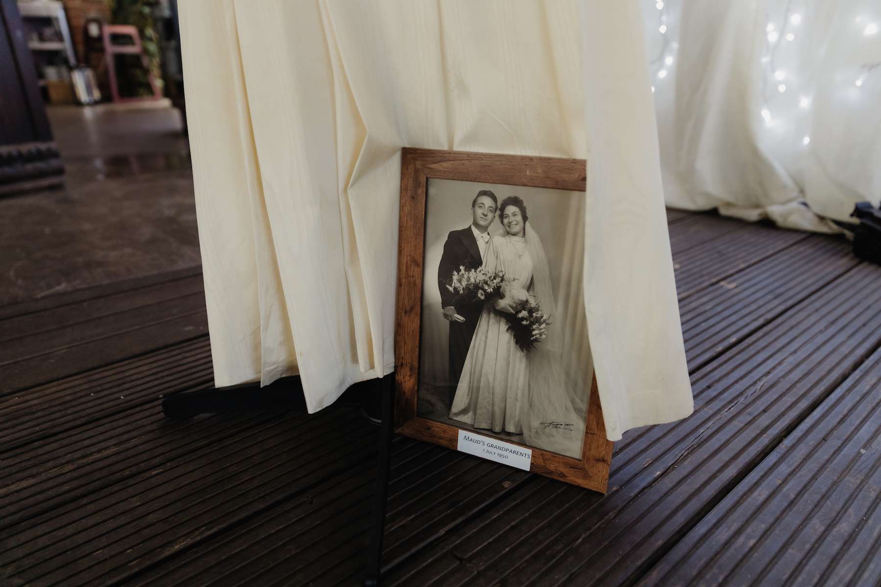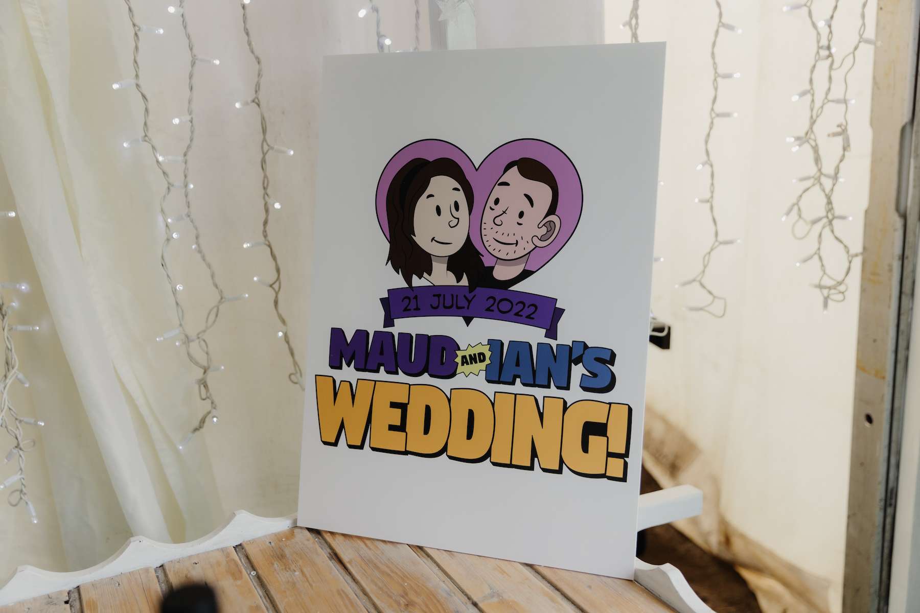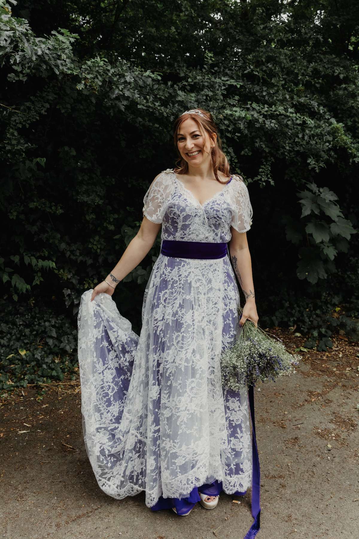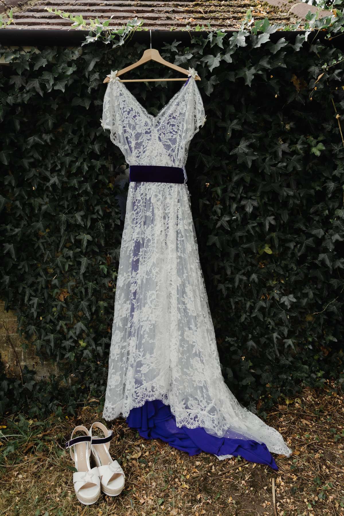 As a bridal designer, Maud was keen to add some special touches to the day, incorporating her grandma, mum and sister’s wedding dresses at the venue, as a tribute to the women in her life. They chose a navy and purple colour scheme, which most of the guests stuck to, and Maud designed her own dress, which her business partner then made for her. With purple lining, a layer of tulle with moons and stars, a layer of French lace and a purple belt ensured her look was unique. Little satin flowers from her grandma’s communion dress were carefully stitched to the belt, for another precious touch.