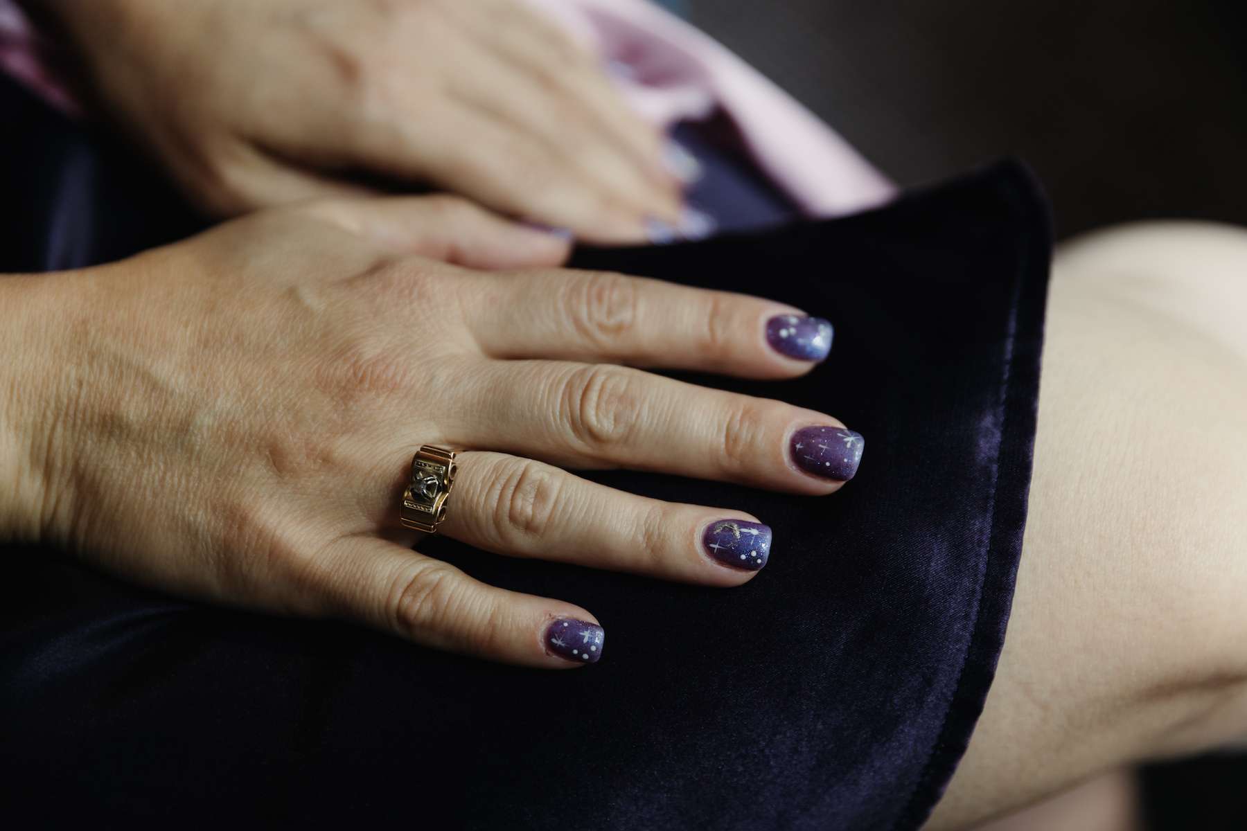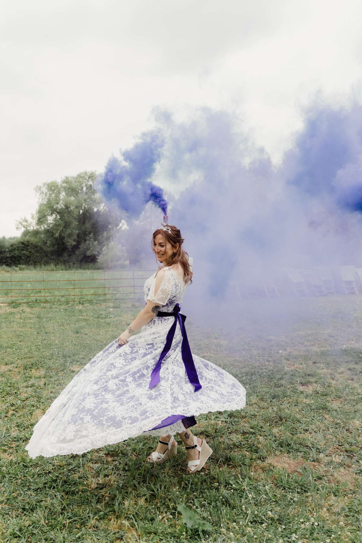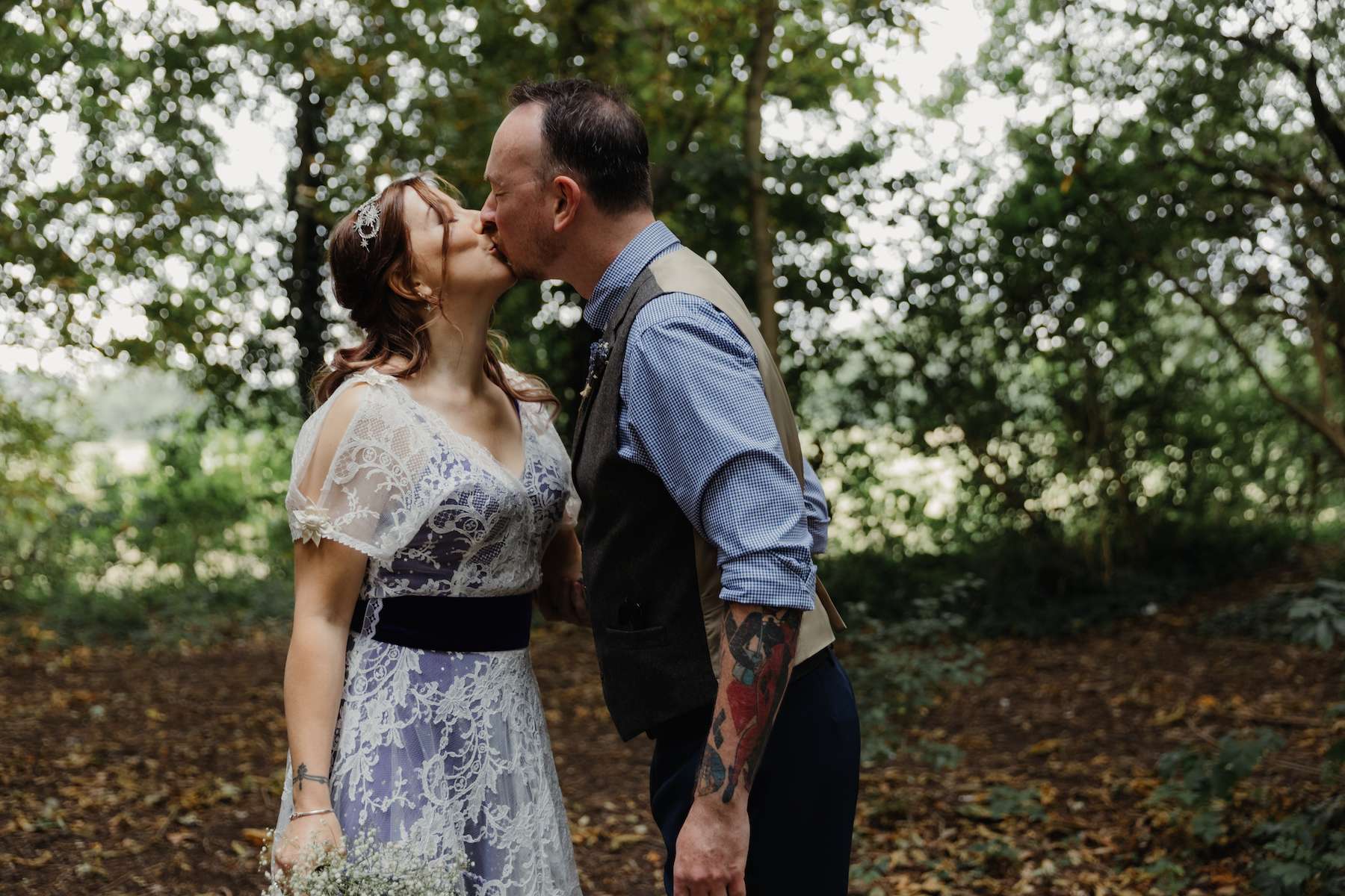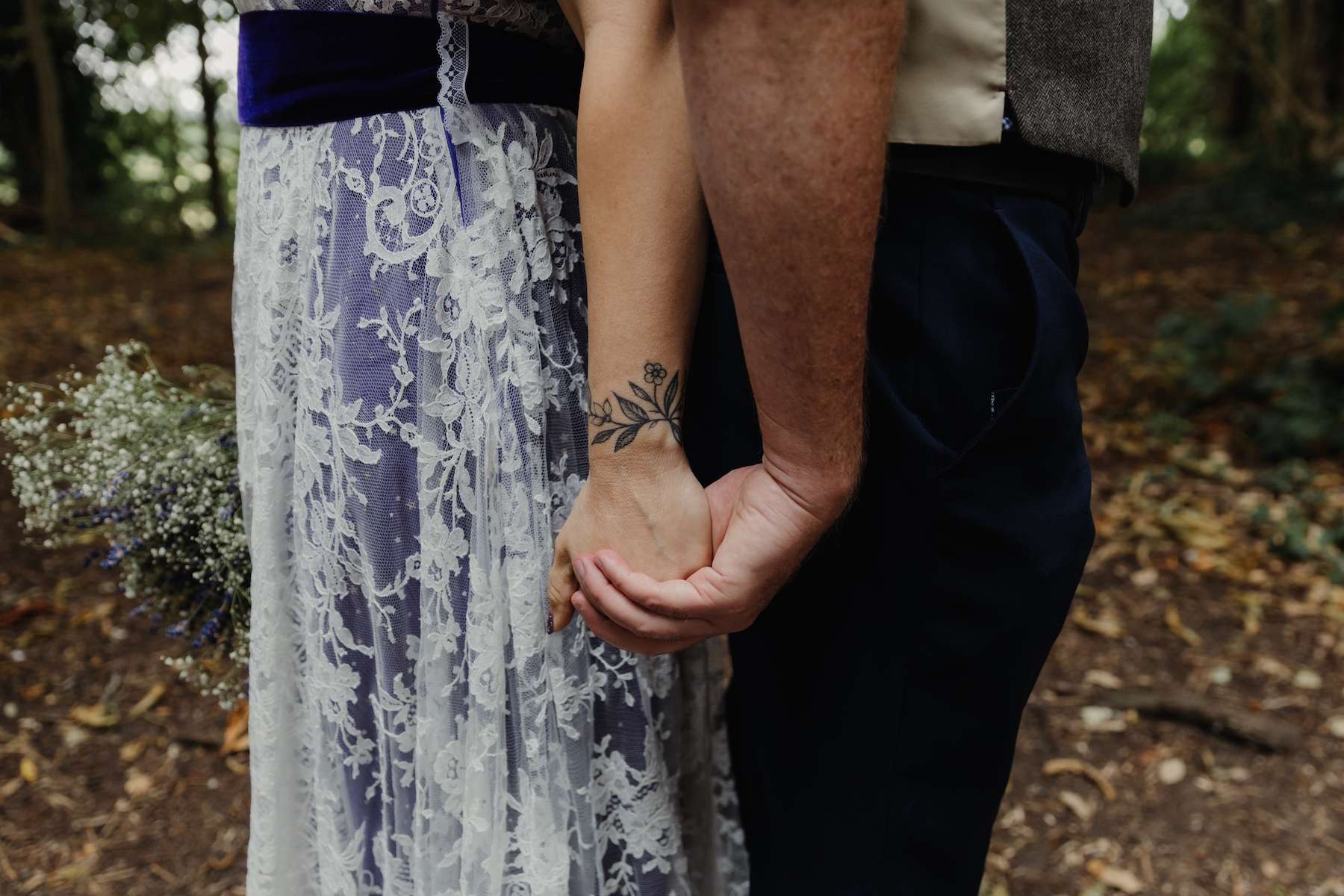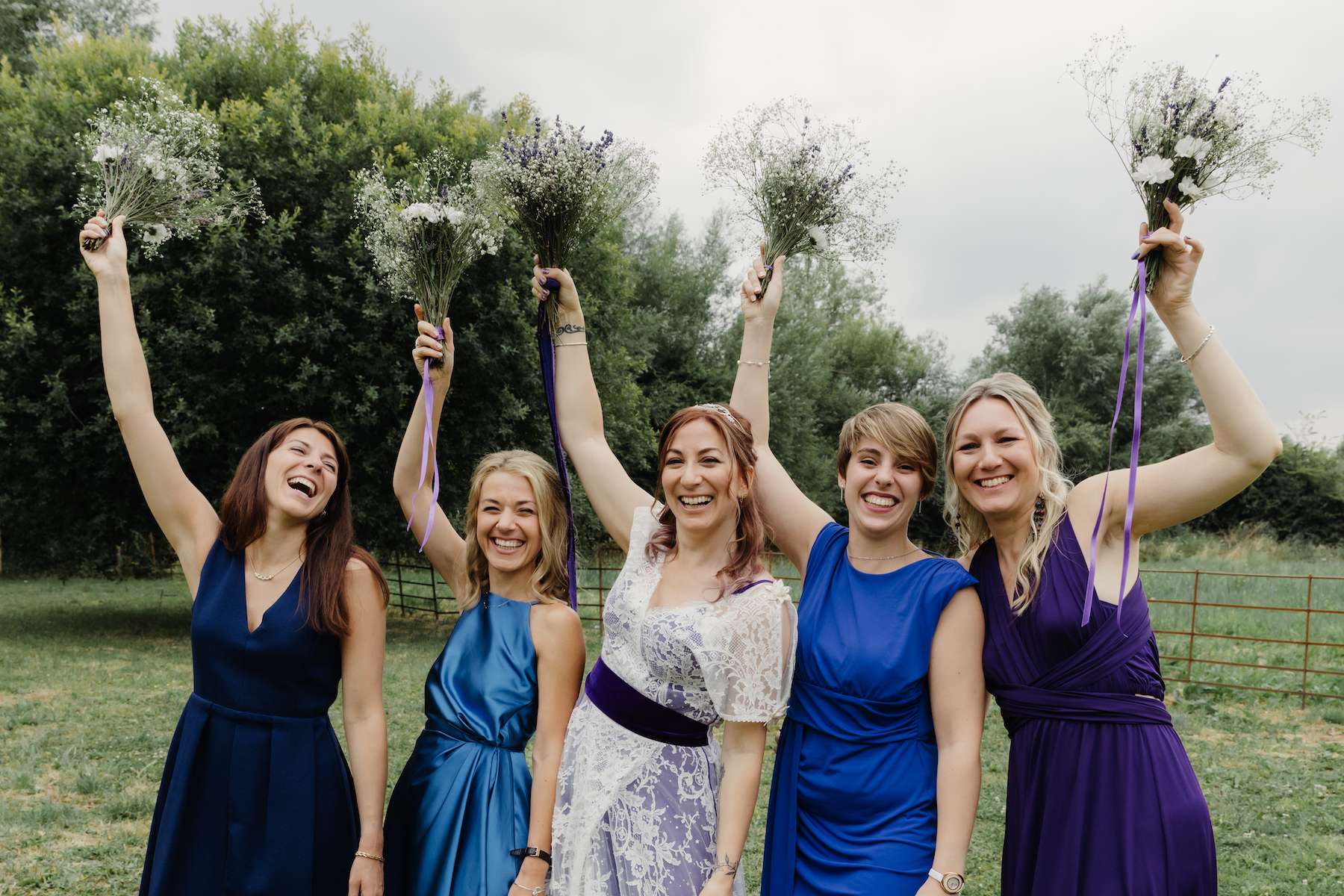 As a bridal designer, Maud was keen to add some special touches to the day, incorporating her grandma, mum and sister’s wedding dresses at the venue, as a tribute to the women in her life. They chose a navy and purple colour scheme, which most of the guests stuck to, and Maud designed her own dress, which her business partner then made for her. With purple lining, a layer of tulle with moons and stars, a layer of French lace and a purple belt ensured her look was unique. Little satin flowers from her grandma’s communion dress were carefully stitched to the belt, for another precious touch.