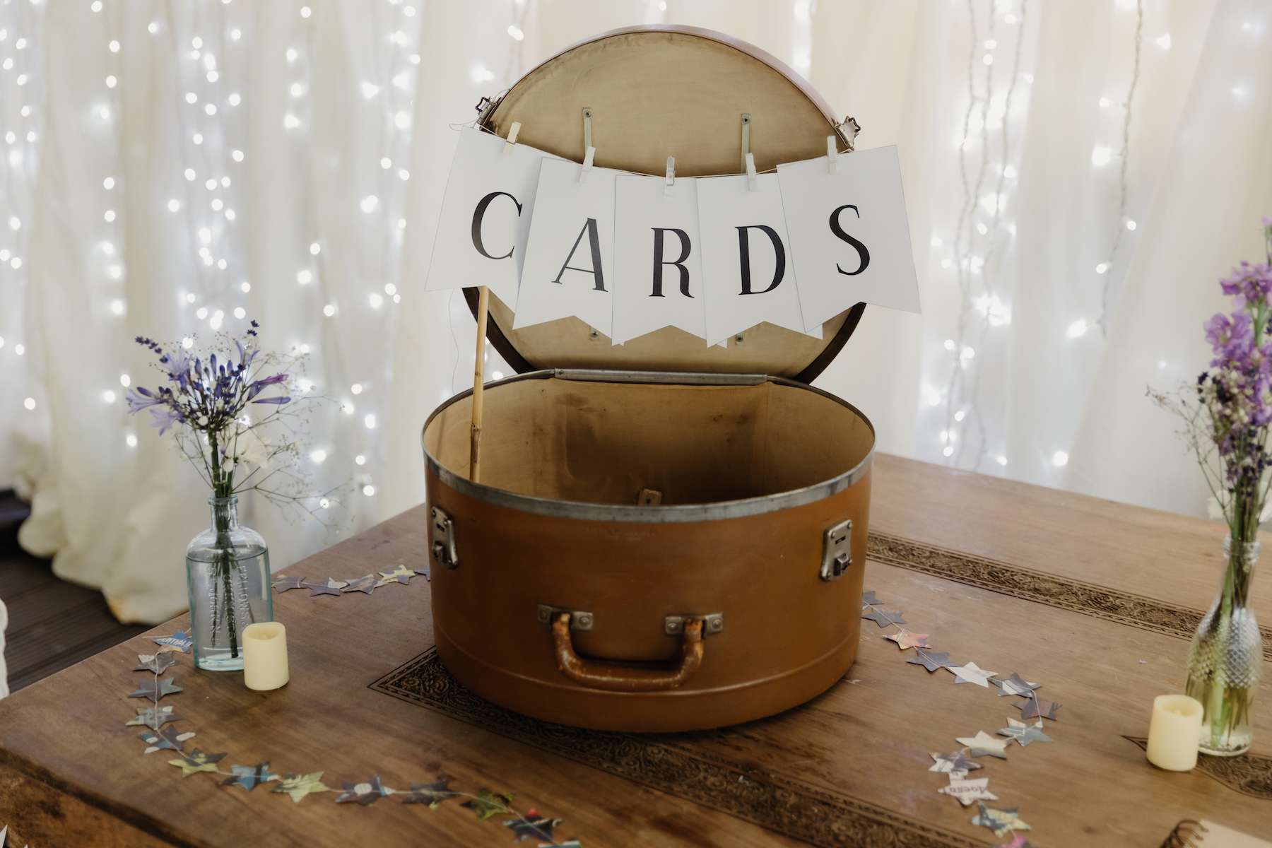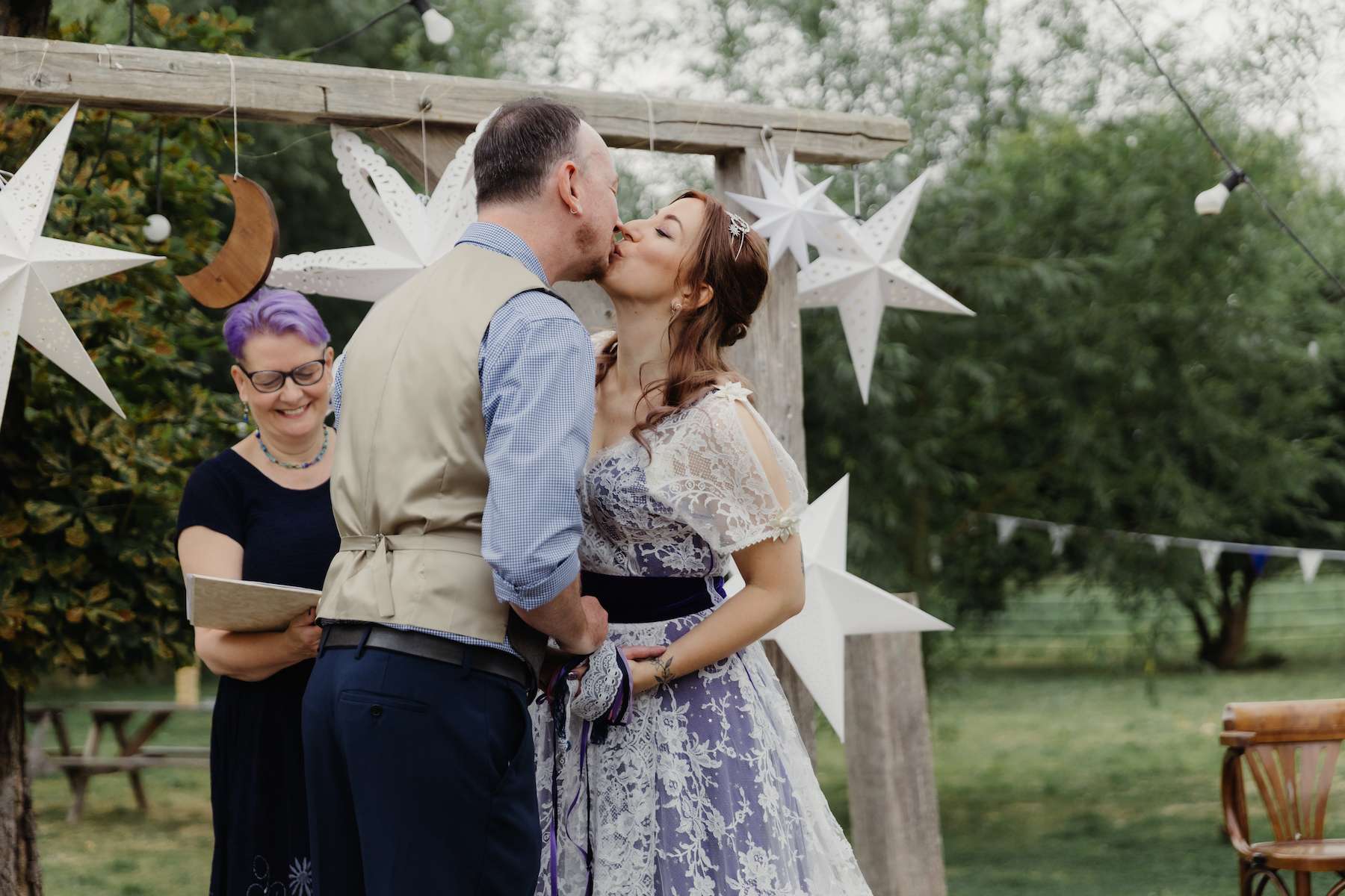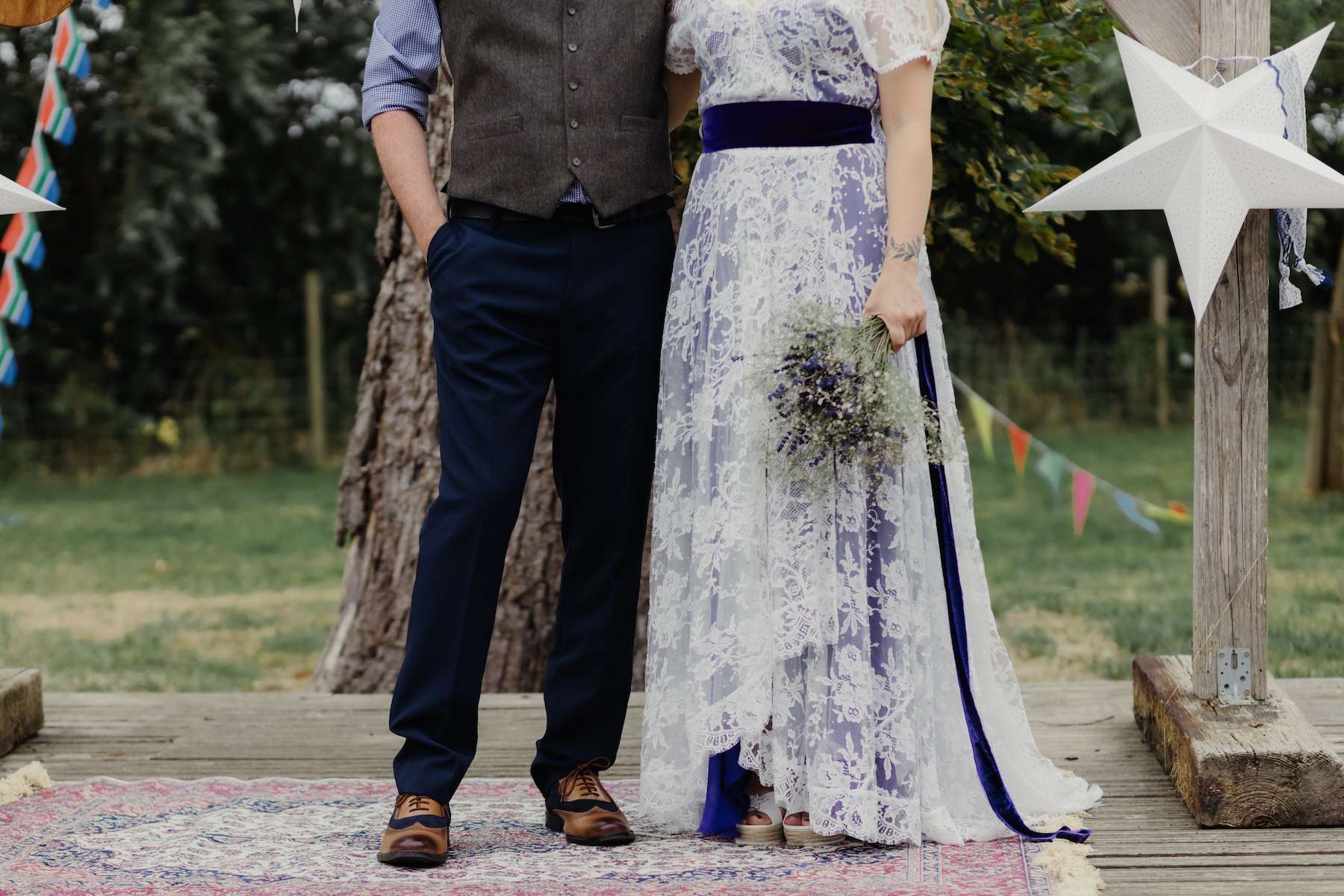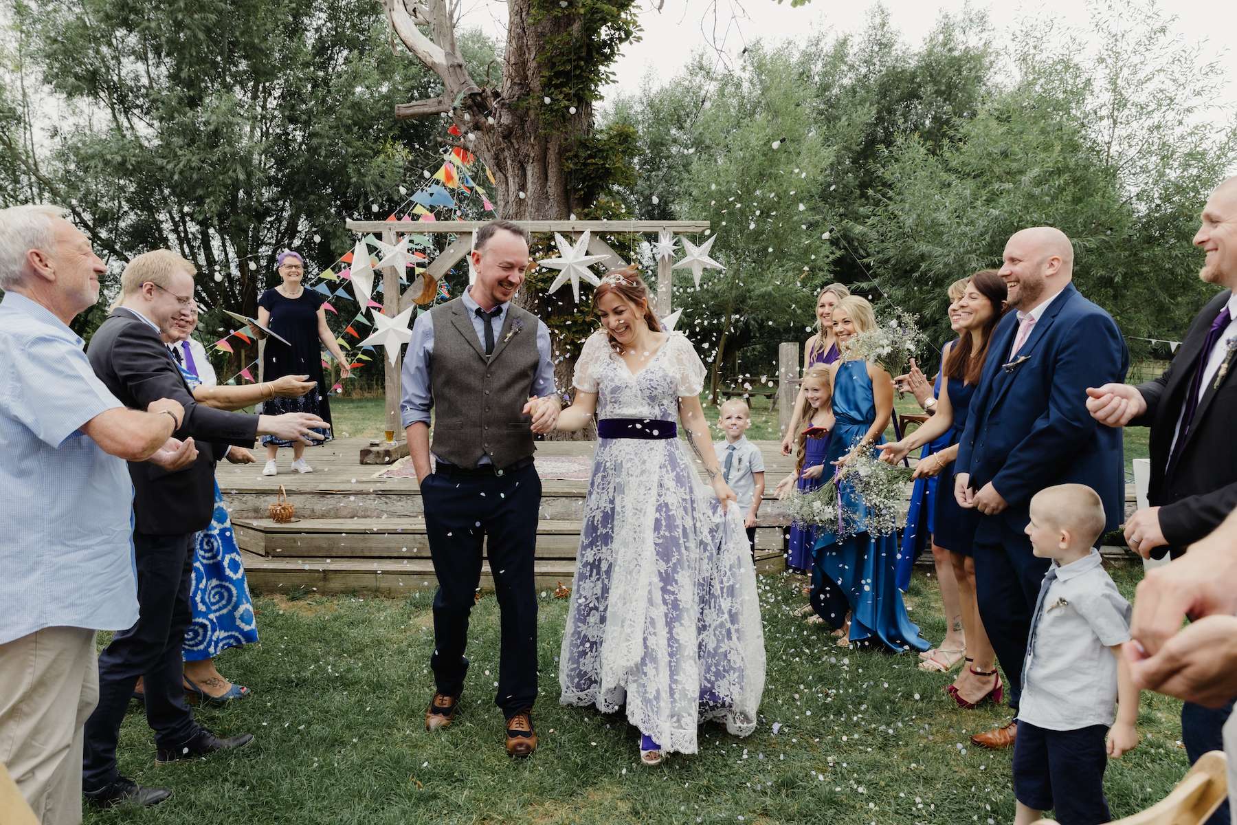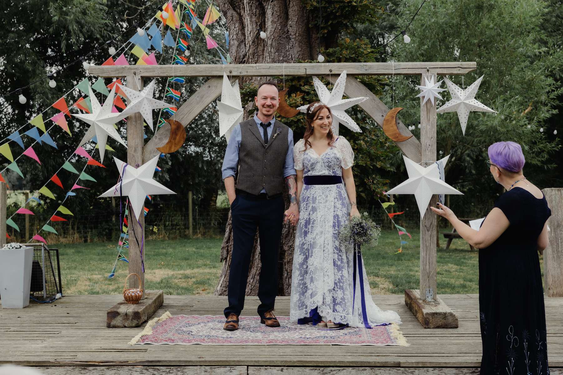 Maud and Ian’s budget was £5,000, and they were keen to have a sustainable wedding, opting for vegetarian food and making careful décor choices. Paper stars were bought in the sale, and toys for the tables purchased second hand from charity shops and eBay. DIY elements included all the bunting and the wooden moons for the arch. They also saved money by not hiring a florist, spending just £50 on supermarket gypsophila and picking lavender from their garden which they combined for the bouquets.