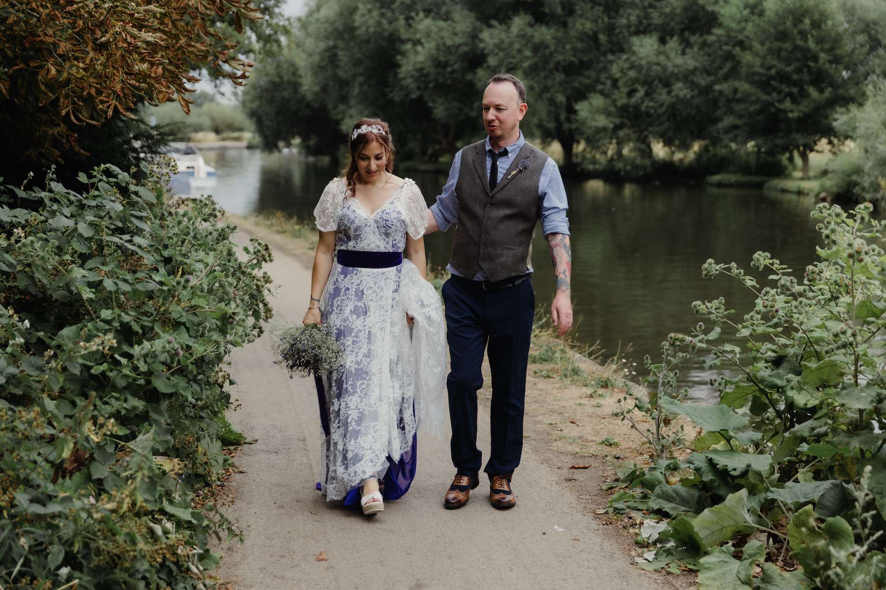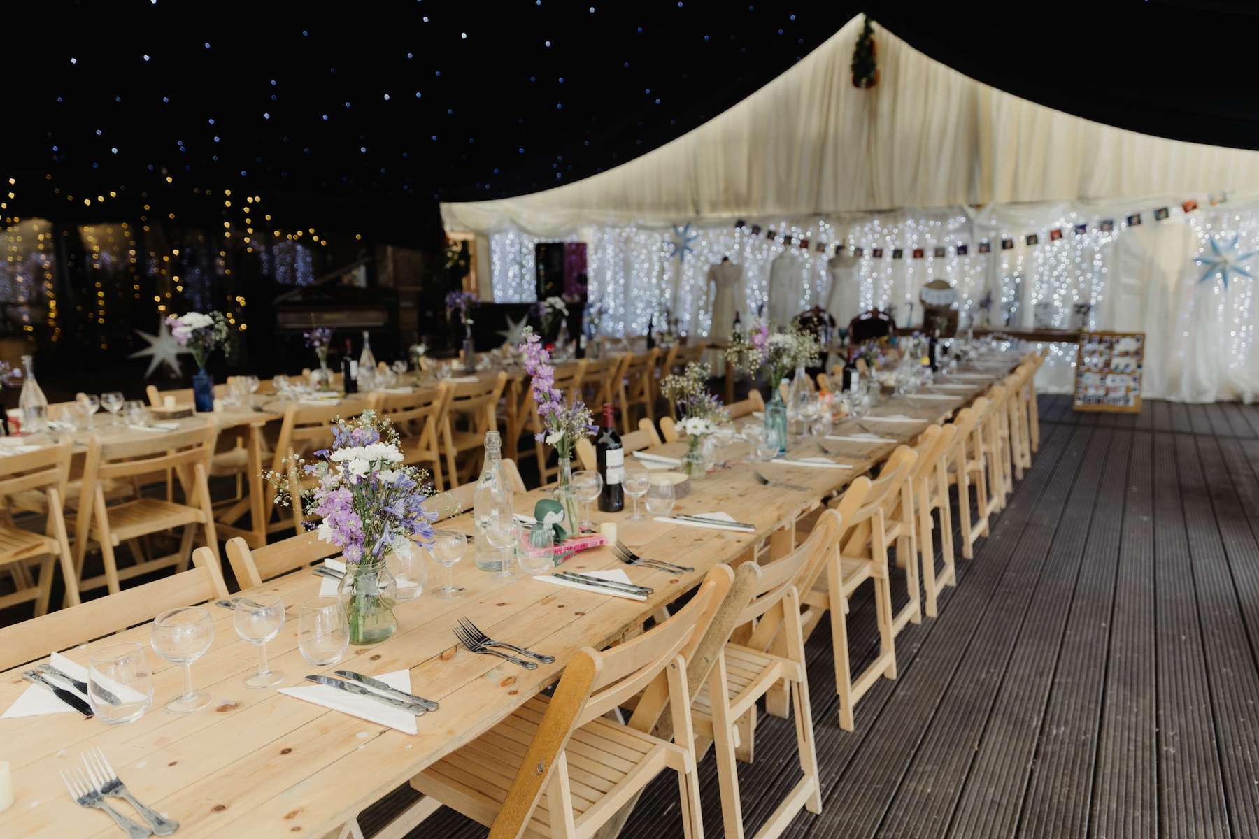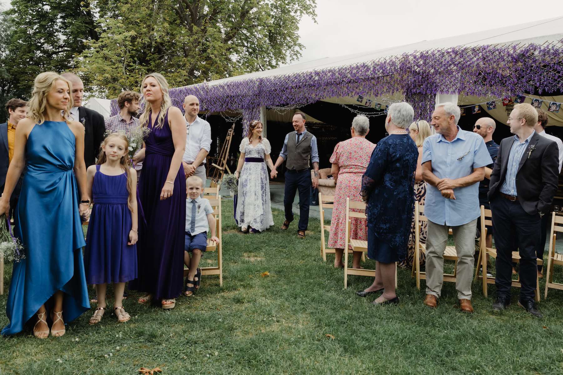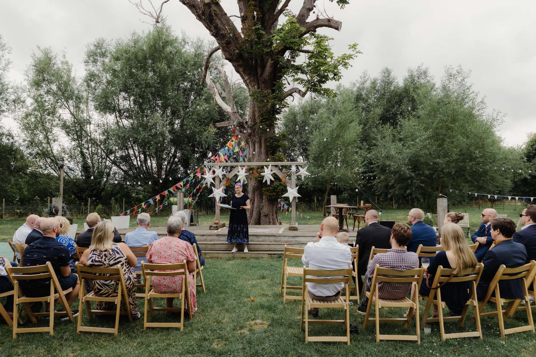 Maud and Ian’s budget was £5,000, and they were keen to have a sustainable wedding, opting for vegetarian food and making careful décor choices. Paper stars were bought in the sale, and toys for the tables purchased second hand from charity shops and eBay. DIY elements included all the bunting and the wooden moons for the arch. They also saved money by not hiring a florist, spending just £50 on supermarket gypsophila and picking lavender from their garden which they combined for the bouquets.