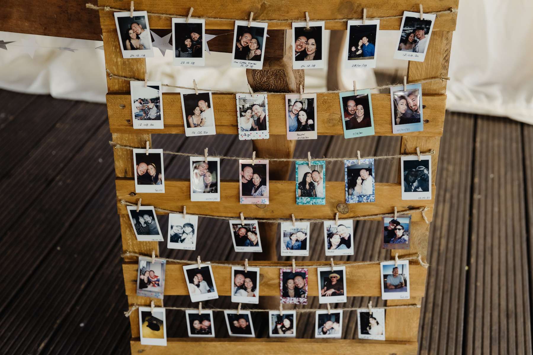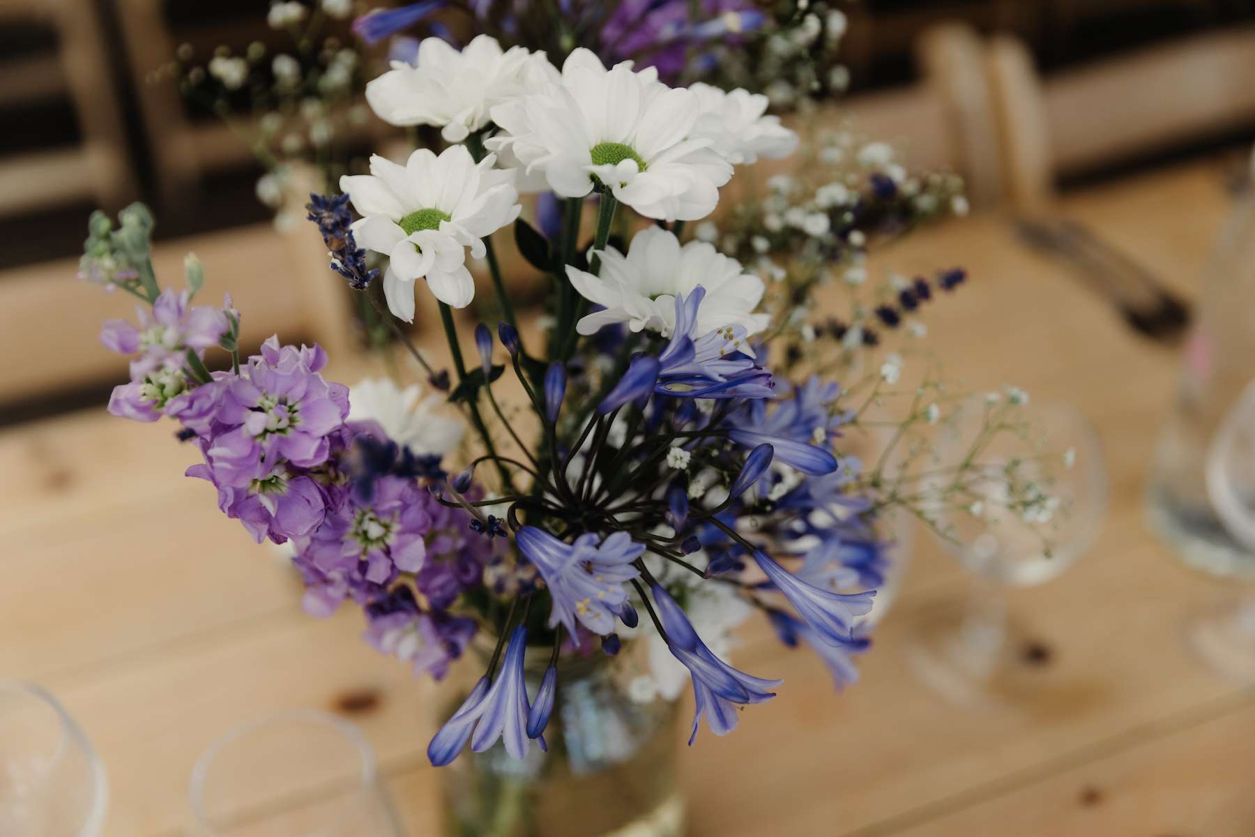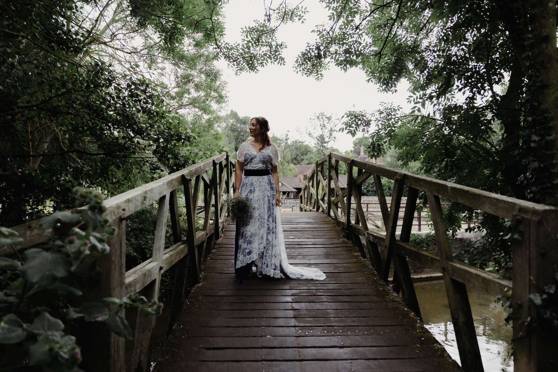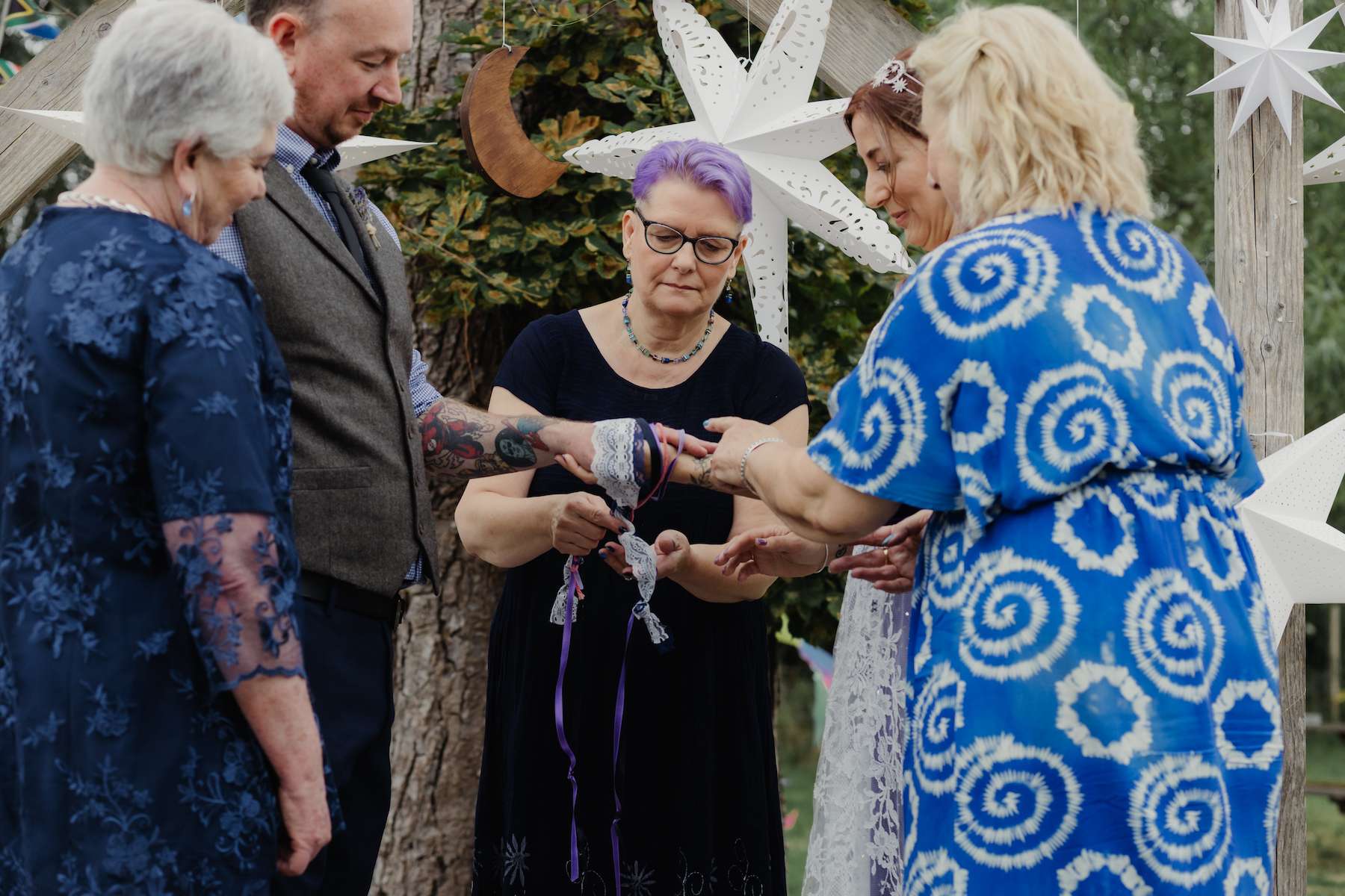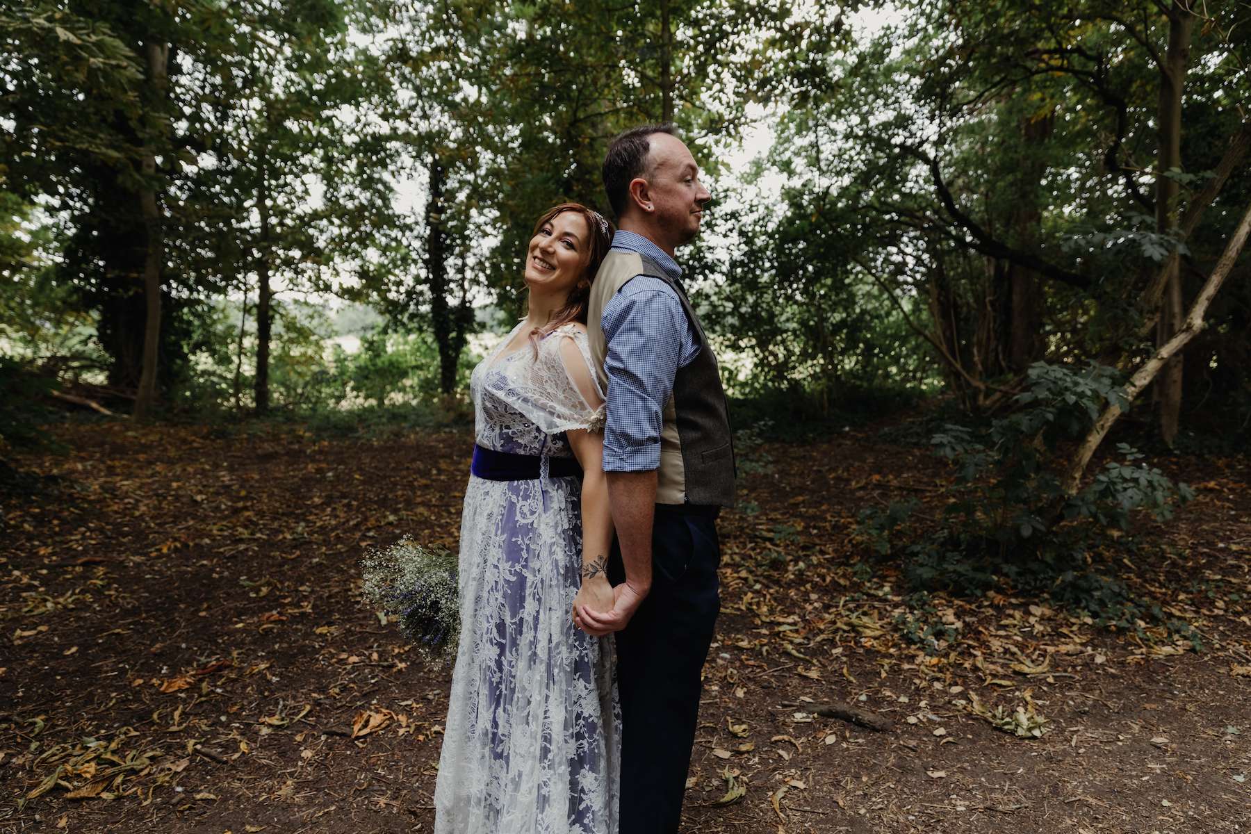 Maud and Ian’s budget was £5,000, and they were keen to have a sustainable wedding, opting for vegetarian food and making careful décor choices. Paper stars were bought in the sale, and toys for the tables purchased second hand from charity shops and eBay. DIY elements included all the bunting and the wooden moons for the arch. They also saved money by not hiring a florist, spending just £50 on supermarket gypsophila and picking lavender from their garden which they combined for the bouquets.