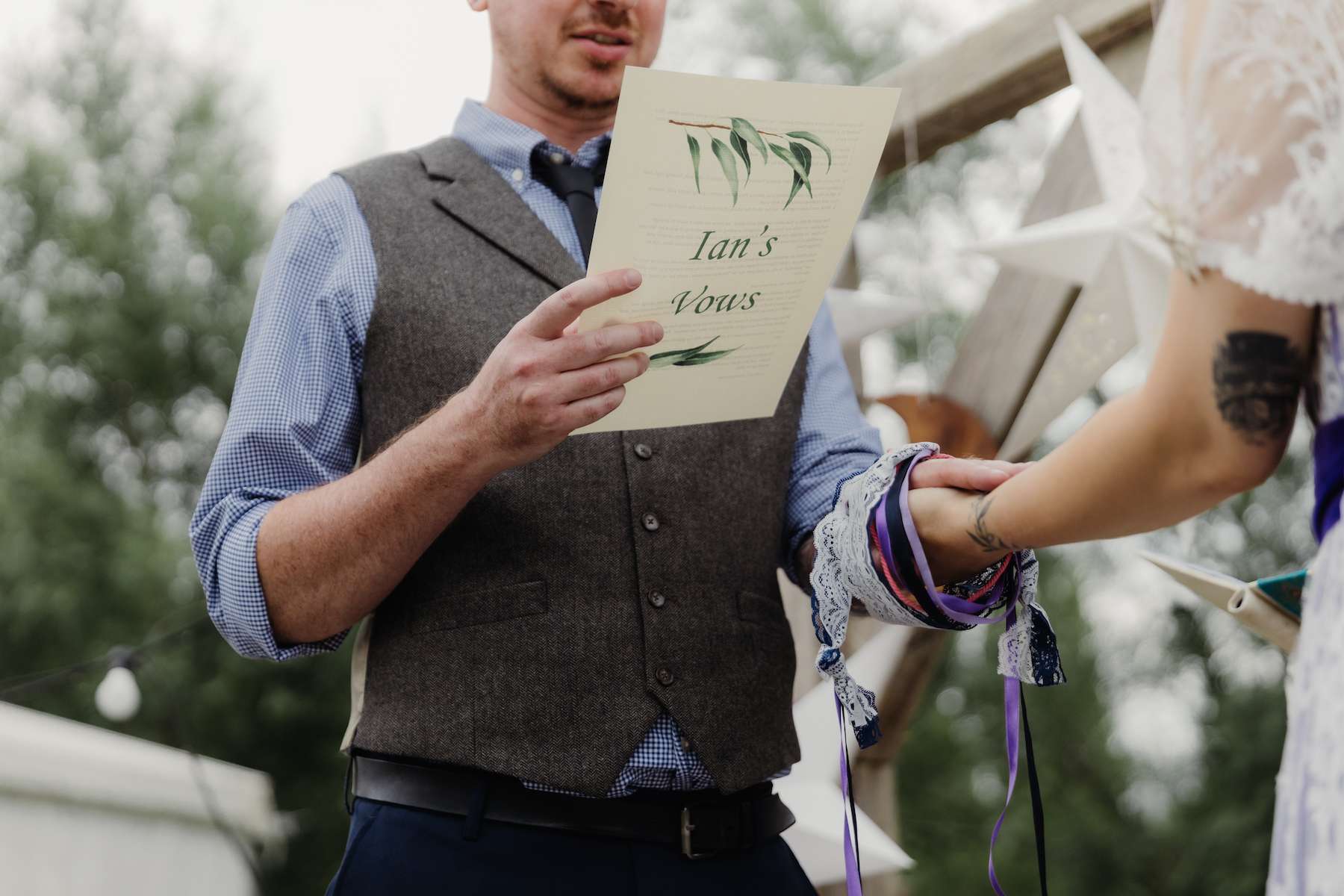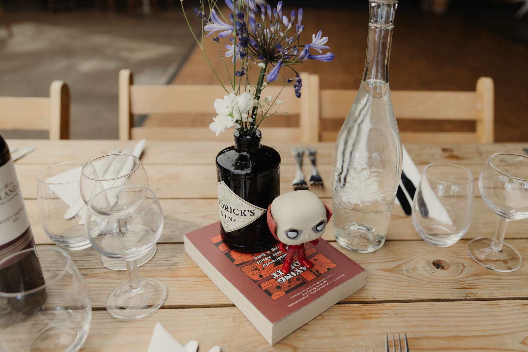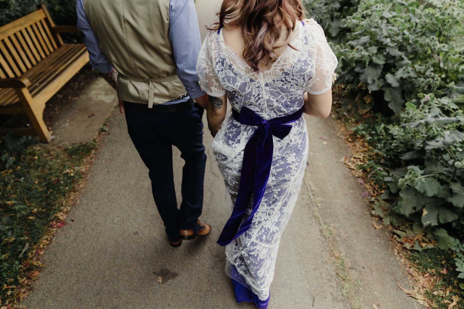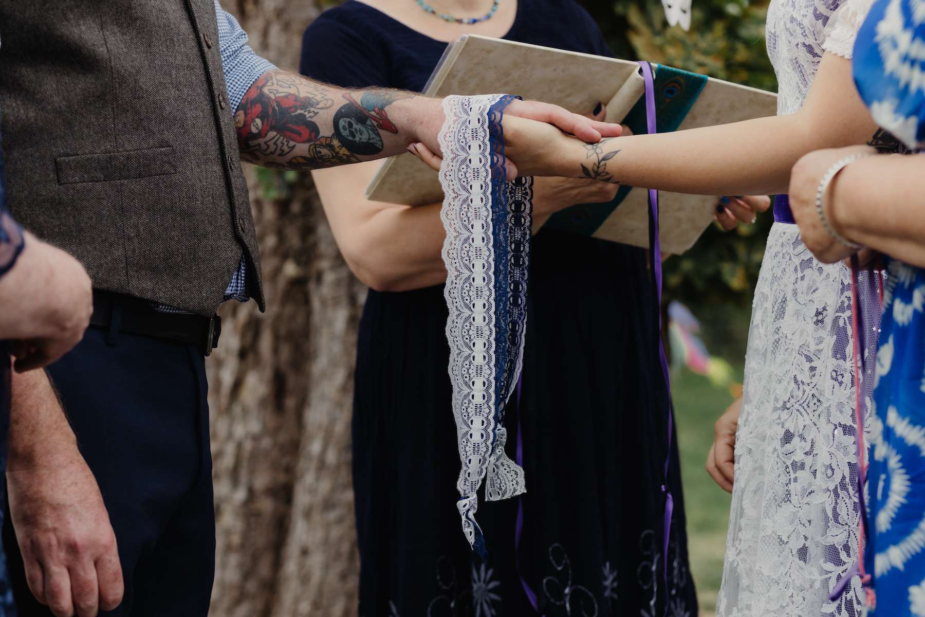 Creating a truly personal ceremony, Maud and Ian walked together down the aisle to the Batman theme tune as a nod to their superhero theme. They wrote their own vows, although Maud told us that Ian struggled to come up with his. However, she also said they were the most romantic ones ever, so he must have done OK! Their celebrant translated the whole ceremony into French for Maud’s family, providing little booklets, and spoke some parts in French as well. The couple chose a handfasting ceremony and their mums wrapped vintage ribbons belonging to their ancestors around their wrists during the handfasting, as a way of blessing their union.