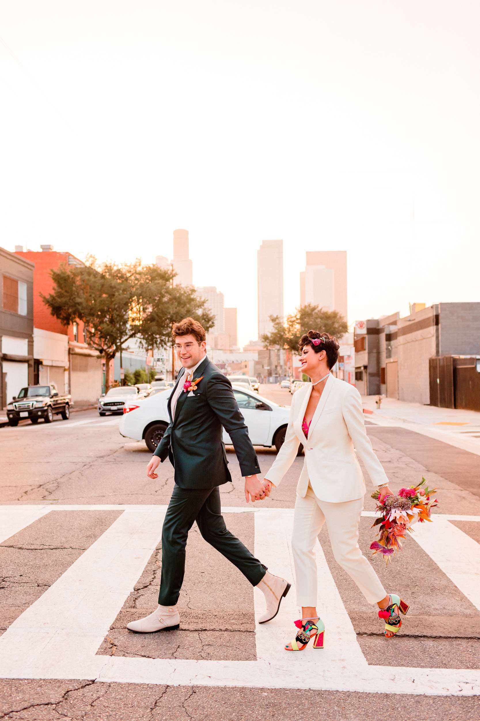 The bride began the day in a hot pink sari, and midway through changed into a custom designed white suit and super colourful shoes, which was a total surprise for her groom! Christian was just as colourful in green and as a twist on tradition, their wedding party were in a monochrome colour palette.