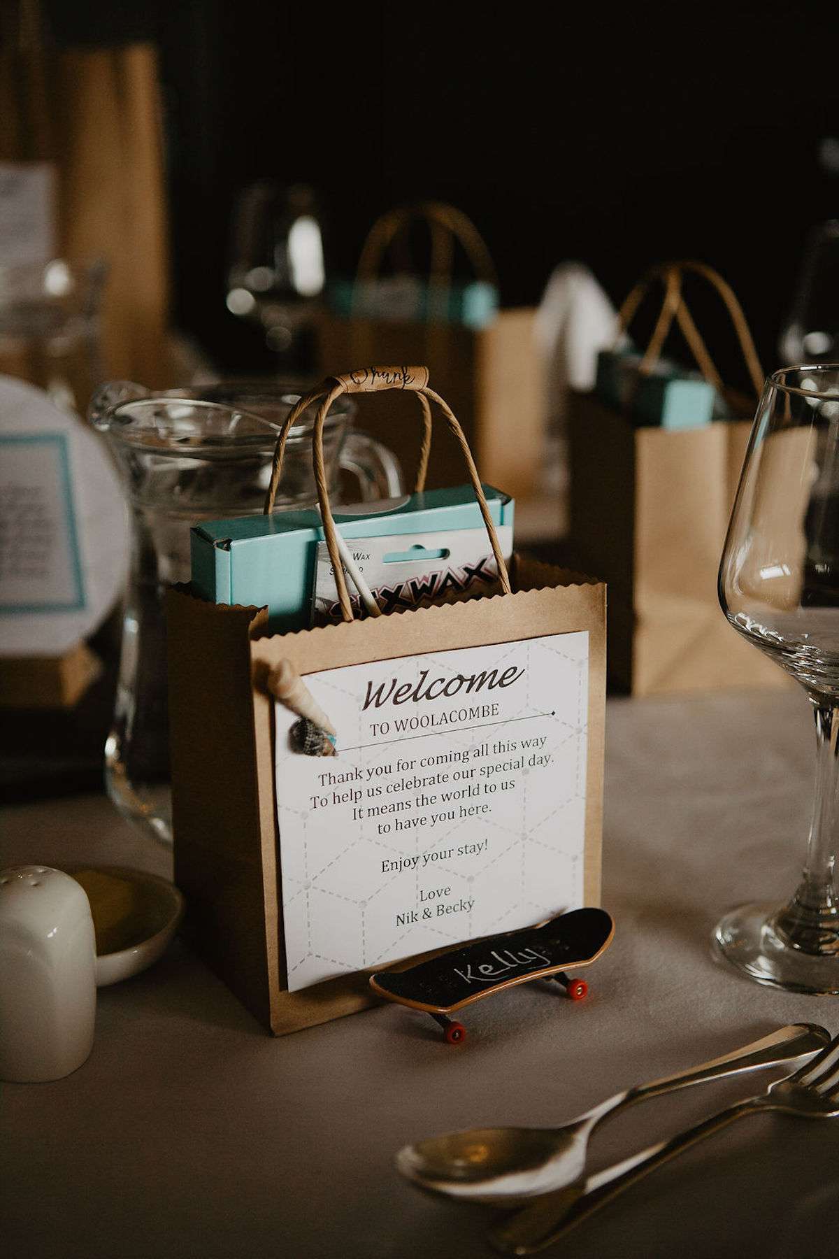 With a laidback roast dinner for their reception, they swapped traditional bottles of wine for Corona beer, and champagne toasts for Long Island iced tea cocktails. Becky and Nik made the seating plan themselves, with a clothes peg frame, and mini personalised TechDeck skateboards acted as place name markers. They also created the favour bags, complete with tequila, air freshener, fridge magnet, lollipop, surfboard charm bracelet and VW campervan wax melts – a perfect representation of their theme and location.