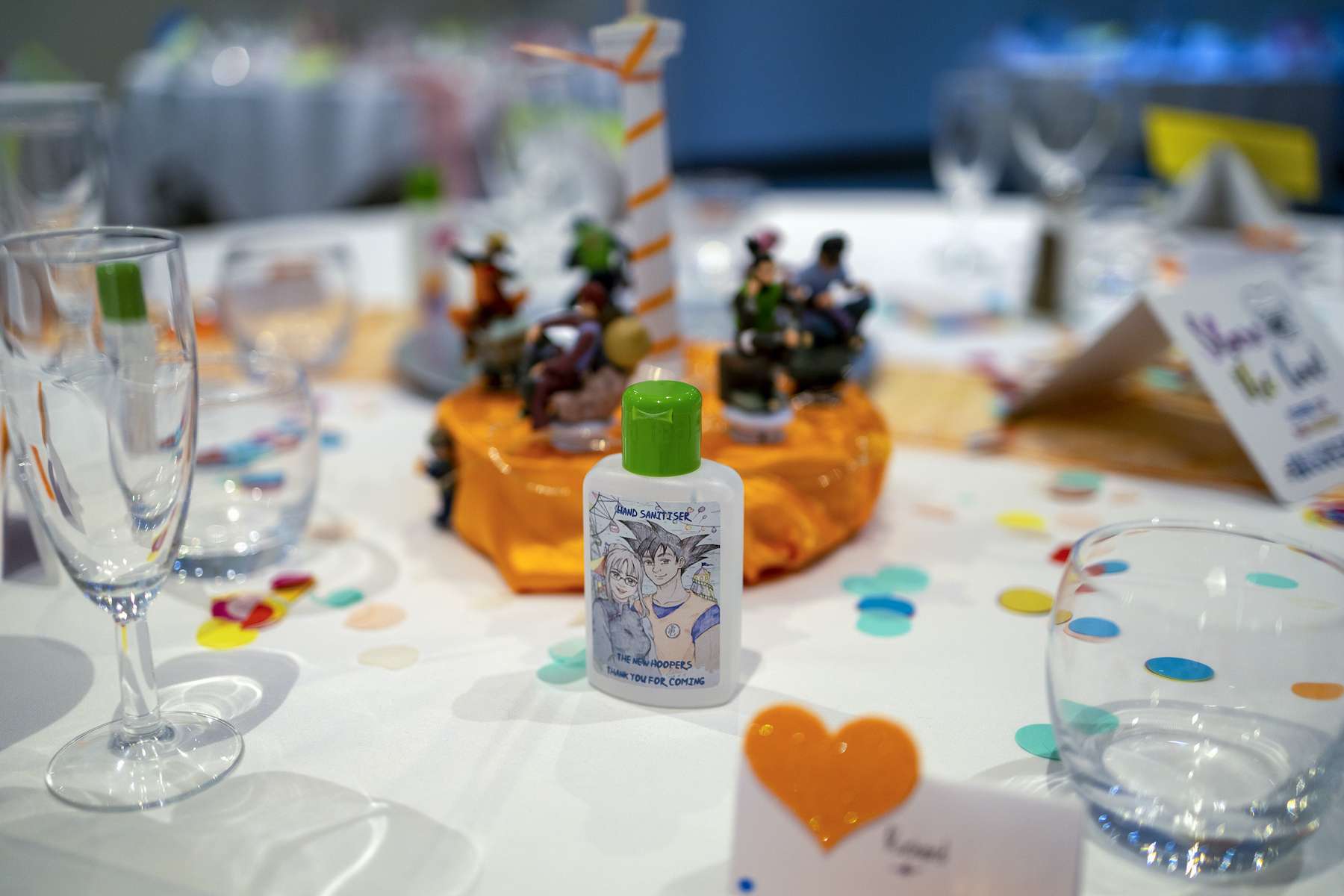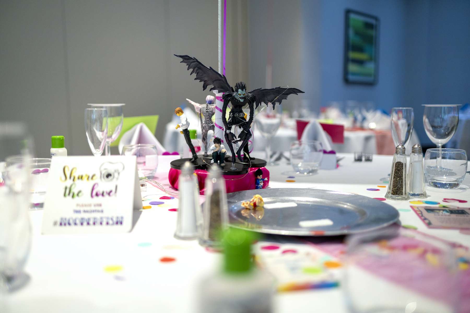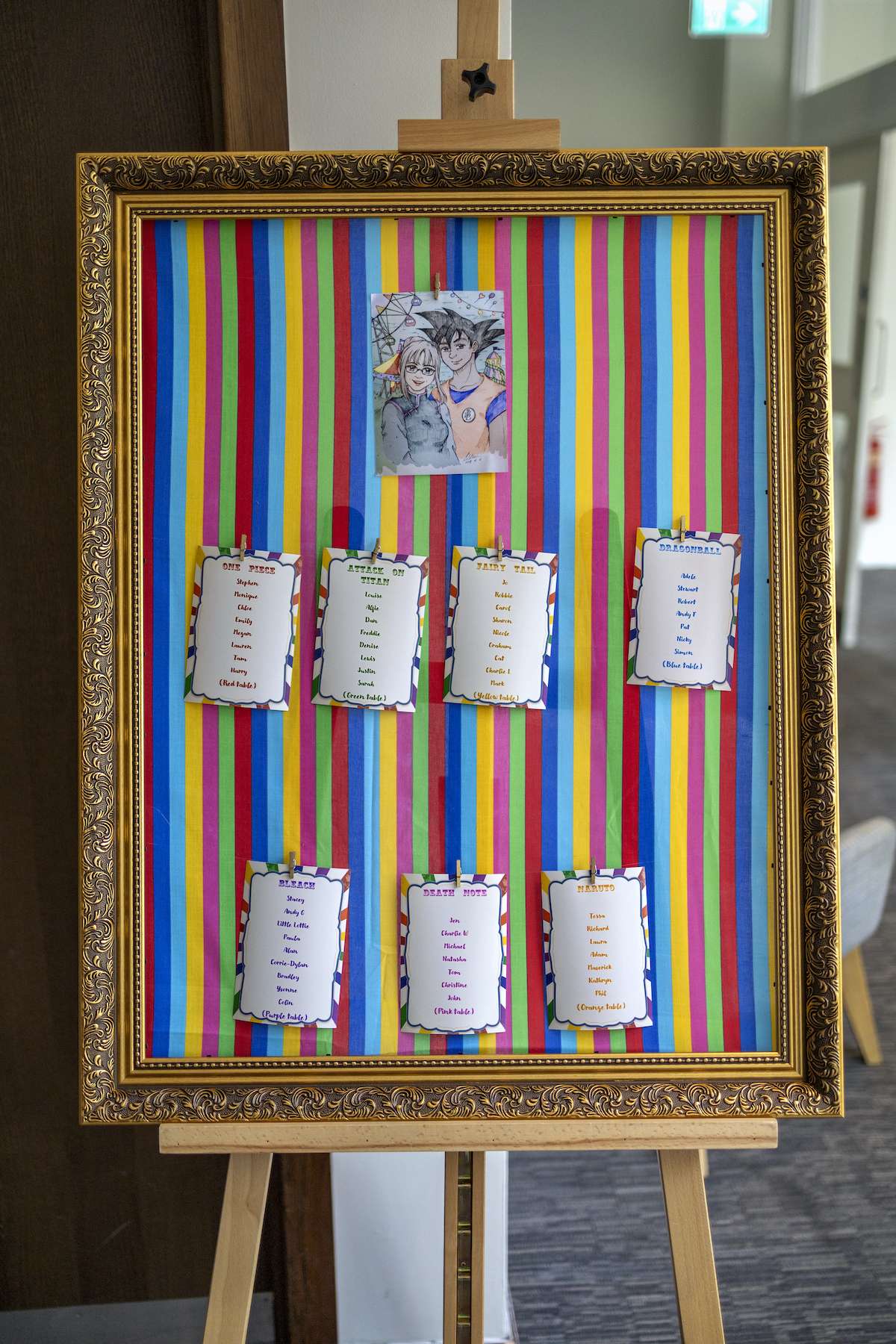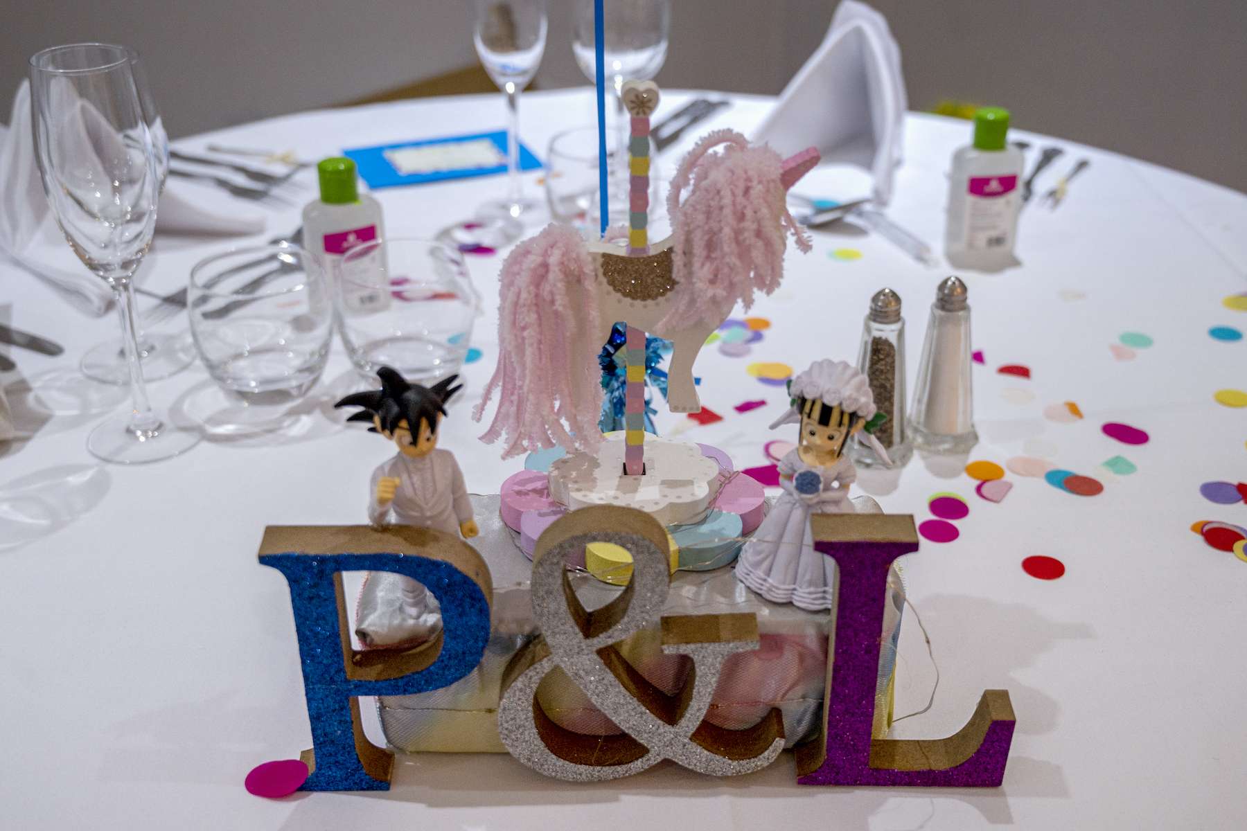 With an unusual theme, it was impossible to get any appropriate decorations, so the couple had to DIY it all! IKEA eBay and AliExpress became their best friends as they sourced items for their unique theme. They created a photocard game for the tables, hand painted all the signs are made the centrepieces and flower arch that stood behind the alter. The tables were named with both a colour and an anime, with a centrepiece to match, along with a table runner and chair bows.
