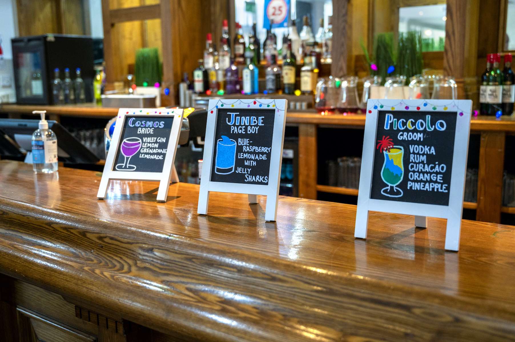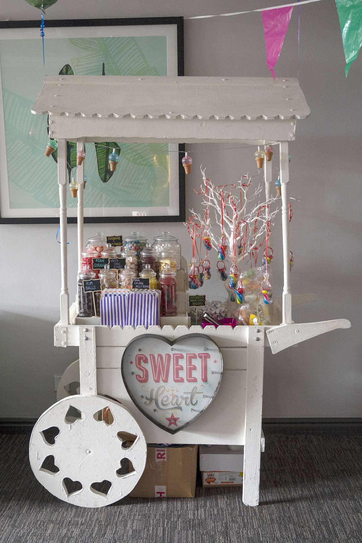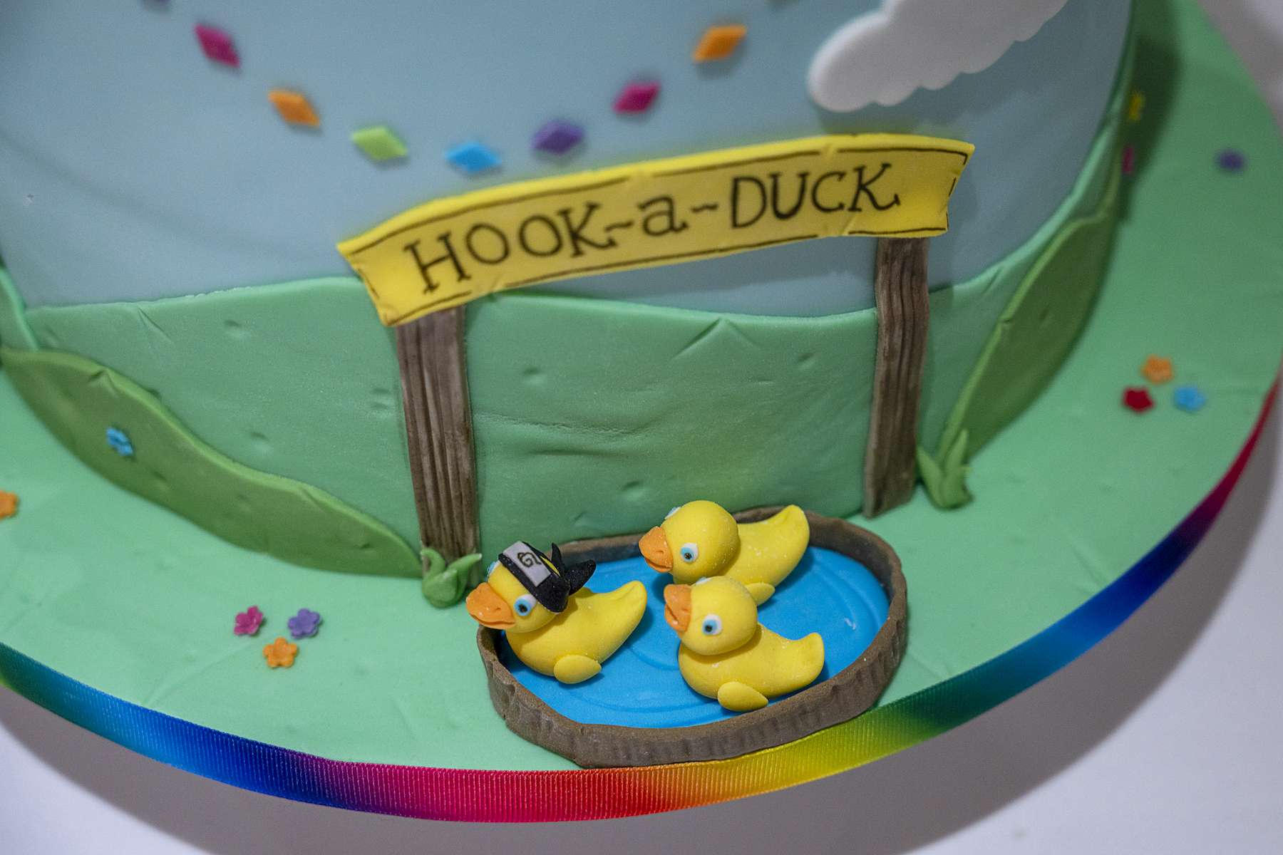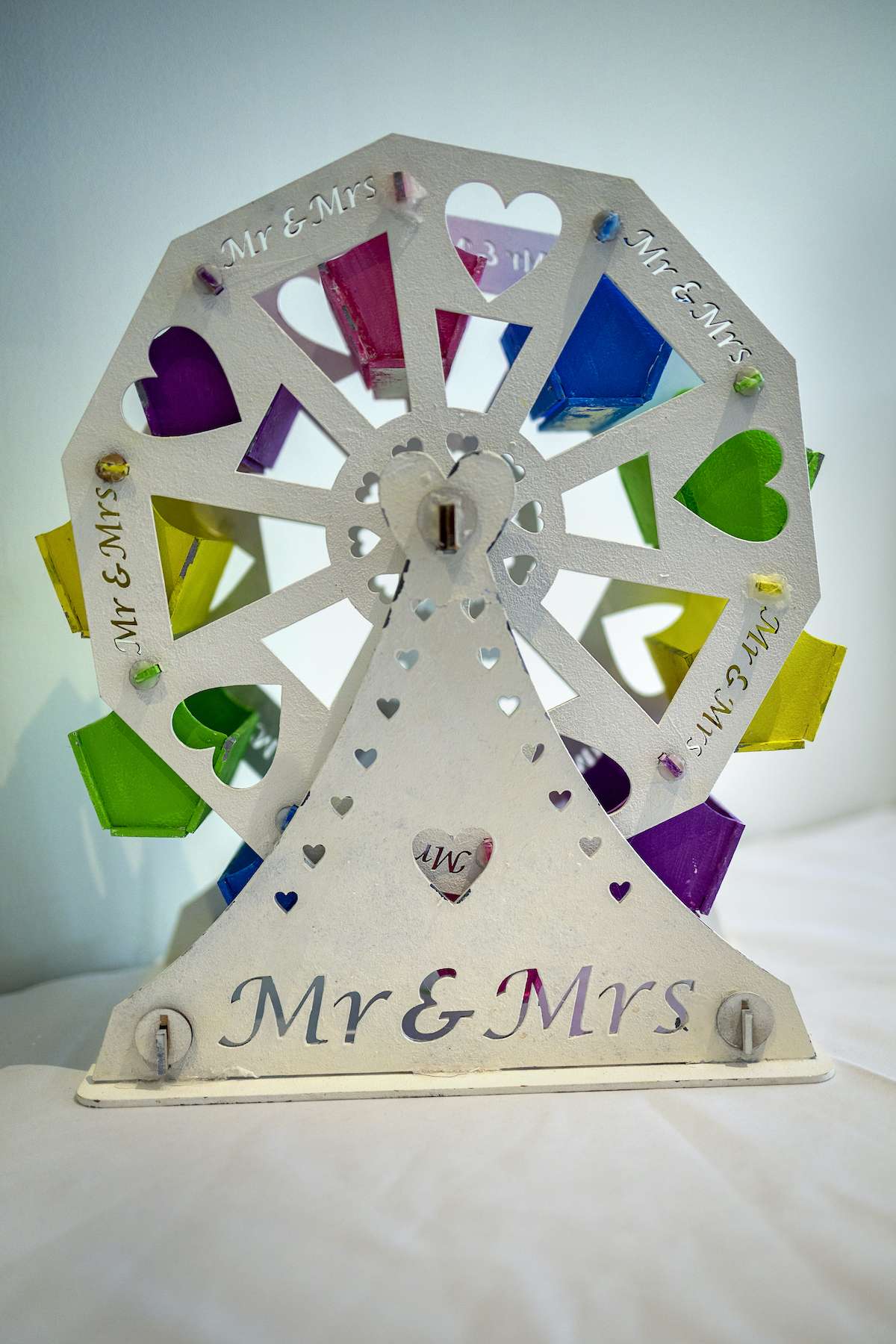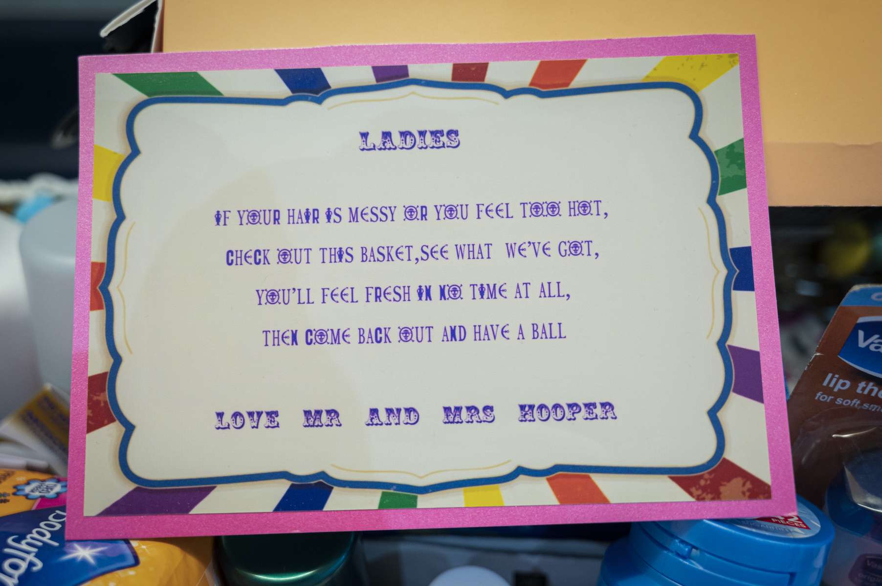 Determined not to make their guests suffer through waiting around between the meal and the beginning of the evening celebration, Leanne and Paul had a cocktail hour, creating ‘his and hers’ cocktails and setting up fun fete sideshows – hook a duck, giant Jenga, bean bag toss, jungle shooter, tin can alley and a shooting range. They also had the classic ‘guess the number of sweets in a jar’, a guess the pirate’s name and a glitter bar and tattoo station. The stalls had fun prizes their guests could win, including the traditional goldfish (soap!)
