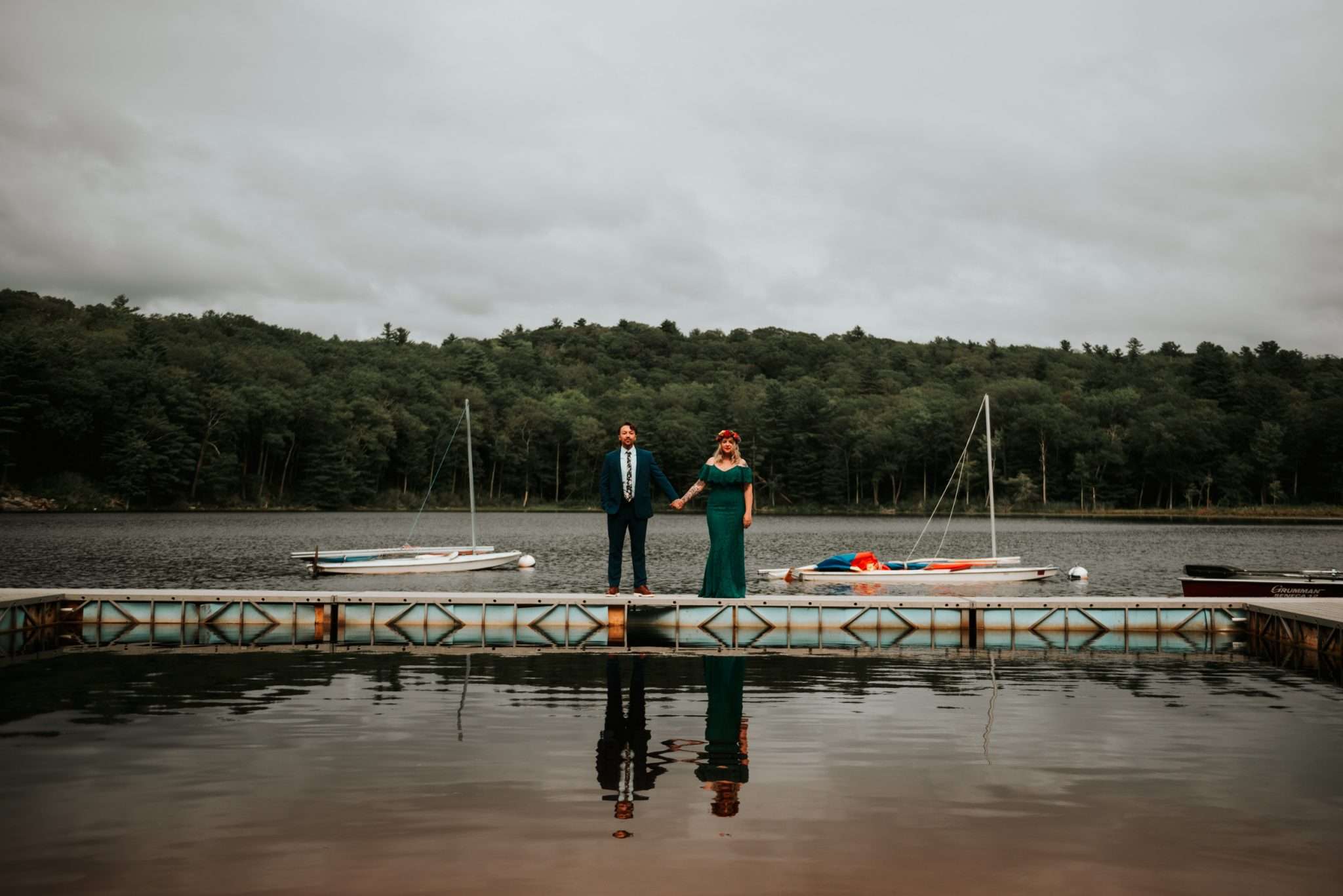 “My spouse and I are queer (me, bisexual; them, nonbinary/trans) and we definitely did our best to queer our wedding!” wrote Mareika. “Our wedding location was really unique. It’s a rustic working camp for kids and only has about three weddings a year. It’s gorgeous and has the original structures from the 1920s. The pond is completely private, so our guests and we were able to swim, boat, fish anywhere.”