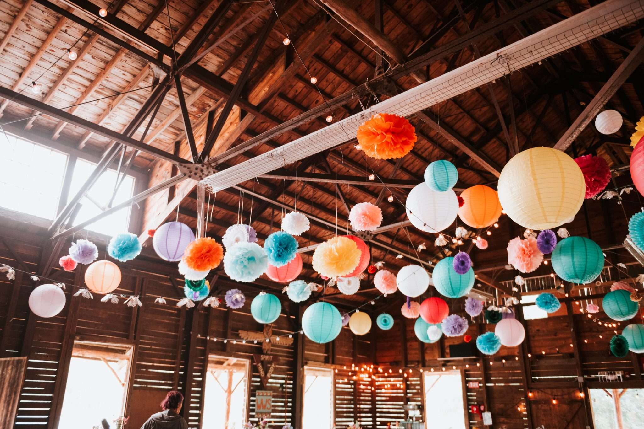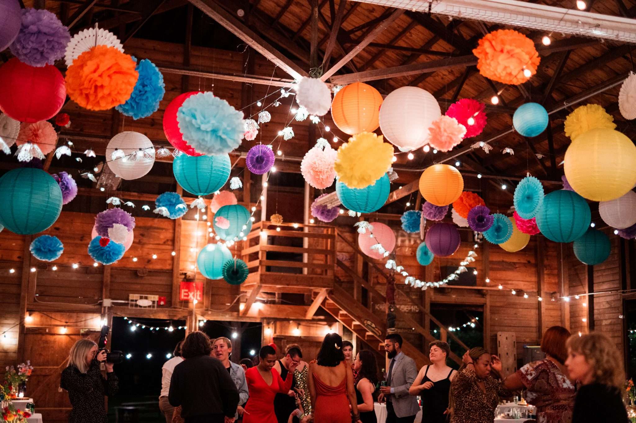 The reception was one huge party where they ate s’mores and danced under a rainbow display of paper pom poms and lanterns hanging from the ceiling. The evening ended with them going night swimming in the pond!