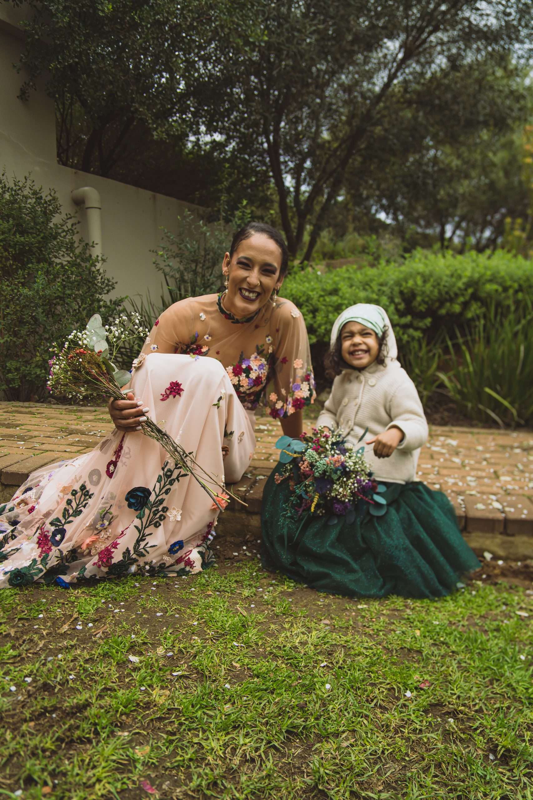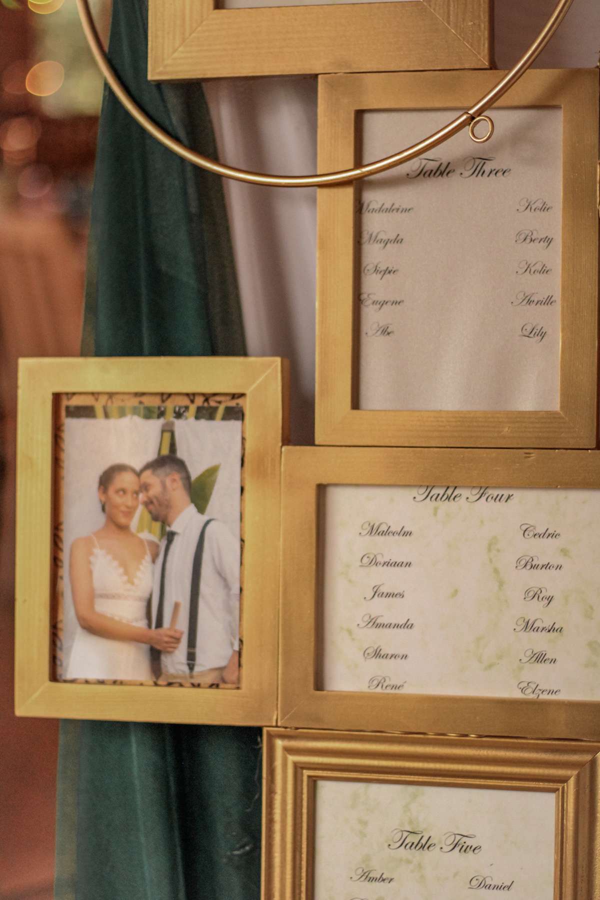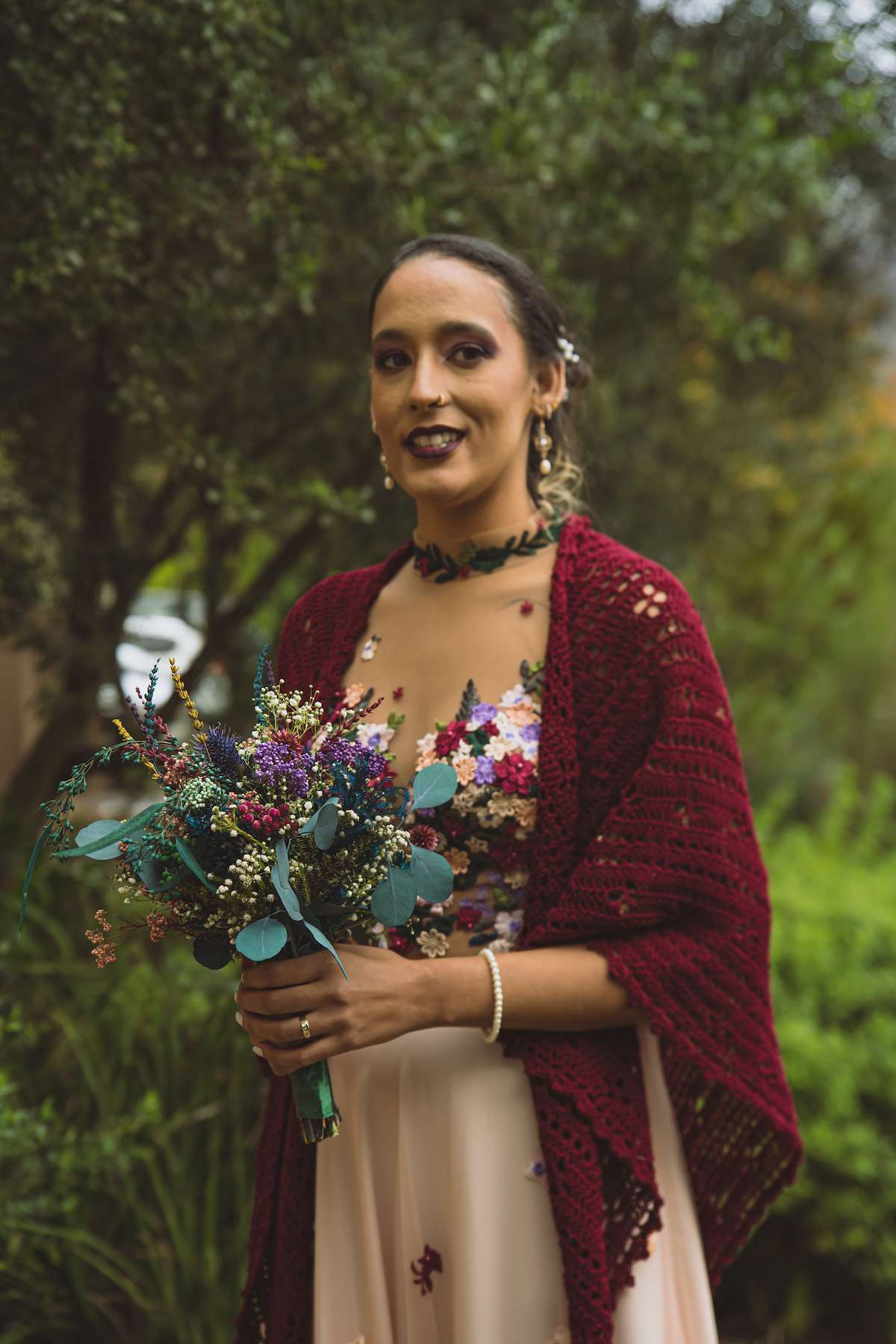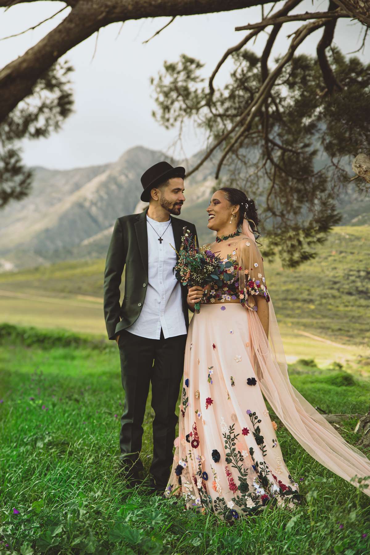 With a mixed jewel tone palette, the couple went for colourful outfits, Neeka in a multi-coloured crop top and skirt by Ilse Roux Bridal and Bruno choosing an emerald green suit and porkpie hat. They decorated the tables to match, choosing emerald as the accent colour running across their day, symbolising their love of the forest. A little glamour was added to the tables in the form of Neeka’s late grandmother’s brass trinkets; a lovely way to include her in the celebrations.