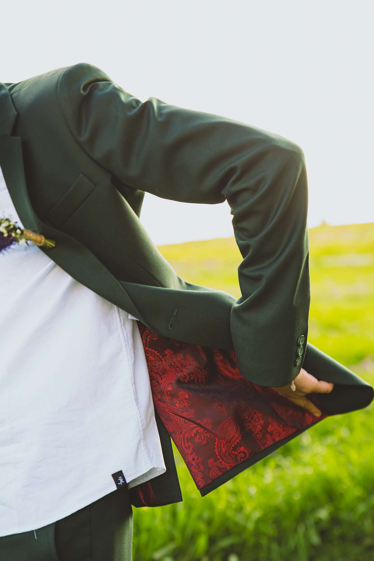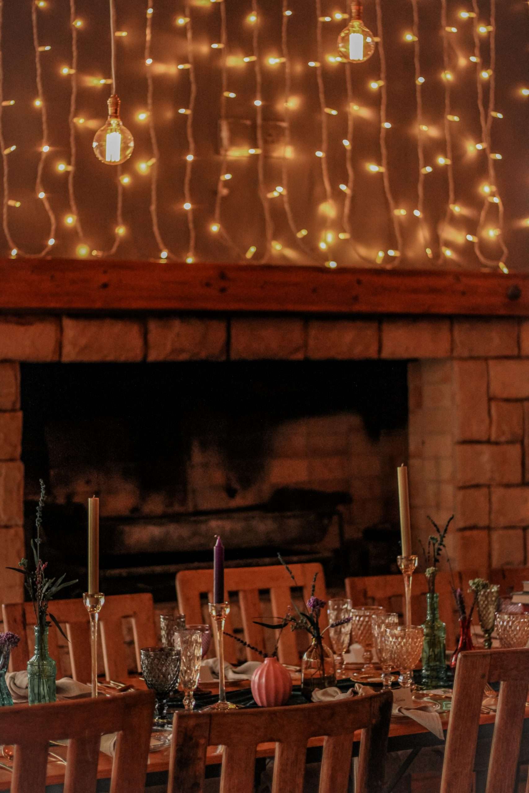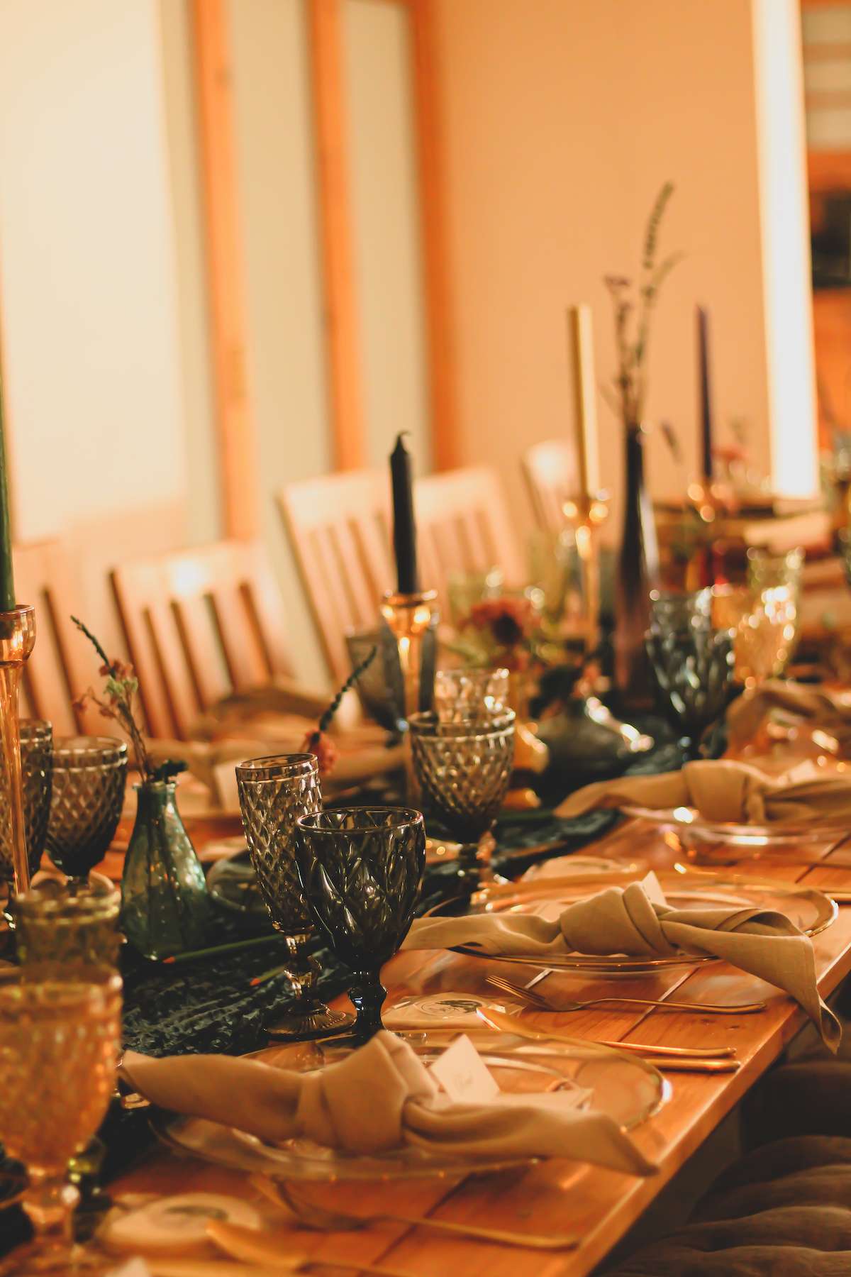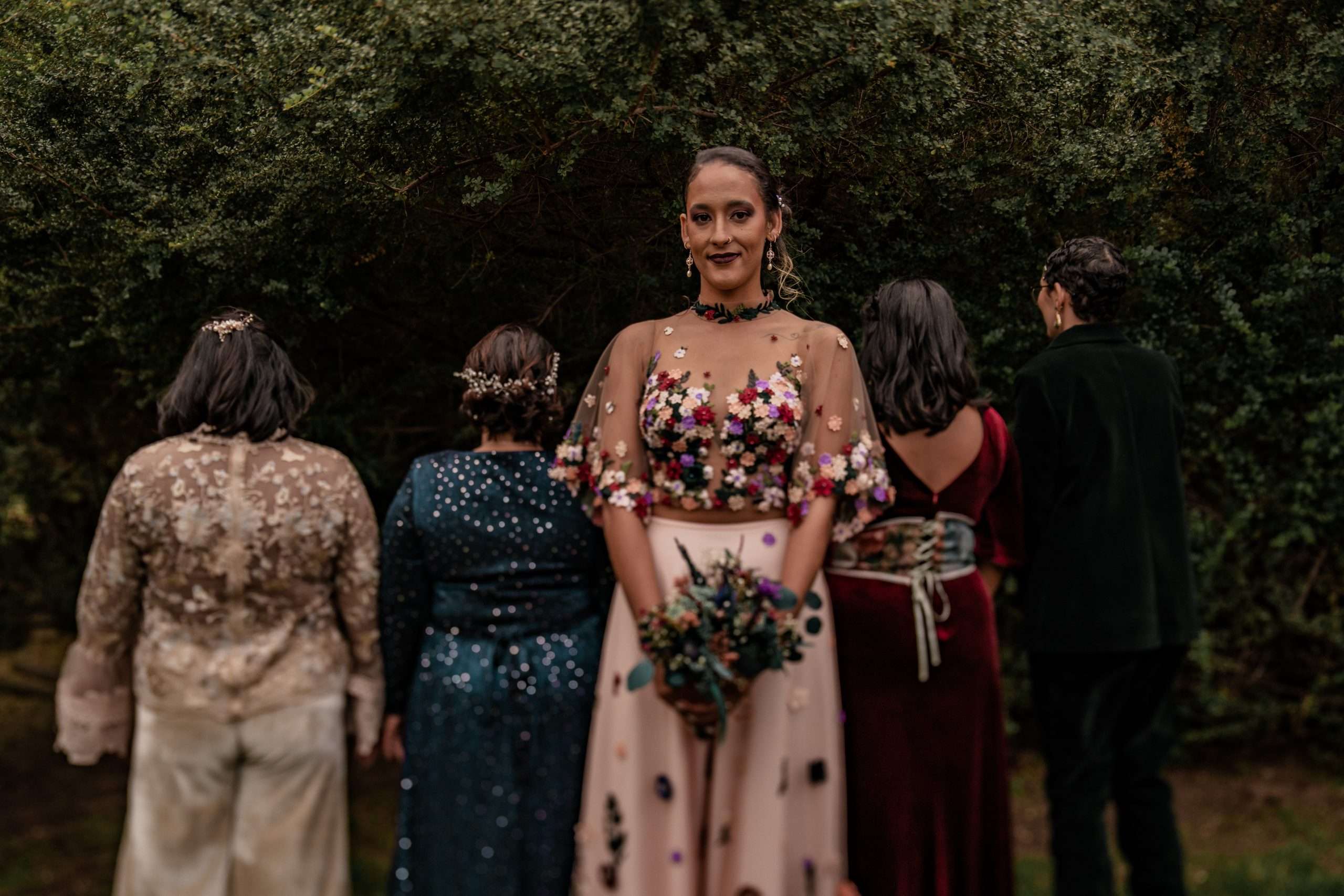 With a mixed jewel tone palette, the couple went for colourful outfits, Neeka in a multi-coloured crop top and skirt by Ilse Roux Bridal and Bruno choosing an emerald green suit and porkpie hat. They decorated the tables to match, choosing emerald as the accent colour running across their day, symbolising their love of the forest. A little glamour was added to the tables in the form of Neeka’s late grandmother’s brass trinkets; a lovely way to include her in the celebrations.