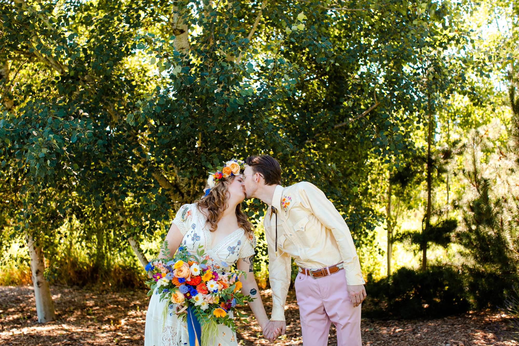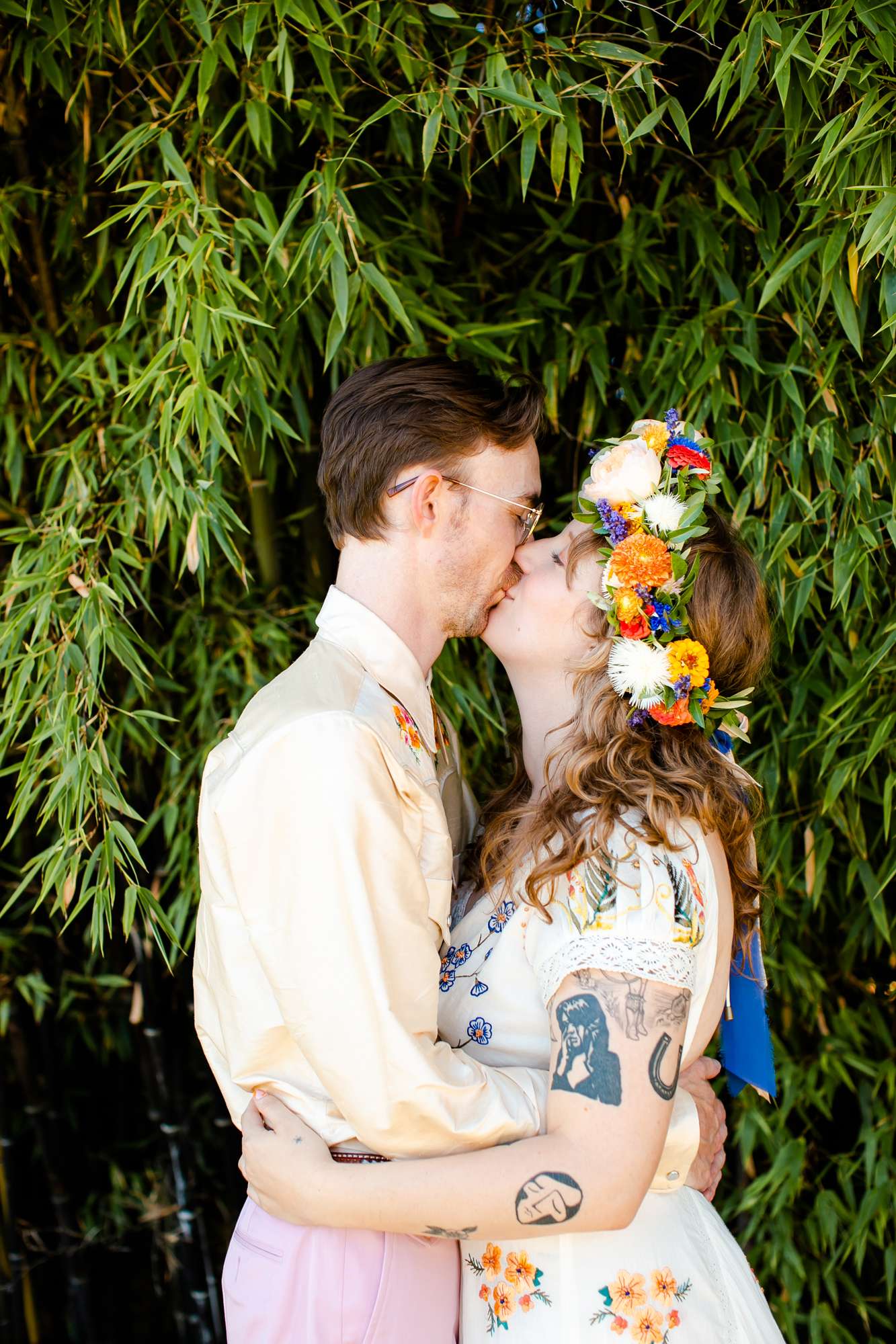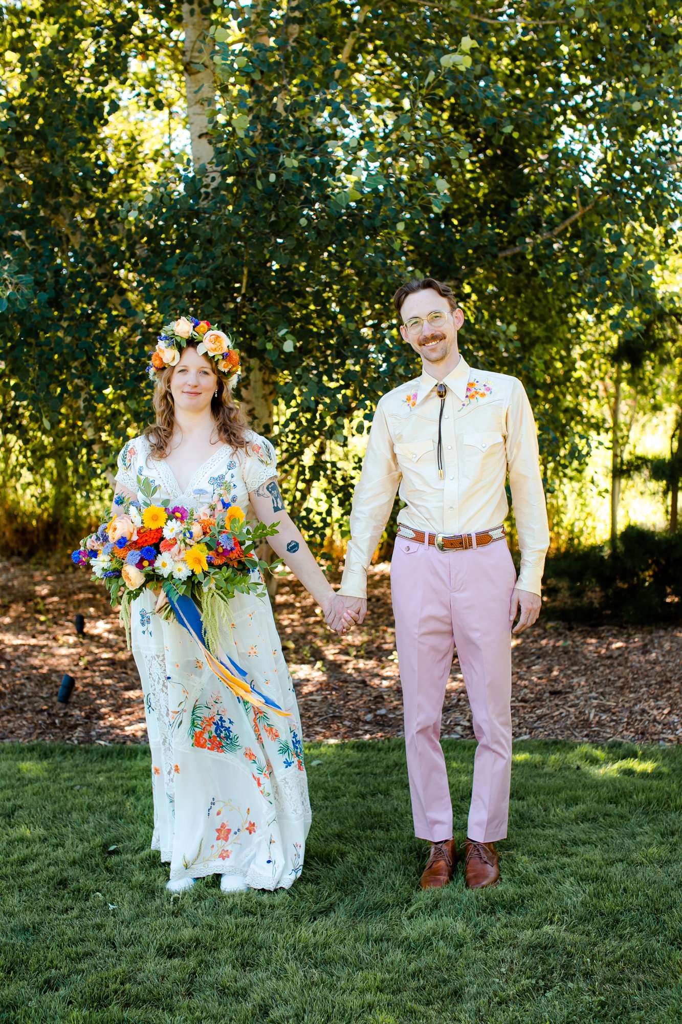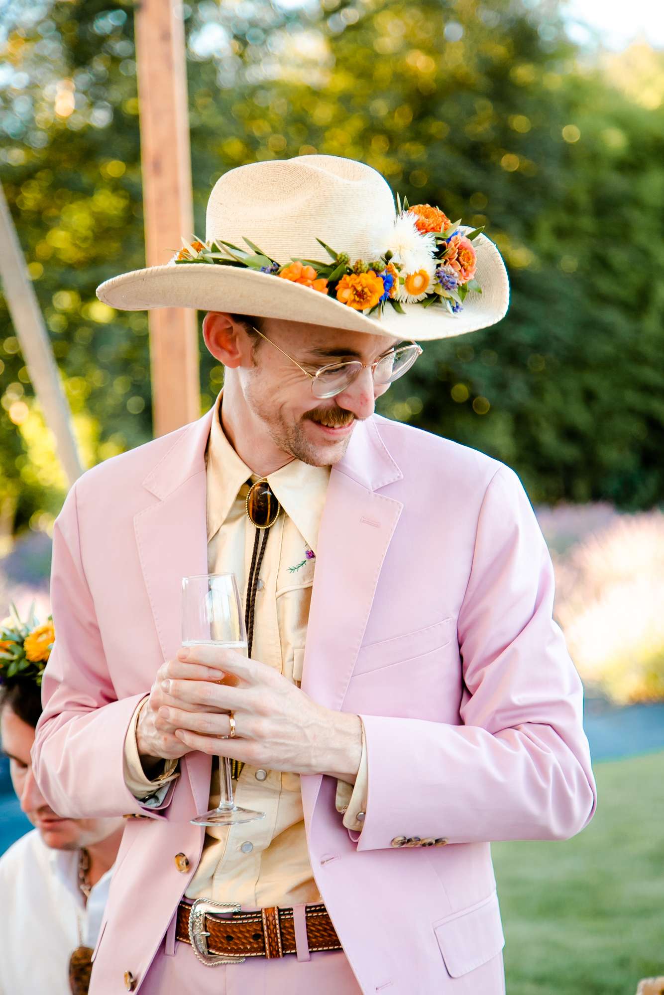 The bride wore a BHLDN x Free People dress, which she got on sale for $270, and the groom sported a pink suit from Bonobos, topped with a hat from Seager and a few strategically placed flowers. With a $50,000 budget, photography by Jen Sanders Photography, and planned and styled by the bride and her mum, this wedding was truly their dream come true.
