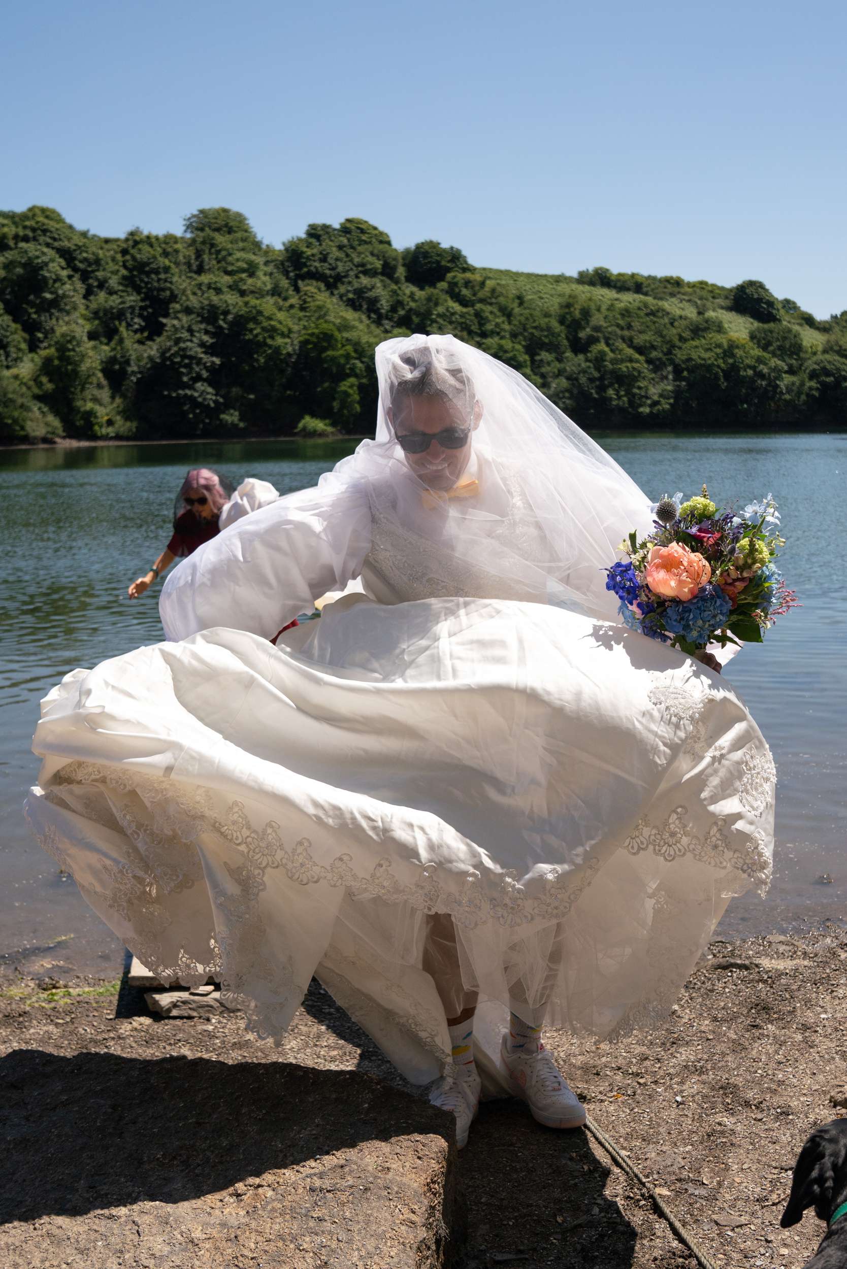 “The best part of the day was probably going for a swim”, Alex remembers. “We had been running around, we were incredibly hot and sweaty, and we finally decided to take a break and go for a swim in the river to cool off before the tide dropped too much. It was just the two of us, for the first time that day, and it was lifesaving. However, I do wish we’d made sure we had the nice photos straight after the ceremony, before I was sweaty and had been for a swim and had messy hair. I look knackered in the photos!”