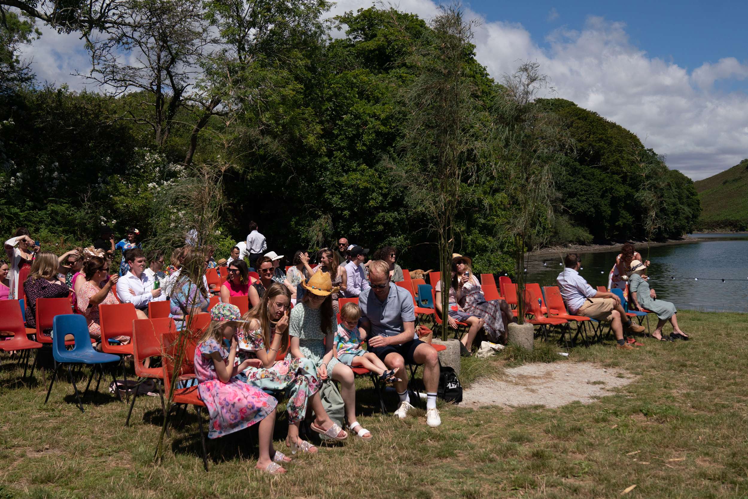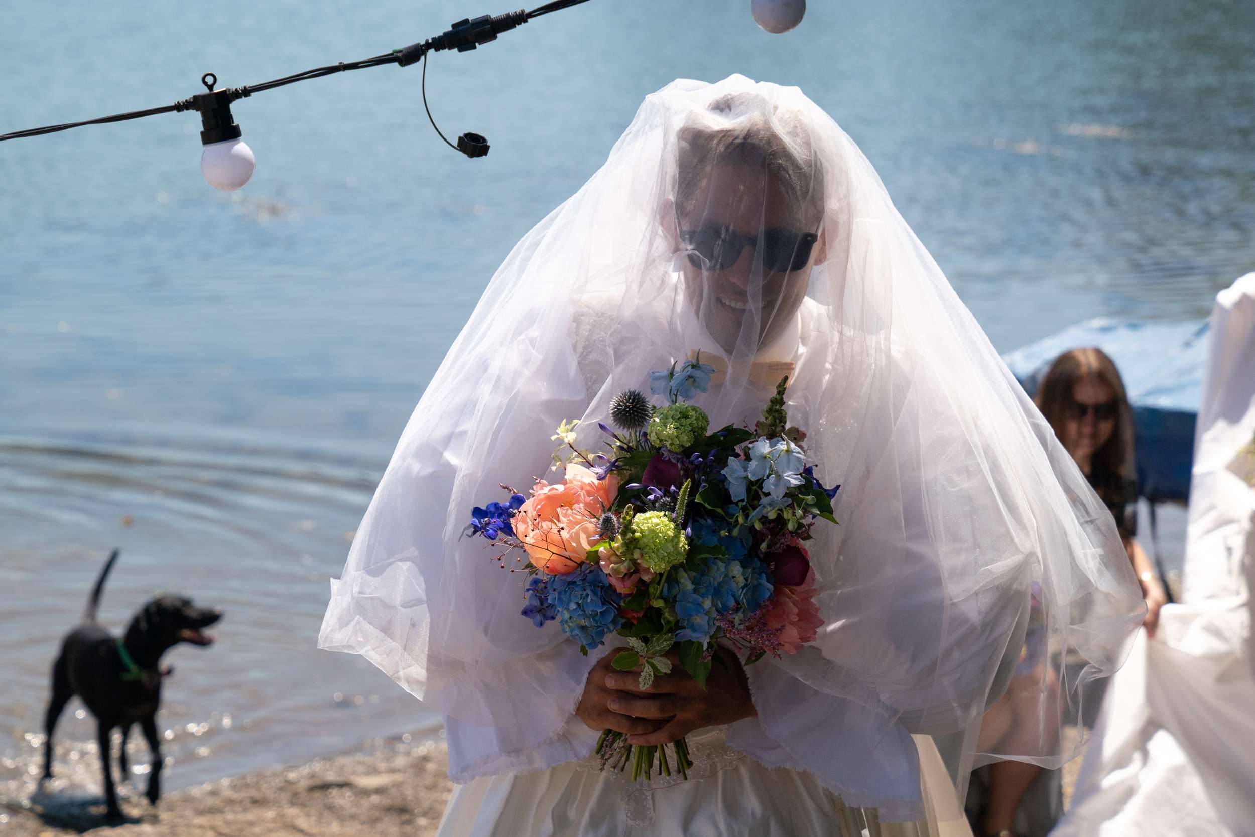 The couple used lots of personal touches to make their wedding unique. From the mirror ball tree and the enchanted woods, to Tom’s dad building an altar inspired by Midsommar. One particular highlight was Alex’ showstopping arrival by pedalo… dressed as Princess Diana and accompanied by two bridesmaids in black veils.