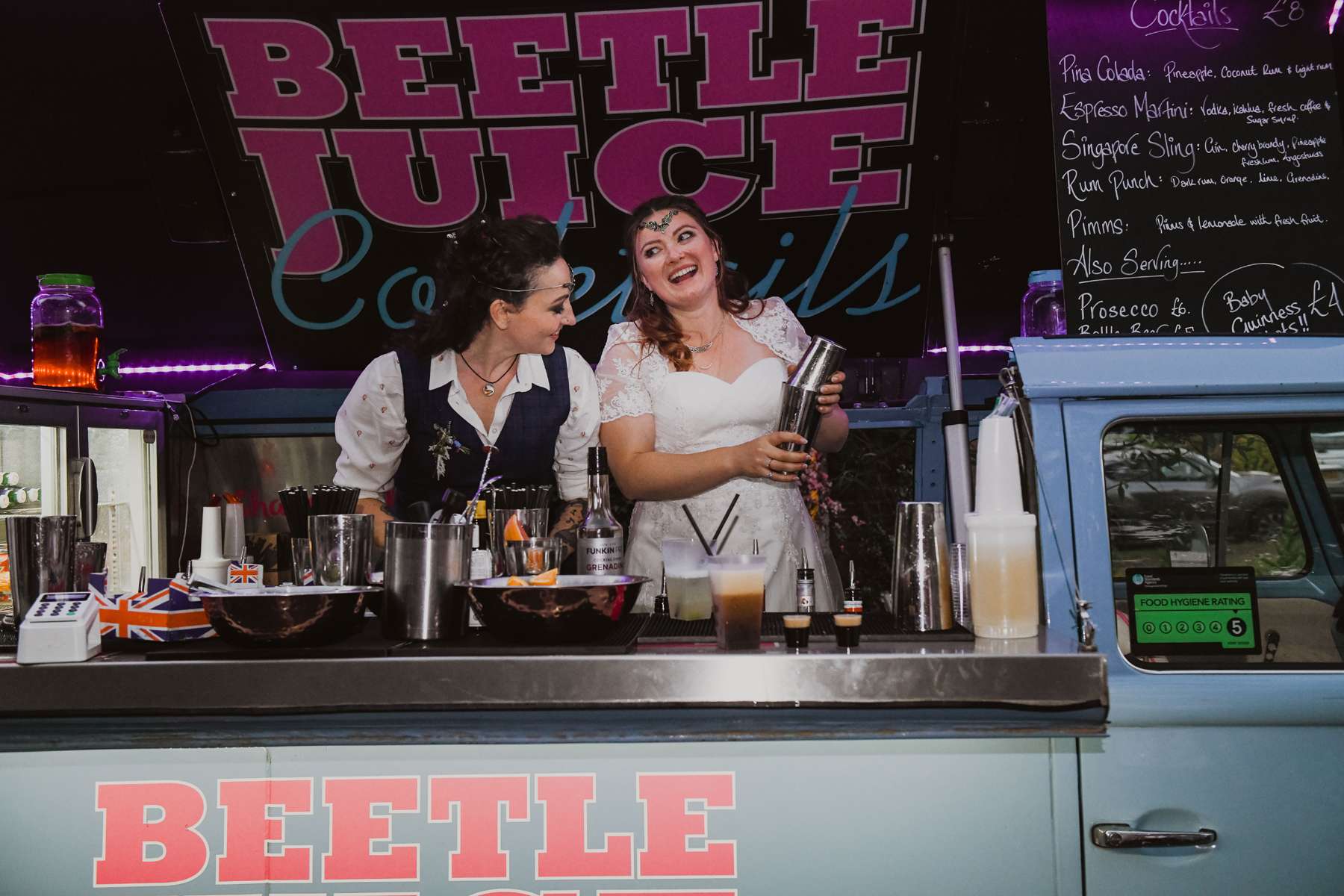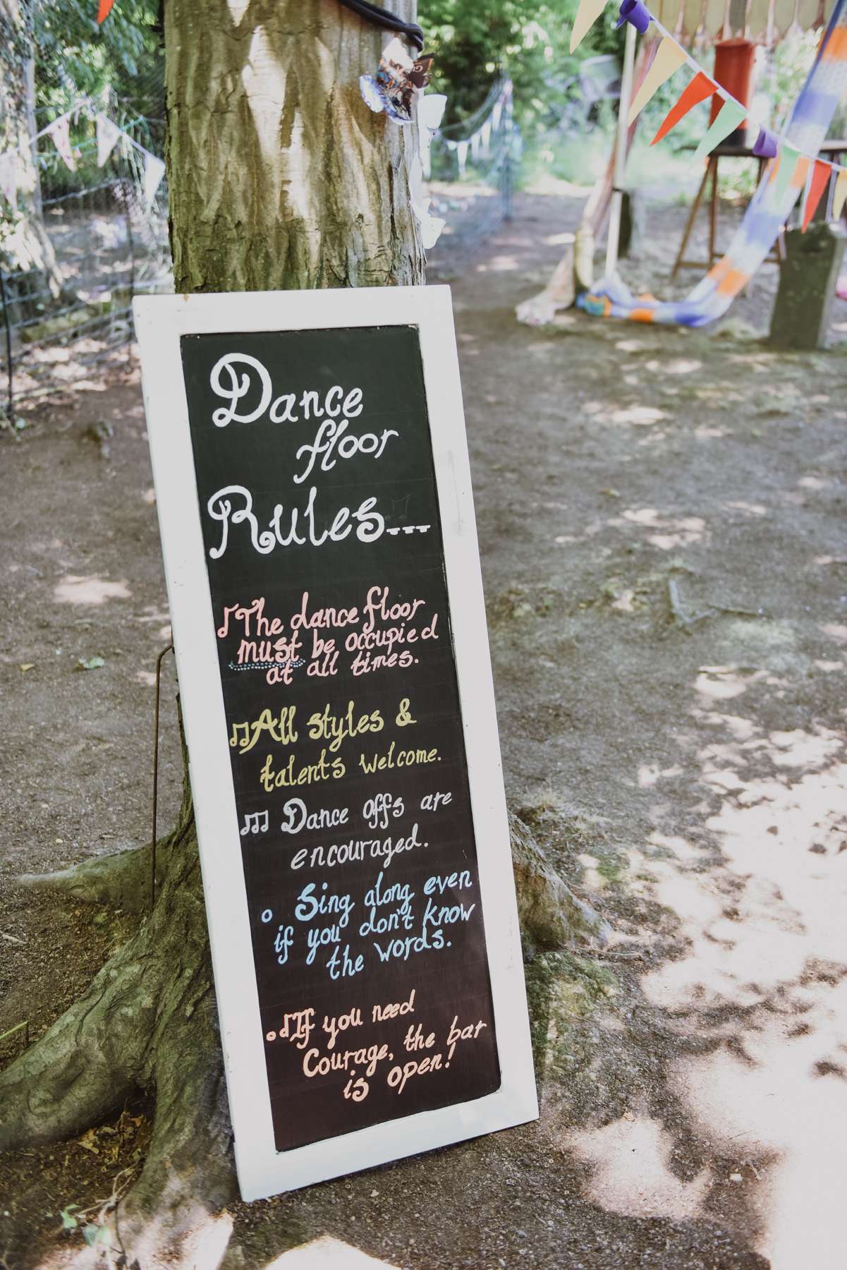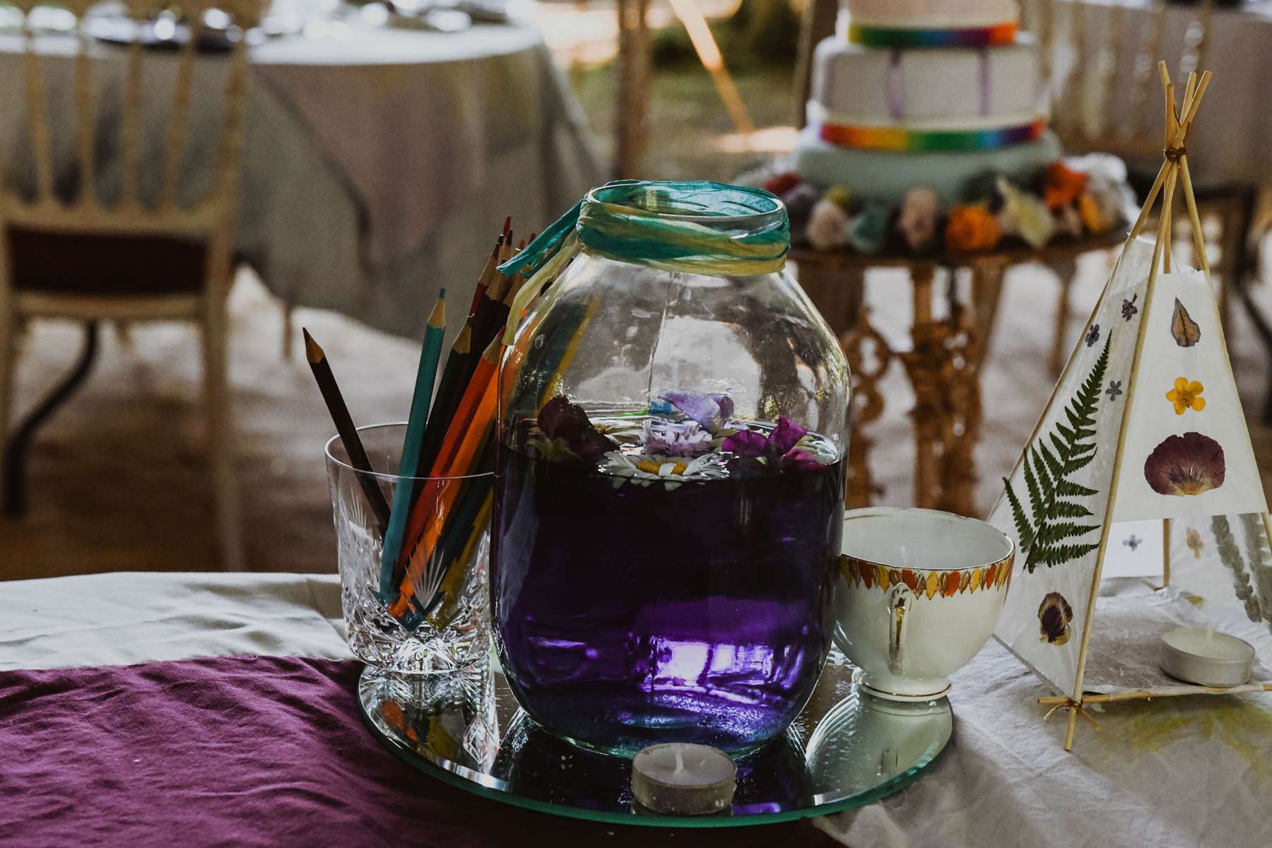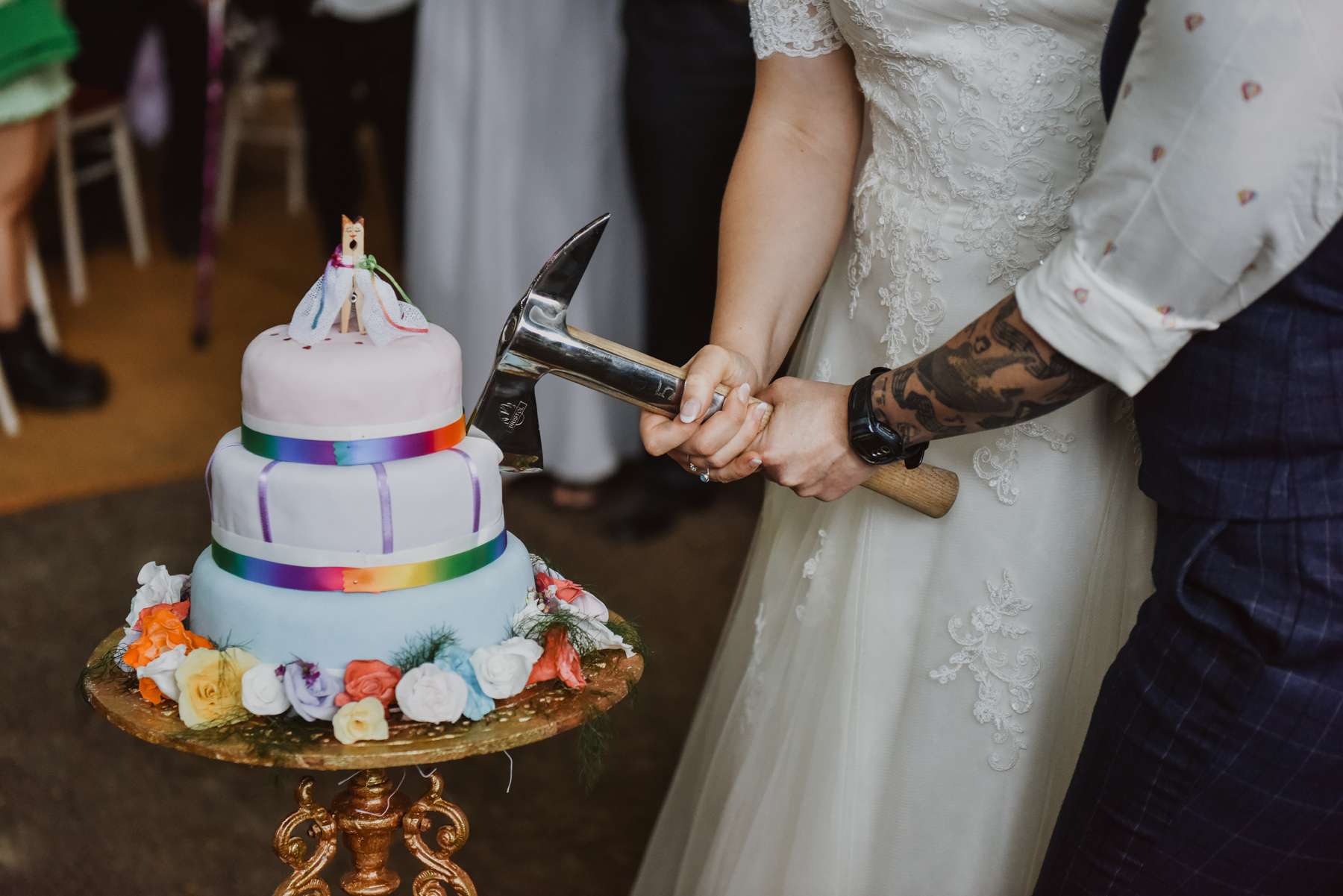 “DIYing was a huge part of our wedding,” said Dani. “We made chalk board signs out of old cupboard doors or photo frames, Susi made the cake, we made the table cloths, invites and collected mismatched vintage places from our grandparent’s houses. The table centrepieces were old catering size pickled onion jars, scrubbed and cleaned and filled with coloured water with floating flowers and candles on the surface.” To add even further to the personal touches, they cut the cake with a fire axe because Dani is a fire fighter and she’d managed to get one from work to use especially.