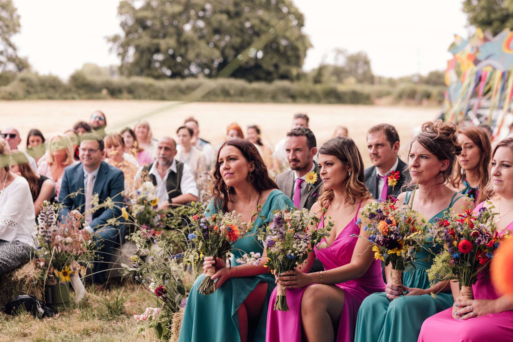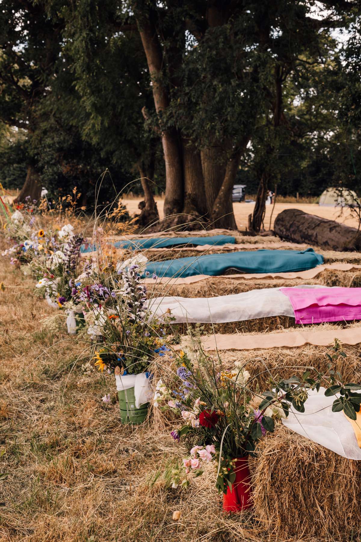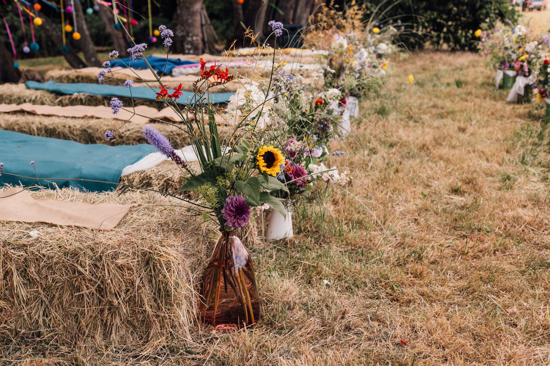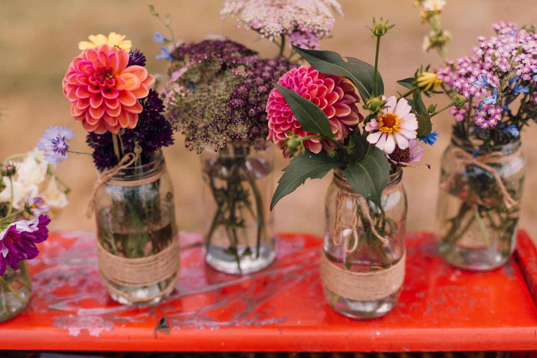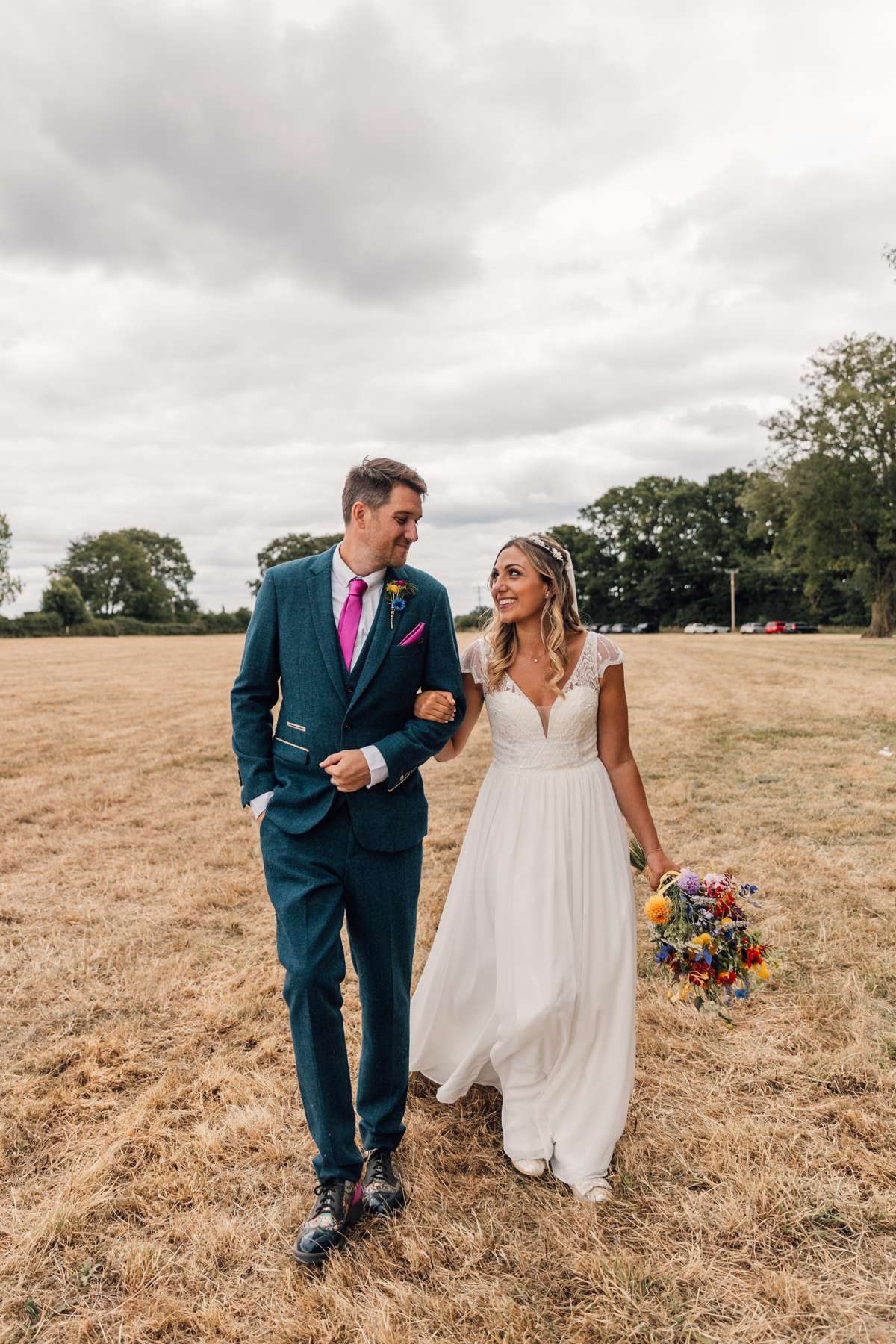 The couple faced some challenges in planning their wedding as they got married in the field down the road from Sam’s family home, so had to do everything themselves. “Having an empty field without so much as running water there was a lot of logistics, so it took a lot of planning,” said Nicola. “We also ordered dried flower bouquets for me and my bridesmaids. They were meant to be really bright and colourful. They took ages to come and when they came they were awful; broken, poorly put together and horrible faded pastel colours! Luckily we were able to order more stems from the farm growing some of the flowers for us and our amazing friend Lucy did an incredible job arranging them for us. It was actually serendipitous in the end as I think the fresh flowers were so much more fitting with being outside in the field and they were so so beautiful so I am really pleased we had to change the flowers for the bouquets in the end!”