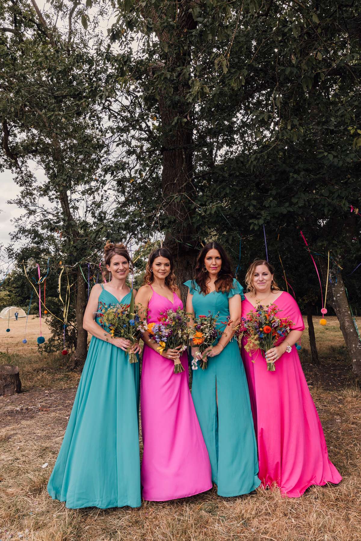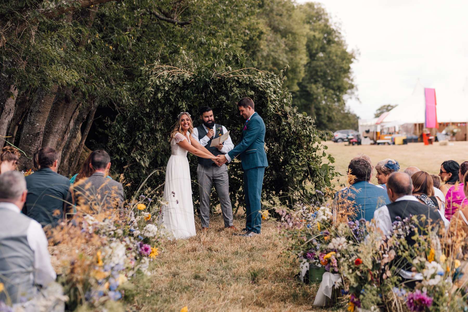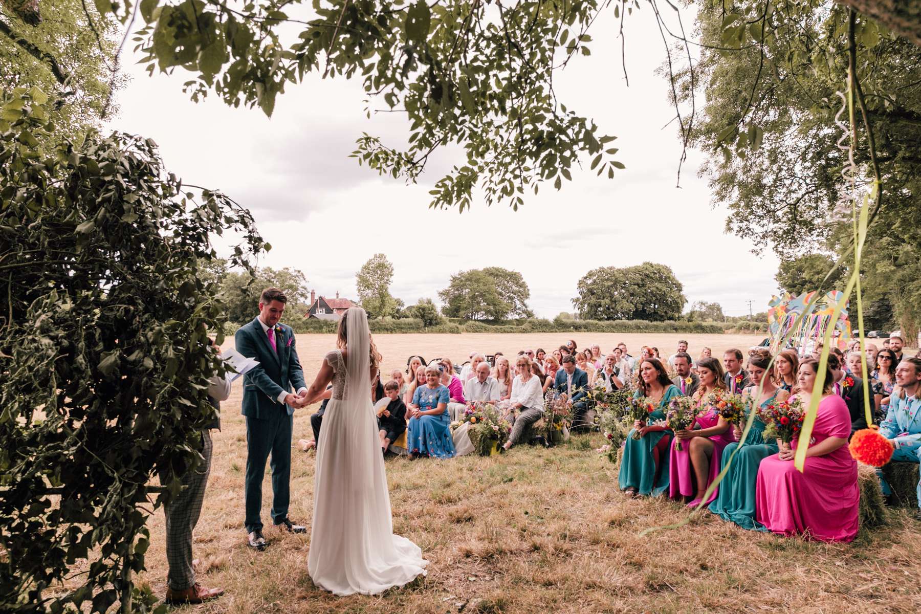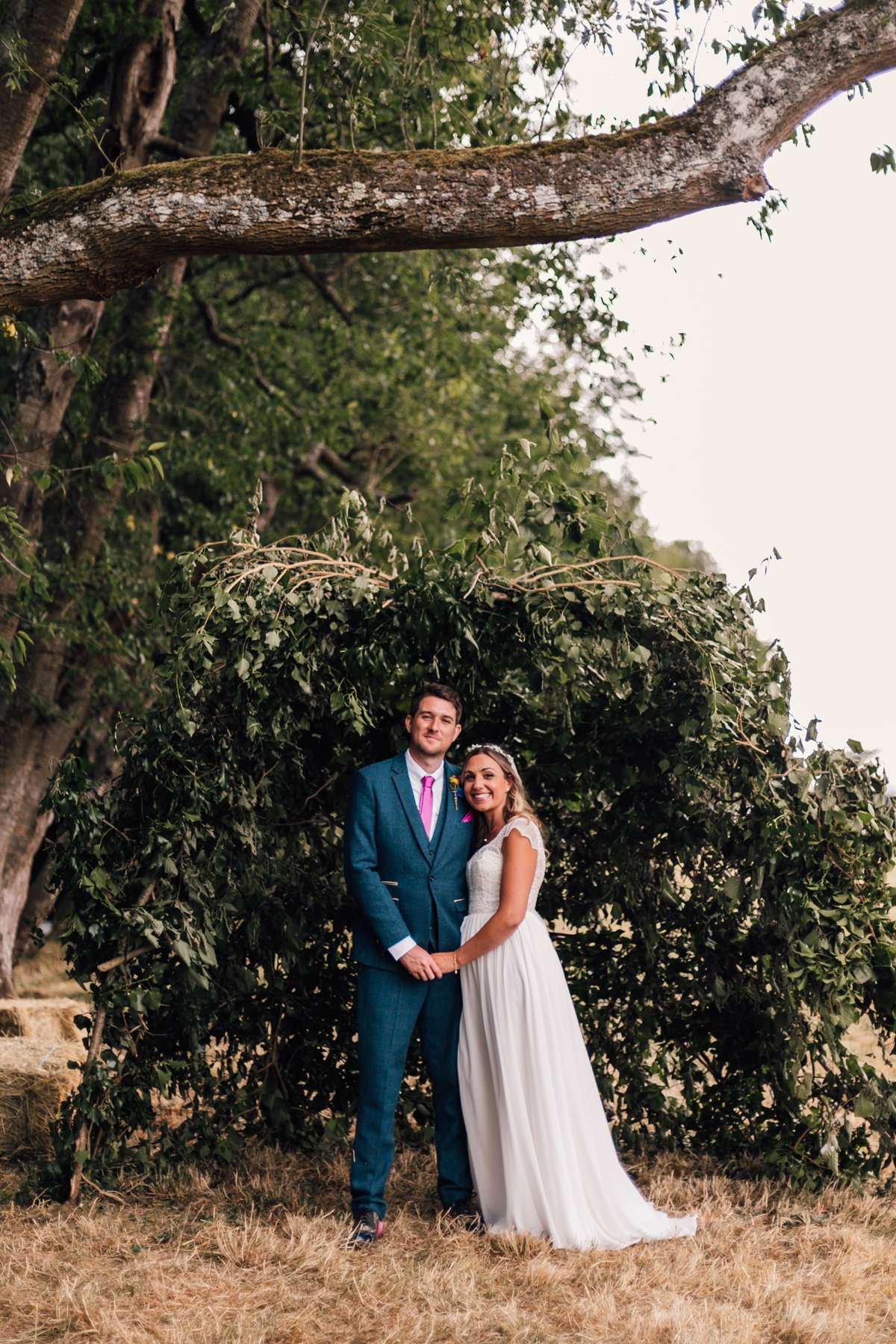 The couple faced some challenges in planning their wedding as they got married in the field down the road from Sam’s family home, so had to do everything themselves. “Having an empty field without so much as running water there was a lot of logistics, so it took a lot of planning,” said Nicola. “We also ordered dried flower bouquets for me and my bridesmaids. They were meant to be really bright and colourful. They took ages to come and when they came they were awful; broken, poorly put together and horrible faded pastel colours! Luckily we were able to order more stems from the farm growing some of the flowers for us and our amazing friend Lucy did an incredible job arranging them for us. It was actually serendipitous in the end as I think the fresh flowers were so much more fitting with being outside in the field and they were so so beautiful so I am really pleased we had to change the flowers for the bouquets in the end!”