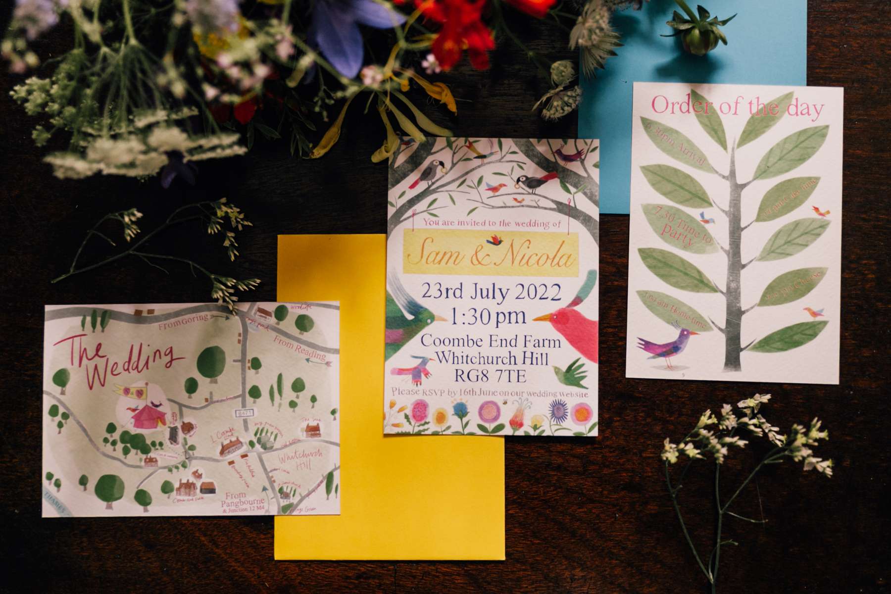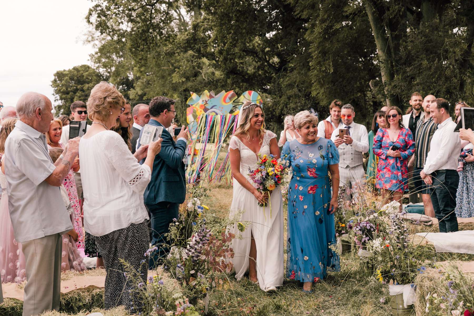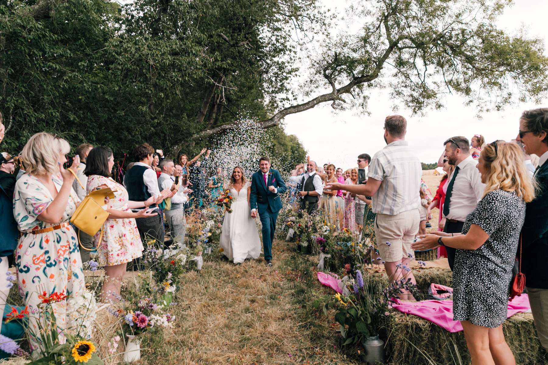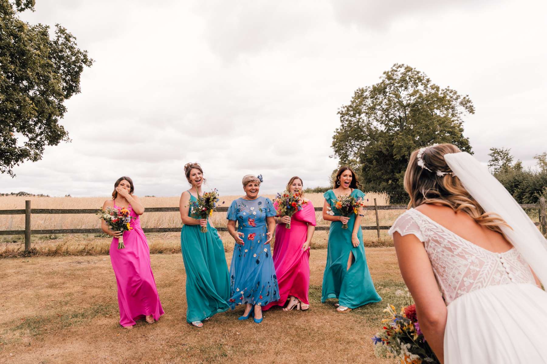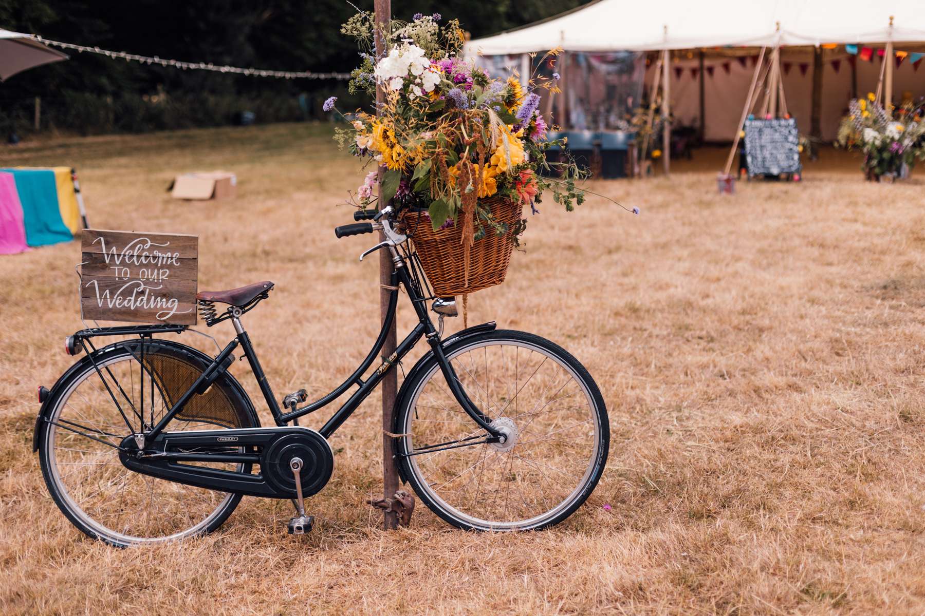 The couple faced some challenges in planning their wedding as they got married in the field down the road from Sam’s family home, so had to do everything themselves. “Having an empty field without so much as running water there was a lot of logistics, so it took a lot of planning,” said Nicola. “We also ordered dried flower bouquets for me and my bridesmaids. They were meant to be really bright and colourful. They took ages to come and when they came they were awful; broken, poorly put together and horrible faded pastel colours! Luckily we were able to order more stems from the farm growing some of the flowers for us and our amazing friend Lucy did an incredible job arranging them for us. It was actually serendipitous in the end as I think the fresh flowers were so much more fitting with being outside in the field and they were so so beautiful so I am really pleased we had to change the flowers for the bouquets in the end!”