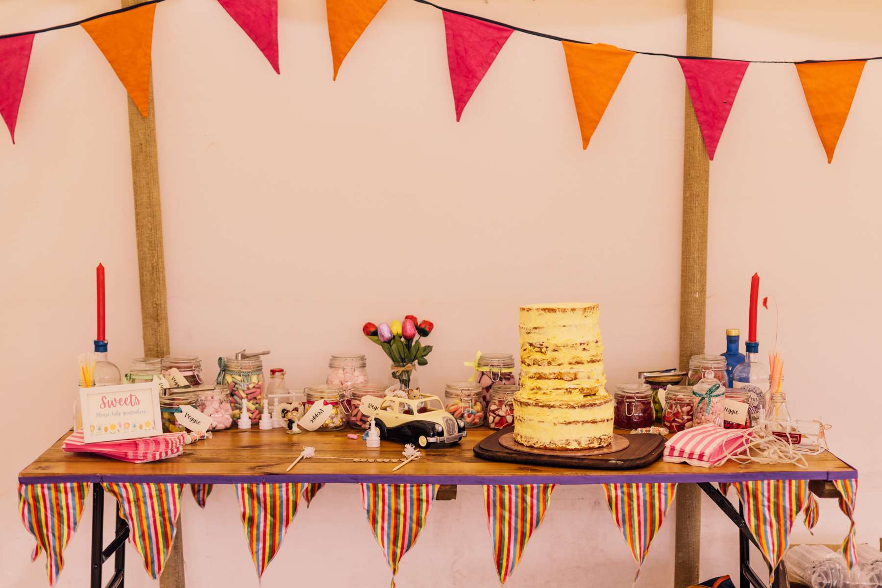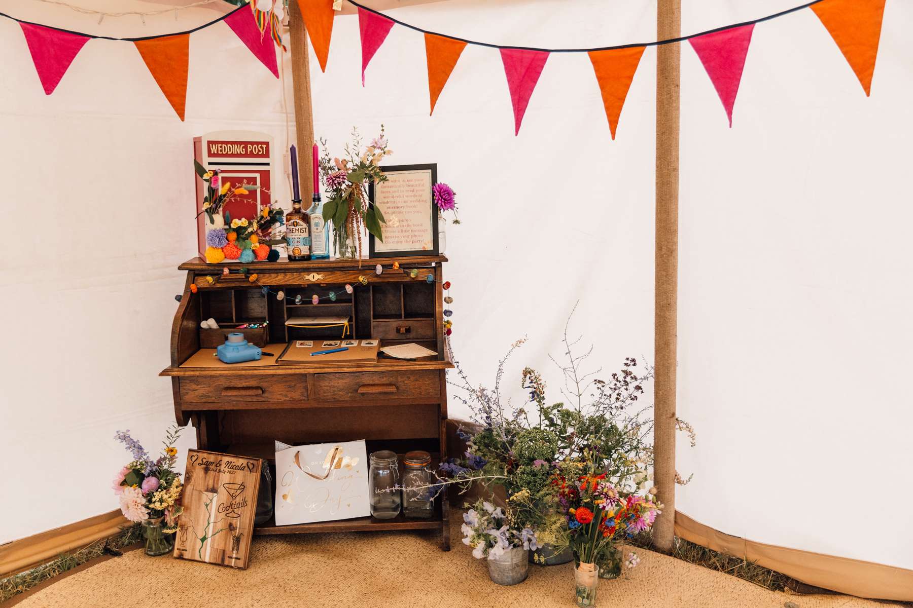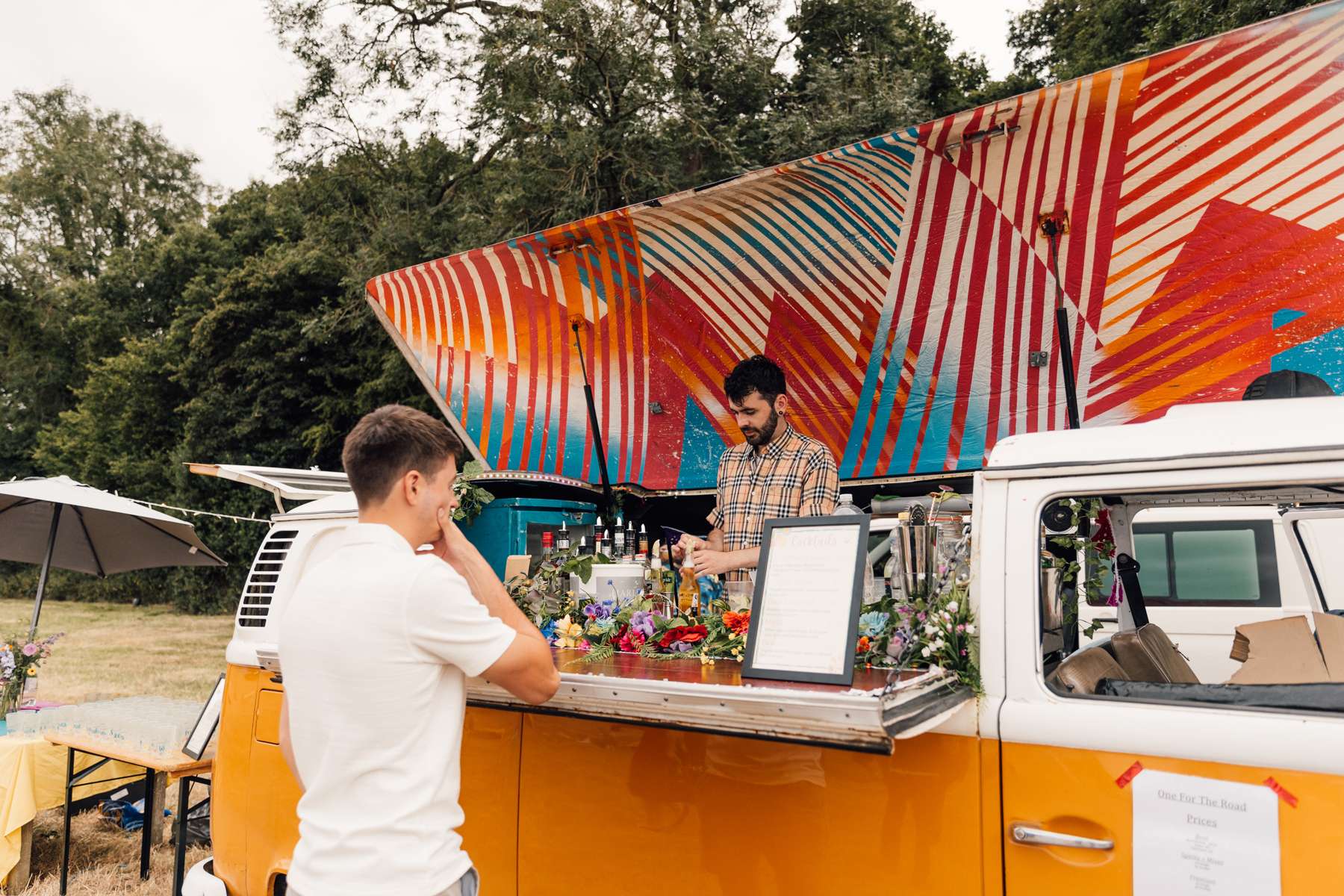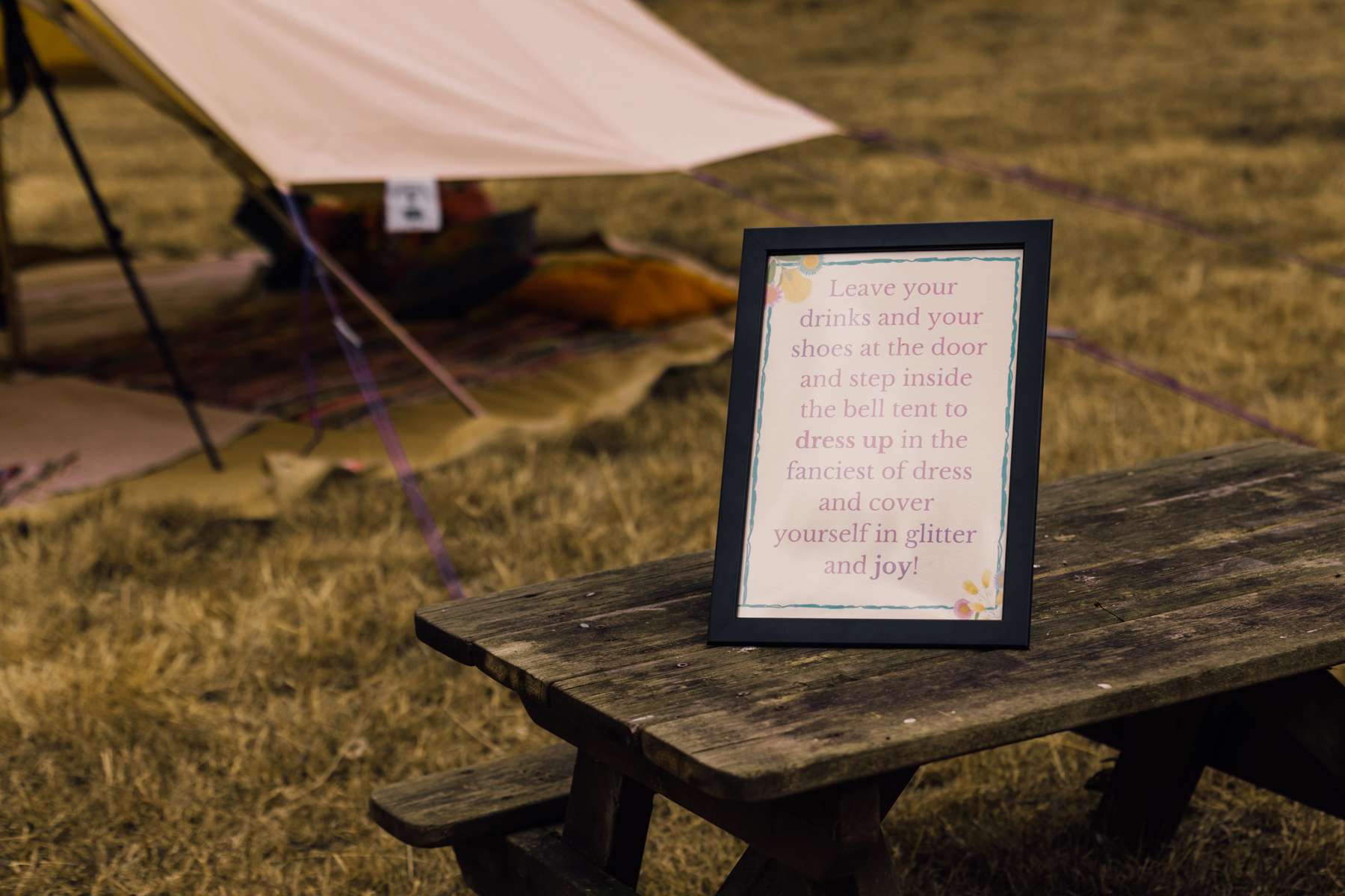 The reception was also full of incredible details, from a glitter station in the bell tent to a game of cornhole that Sam’s brother had made from scratch. The couple also had a 1970s VW campervan, converted into a cocktail van, serving drinks to add to that festival feel. “We had loads of games for people to play, amazing food served on sharing plates, and desserts served canape style so everyone could get up and chat and walk around,” said Nicola.