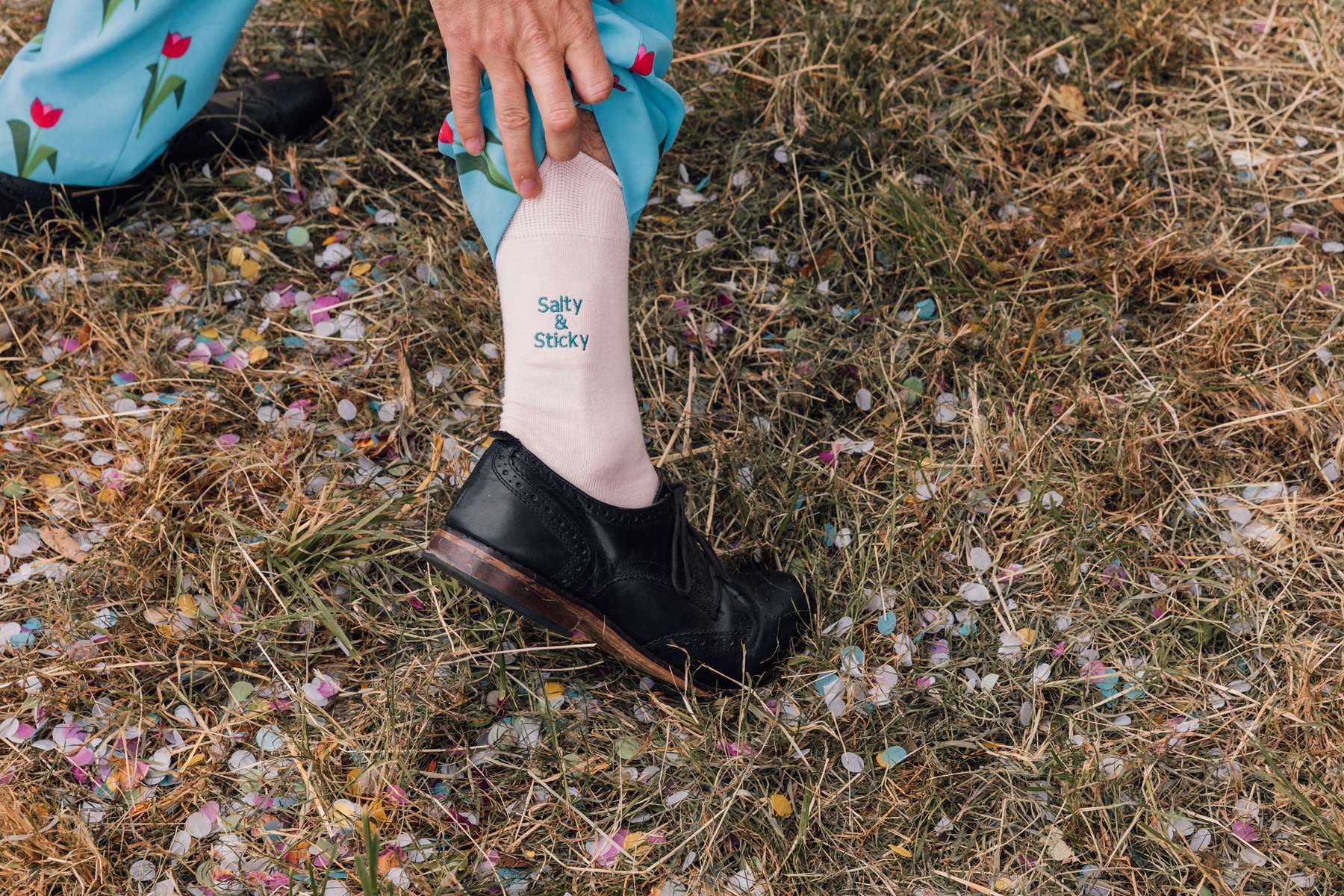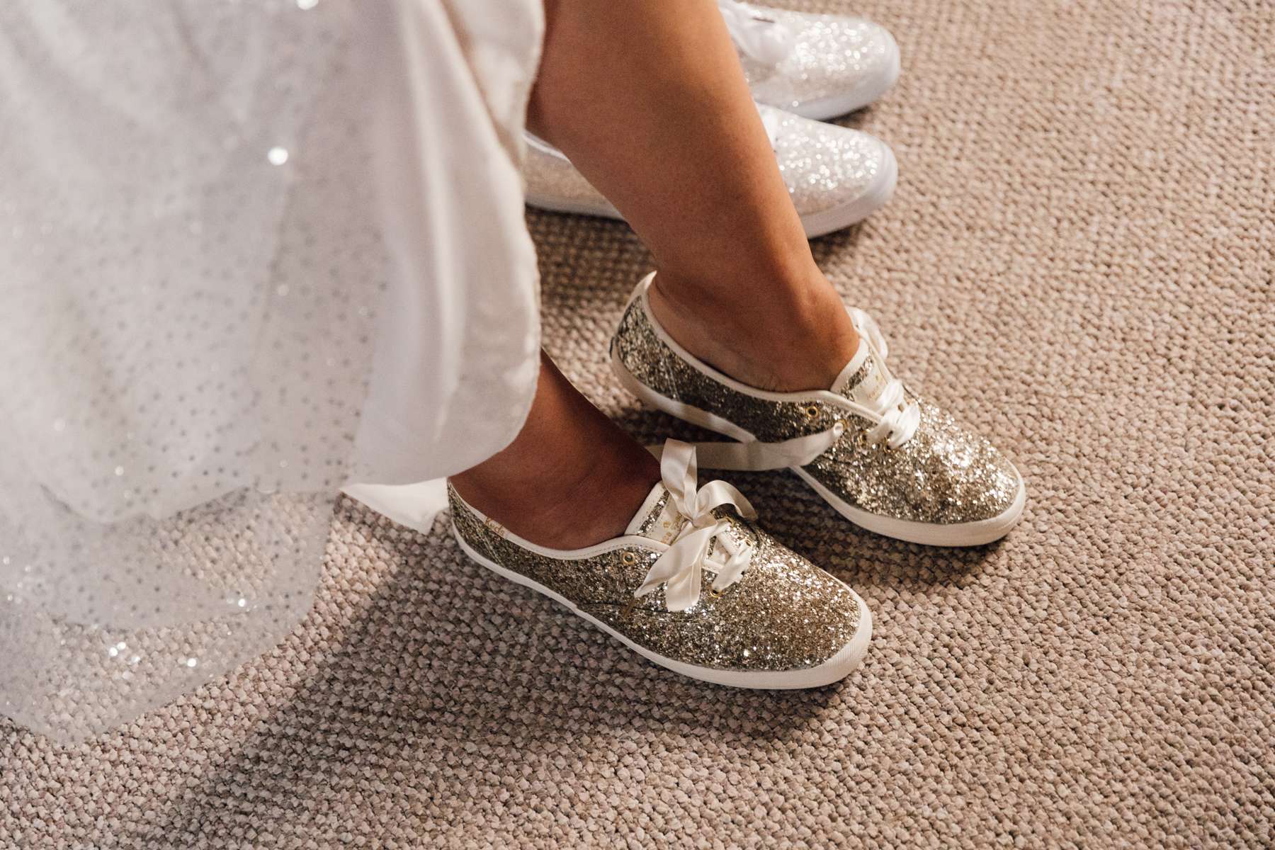 The bride also changed up her outfit in the evening, ready for our first dance. She’d had removable little sleeves added to her dress which she wore during the day and took those off for the evening. She then put on a full sequin overskirt on top of the skirt of my dress and changed into glittery Kate Spade x Toms trainers, “I wanted to be like a human disco ball bride!”, she said.