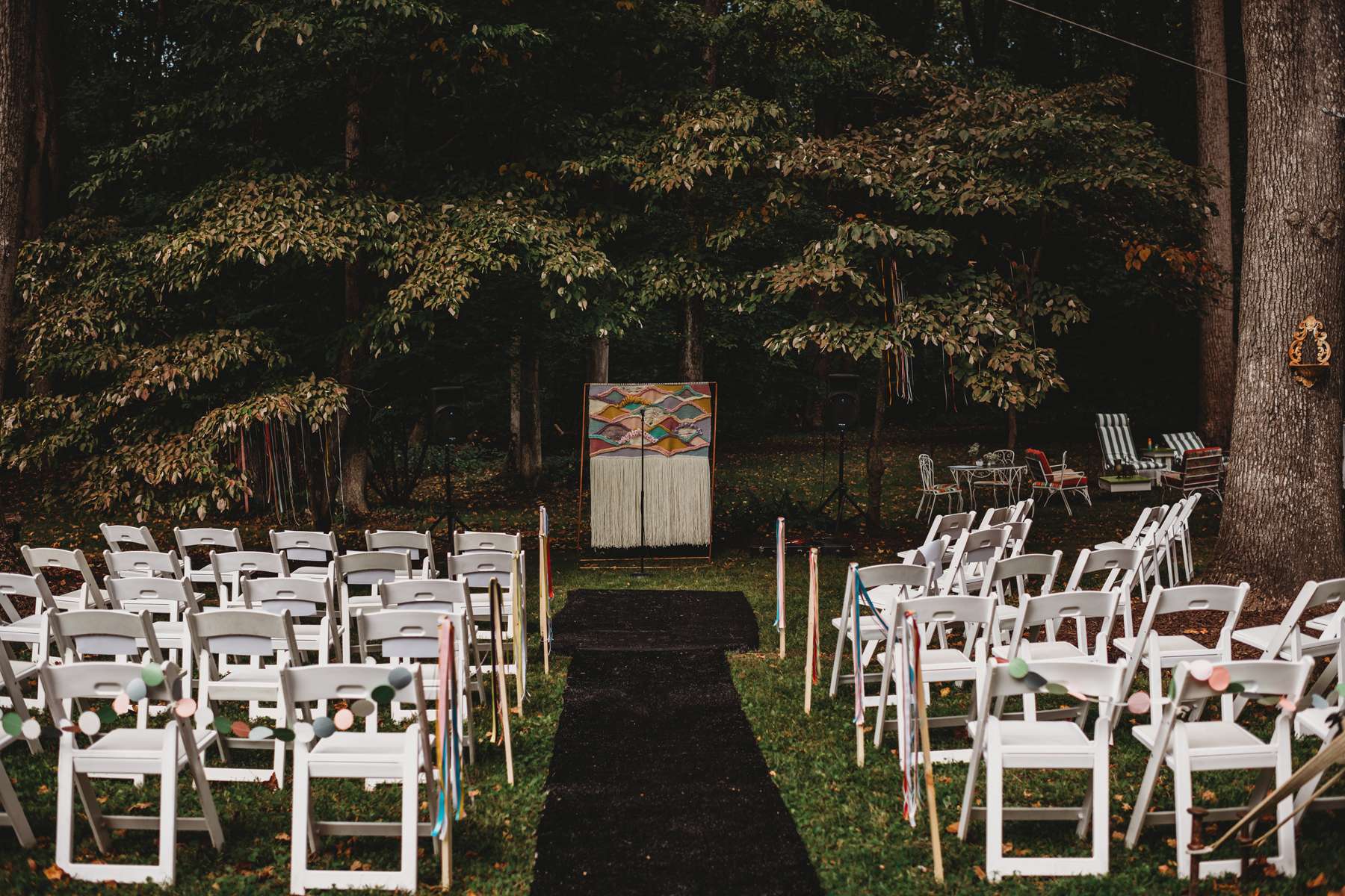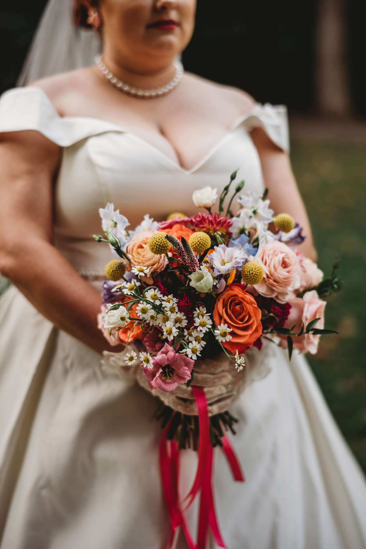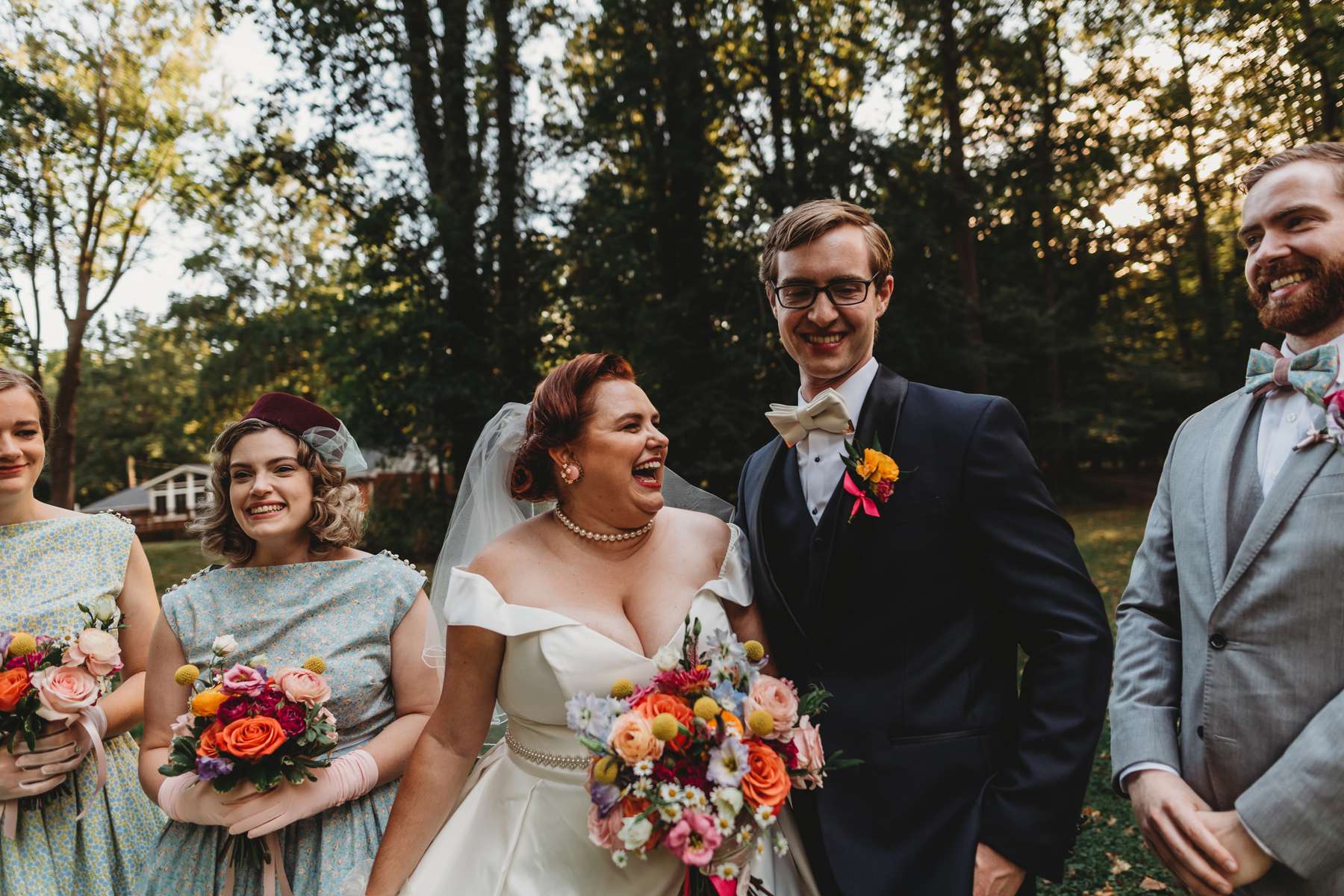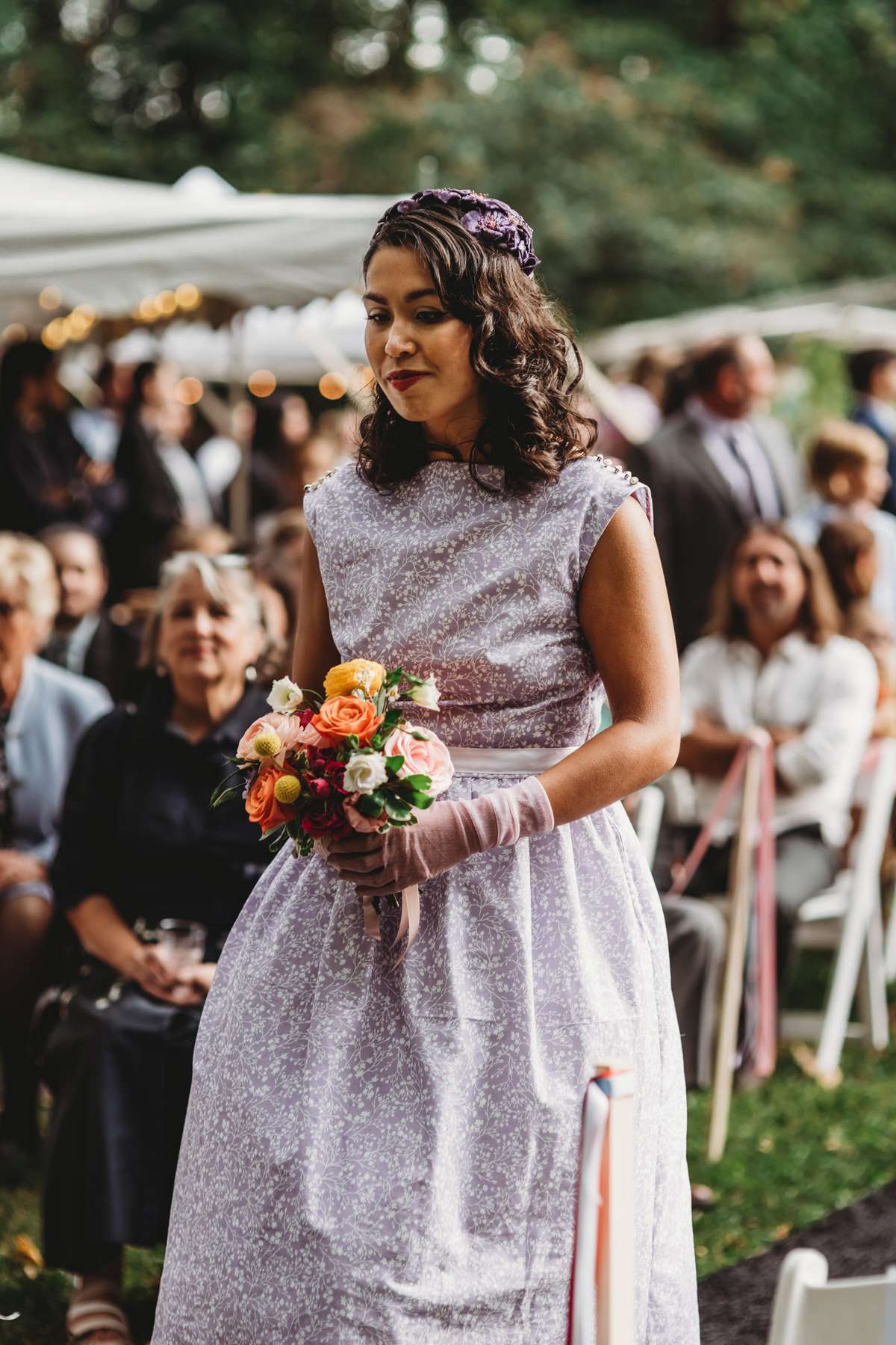 Andrew and Evelyn’s wedding in Bowie, Maryland, was a whimsical and enchanting affair that perfectly encapsulated their eclectic tastes and love for vibrant colours. Hosted in a friend’s back garden, with another friend officiating the ceremony and others helping with all the DIY, their day was a wonderful, creative collaboration which celebrated their love in a really special way.