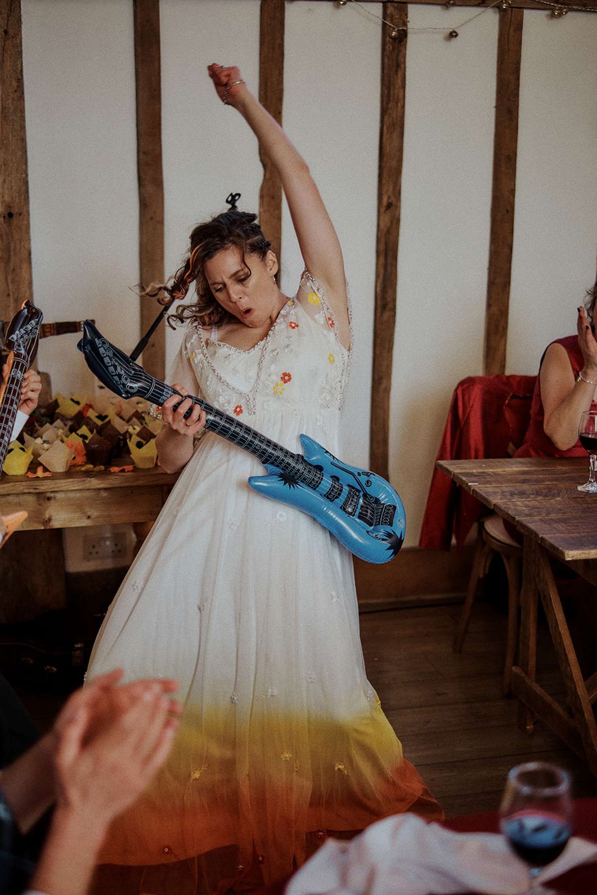 The reception was an absolute blast, with surprises at every turn. Axe throwing entertained guests during the photo session, and the singing waiters enlivened the wedding breakfast, prompting everyone to join in singing and conga lines. As evening descended, a live rock band took the stag – it was a celebration that never lost its momentum.